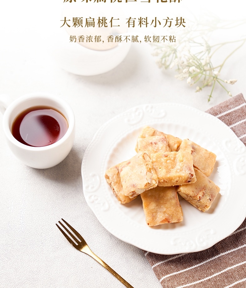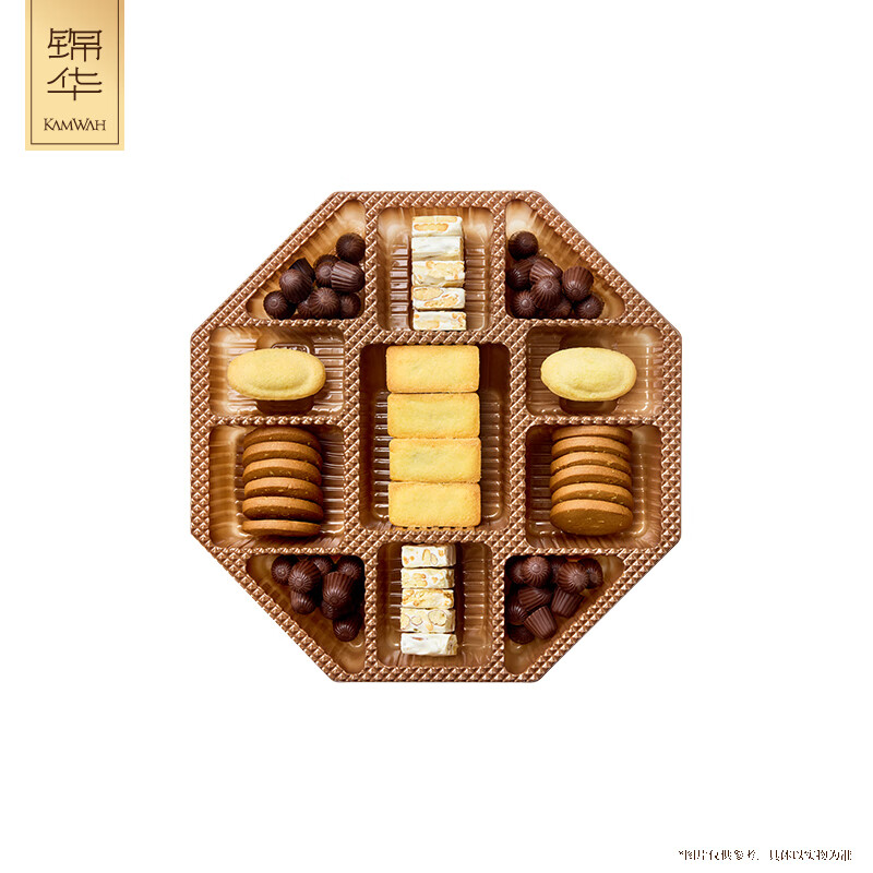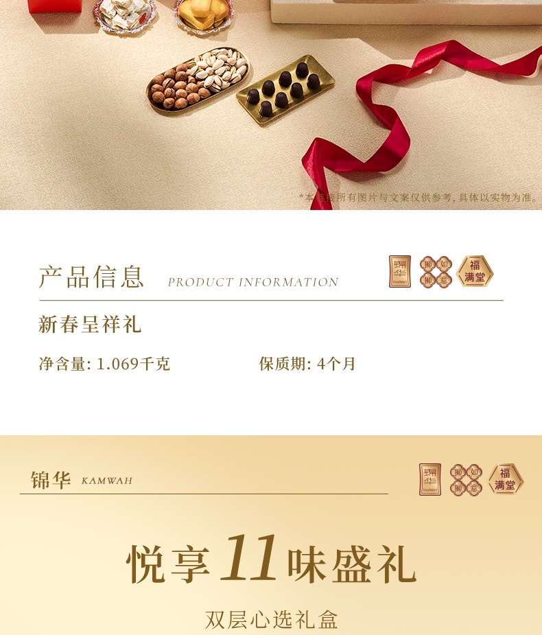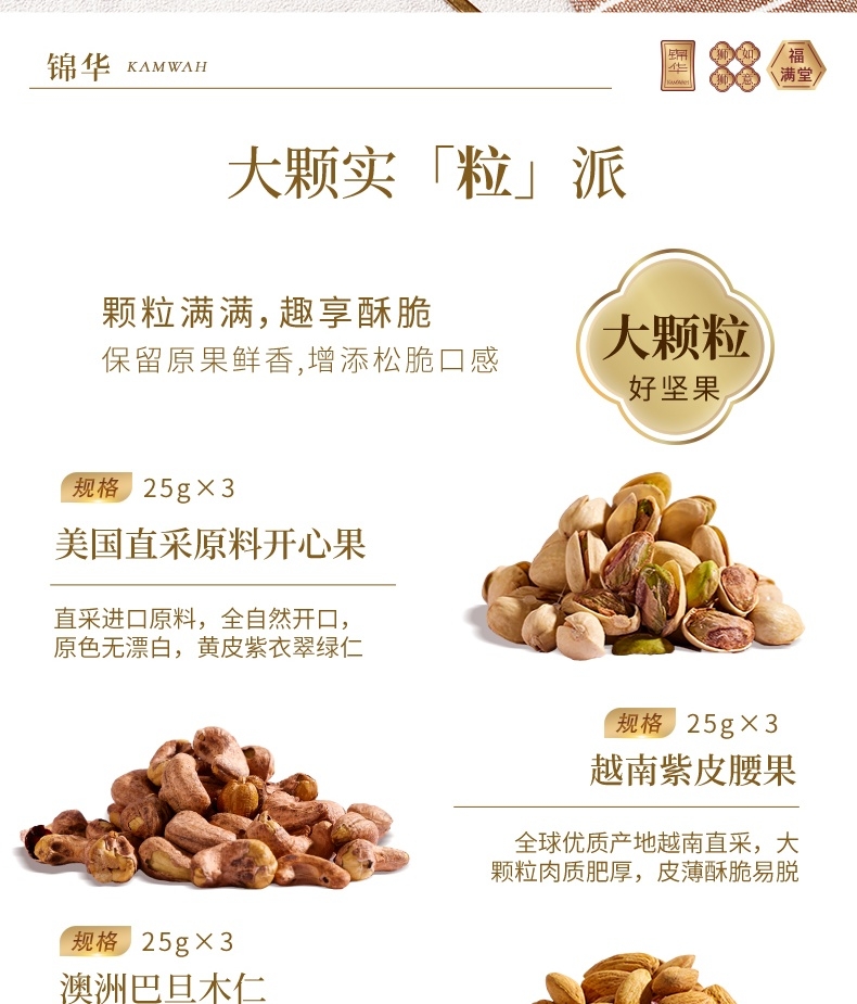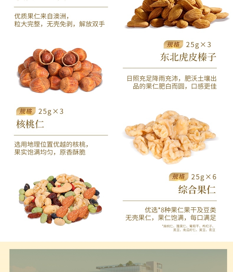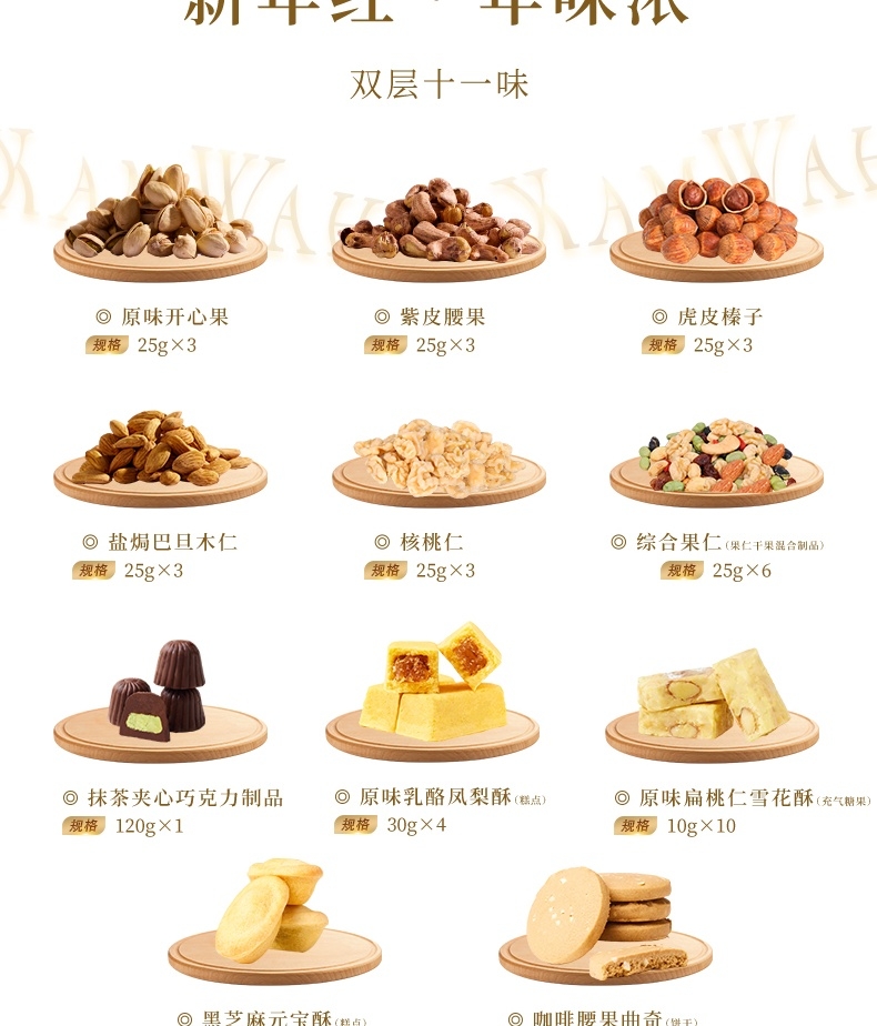 配置:上层 原味开心果25克x3 紫皮腰果25克x3 虎皮榛子25克x3 盐焗巴旦木仁25克x3 核桃仁25克x3 综合果仁25克x6 下层 抹茶夹心巧克力制品120克x1 原味扁桃仁雪花酥10克x10 黑芝麻元宝酥30克x2 原味乳酪凤梨酥30克x4 咖啡腰果曲奇12克x12