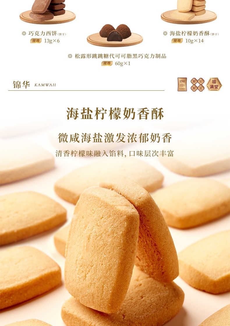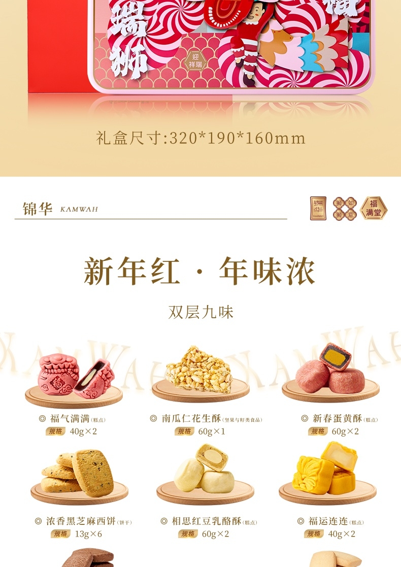 配置:上层 松露形跳跳糖代可可脂黑巧克力制品60克x1 南瓜仁花生酥60克x1 新春蛋黄酥60克x2 相思红豆乳酪酥60克x2 下层 福运连连40克x2 福气满满40克x2 浓香黑芝麻西饼13克x6 巧克力西饼13克x6 海盐柠檬奶香酥10克x14