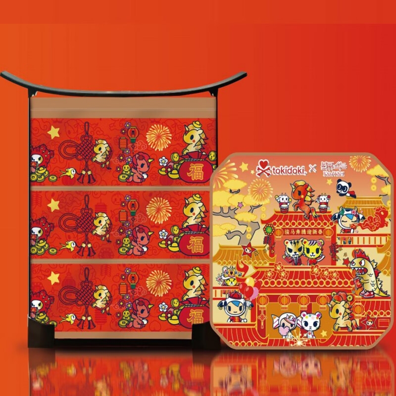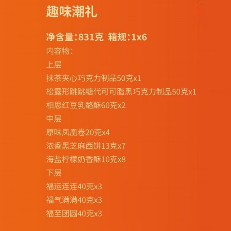 配置:上层 抹茶夹心巧克力制品50克x1 松露形跳跳糖代可可脂黑巧克力制品50克x1 相思红豆乳酪酥60克x2 中层 原味凤凰卷20克x4 浓香黑芝麻西饼13克x7 海盐柠檬奶香酥10克x8 下层 福运连连40克x3 福气满满40克x3 福至团圆40克x3