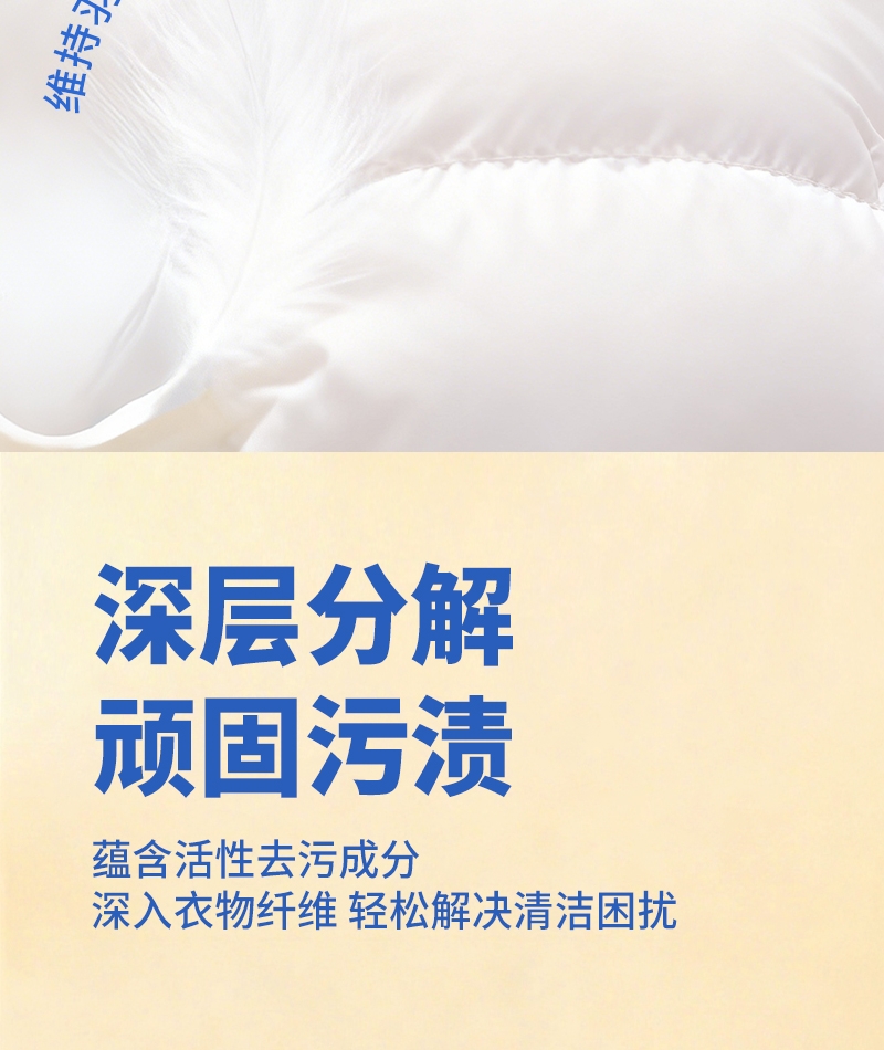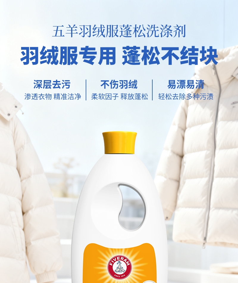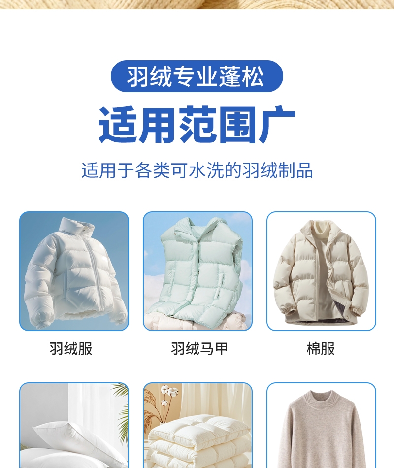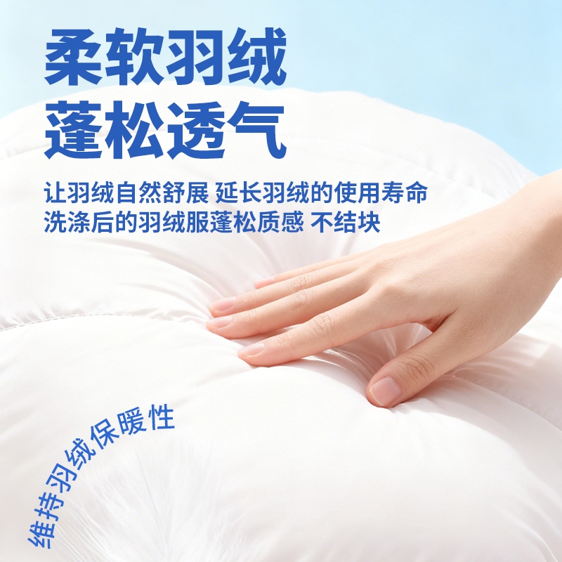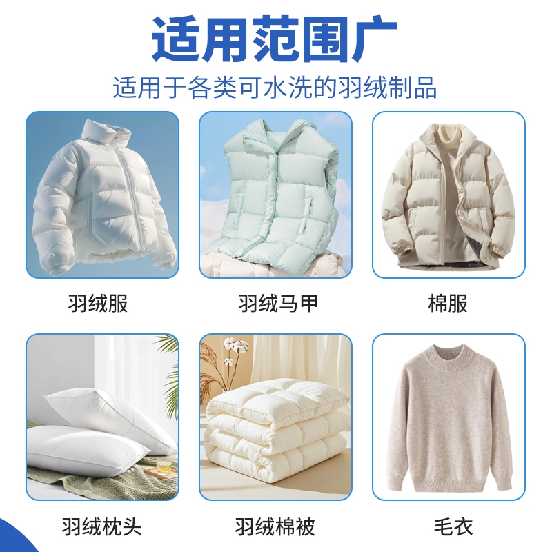 温和去污,不伤羽绒纤维,蓬松柔软,持续保暖;添加去污因子,泡沫绵密,分解带走污渍;适用于羽绒服,合成纤维,混纺,棉织衣物