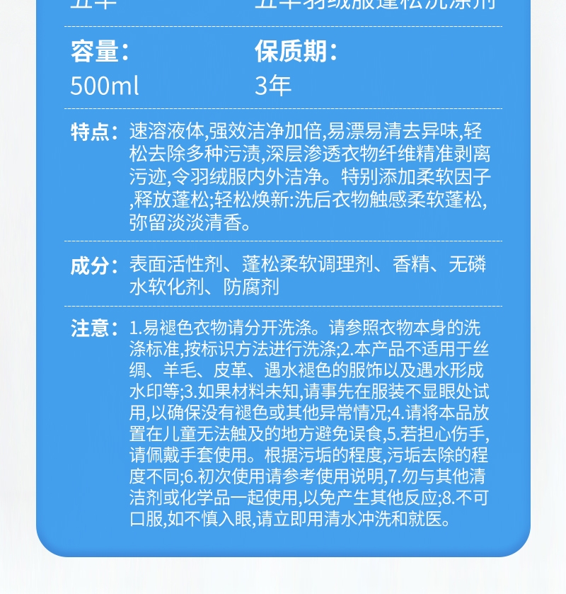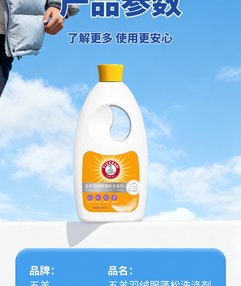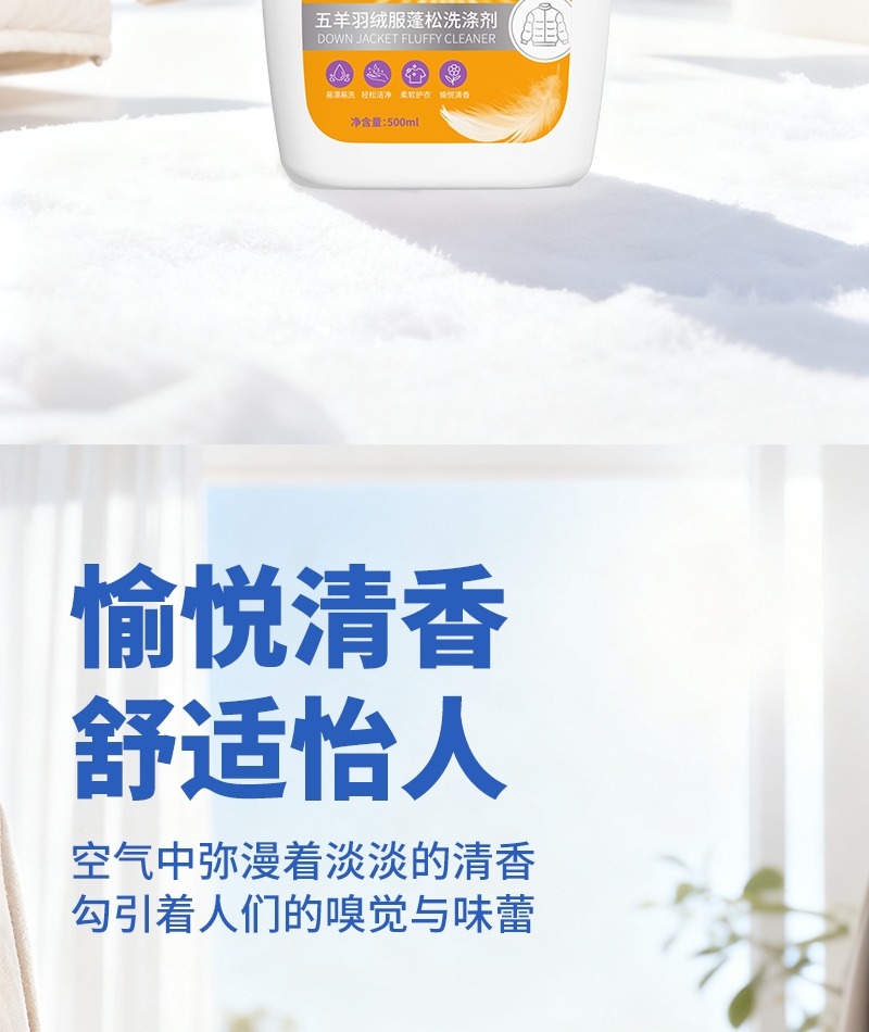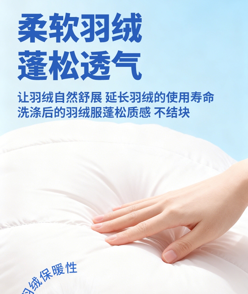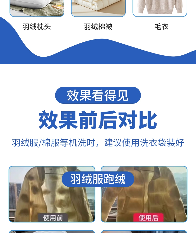 温和去污,不伤羽绒纤维,蓬松柔软,持续保暖;添加去污因子,泡沫绵密,分解带走污渍;适用于羽绒服,合成纤维,混纺,棉织衣物