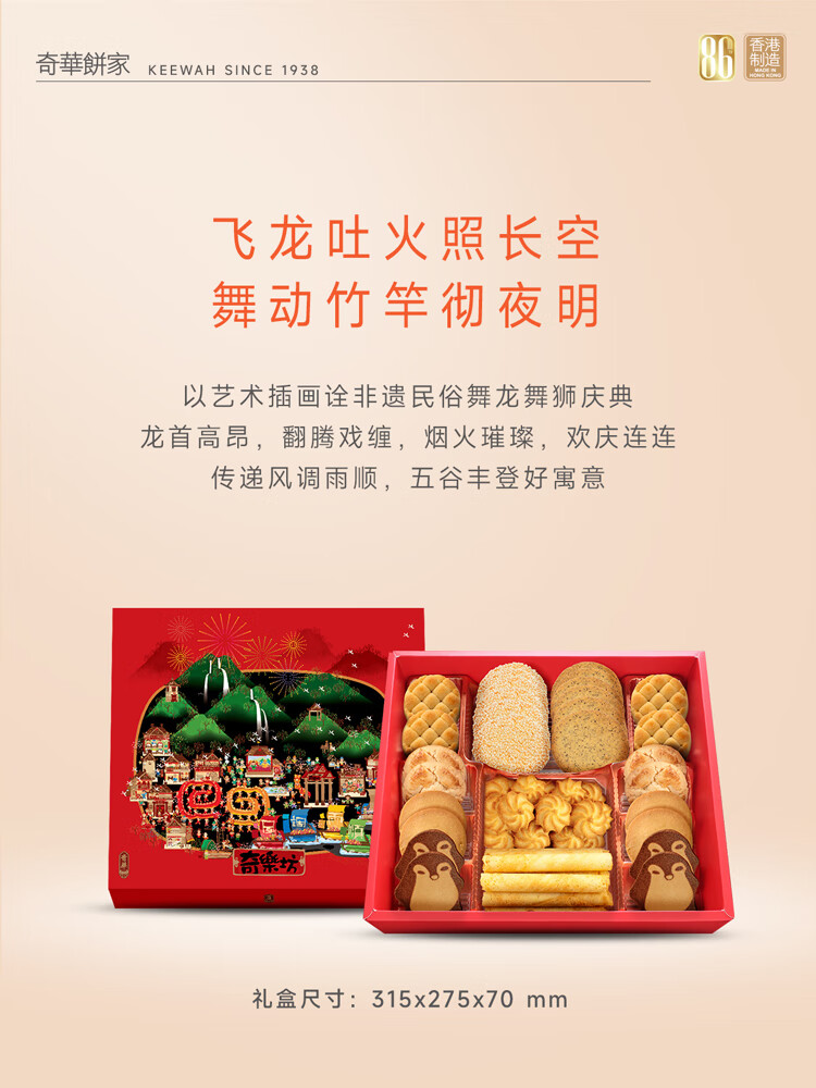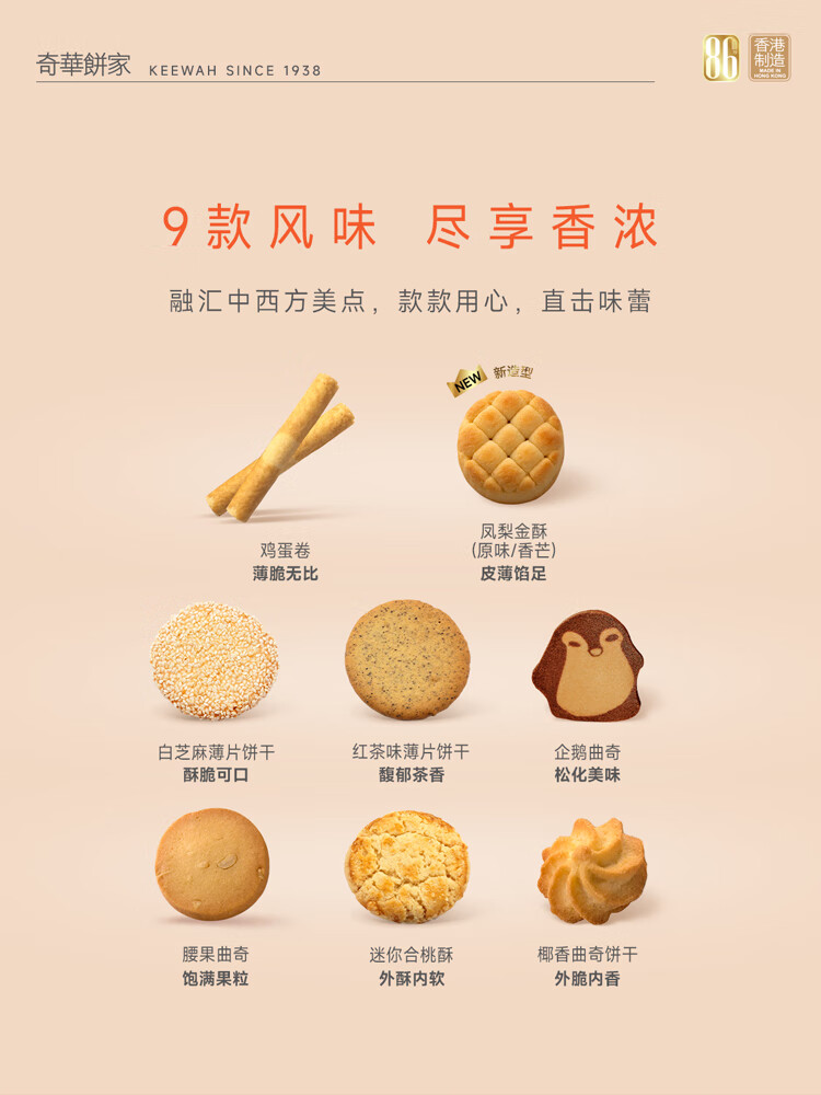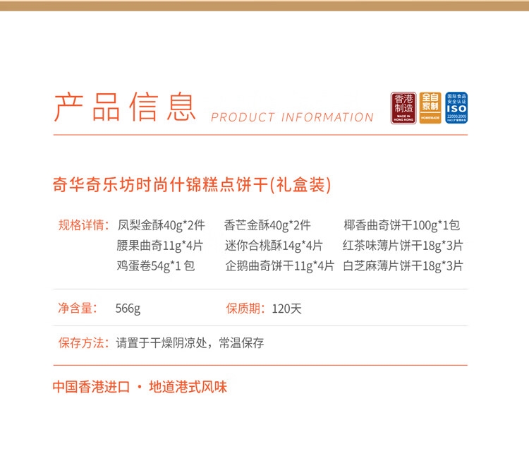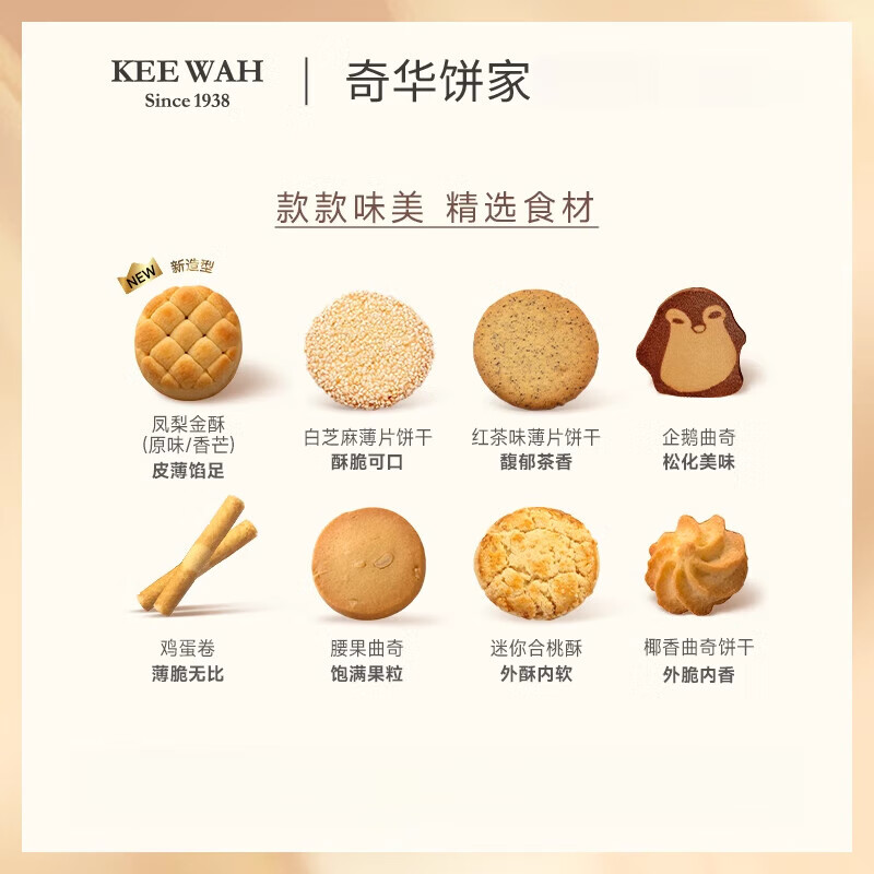 配置:凤梨金酥50g*2件香芒金酥50g*2件椰香曲奇饼干100g*1包腰果曲奇11g*4片迷你合桃酥14g*4片红茶味薄片饼干18g*3片企鹅曲奇饼干11g*4片 白芝麻薄片饼干18g*3片 鸡蛋卷54g*1包