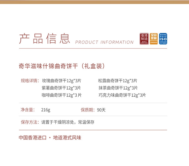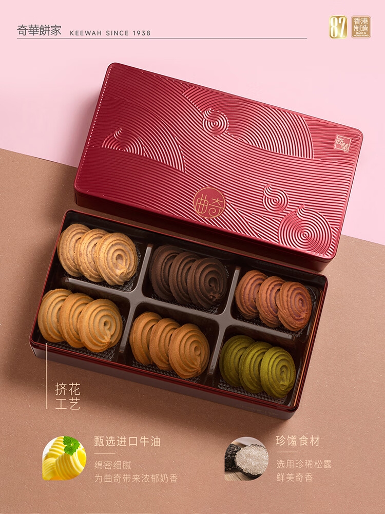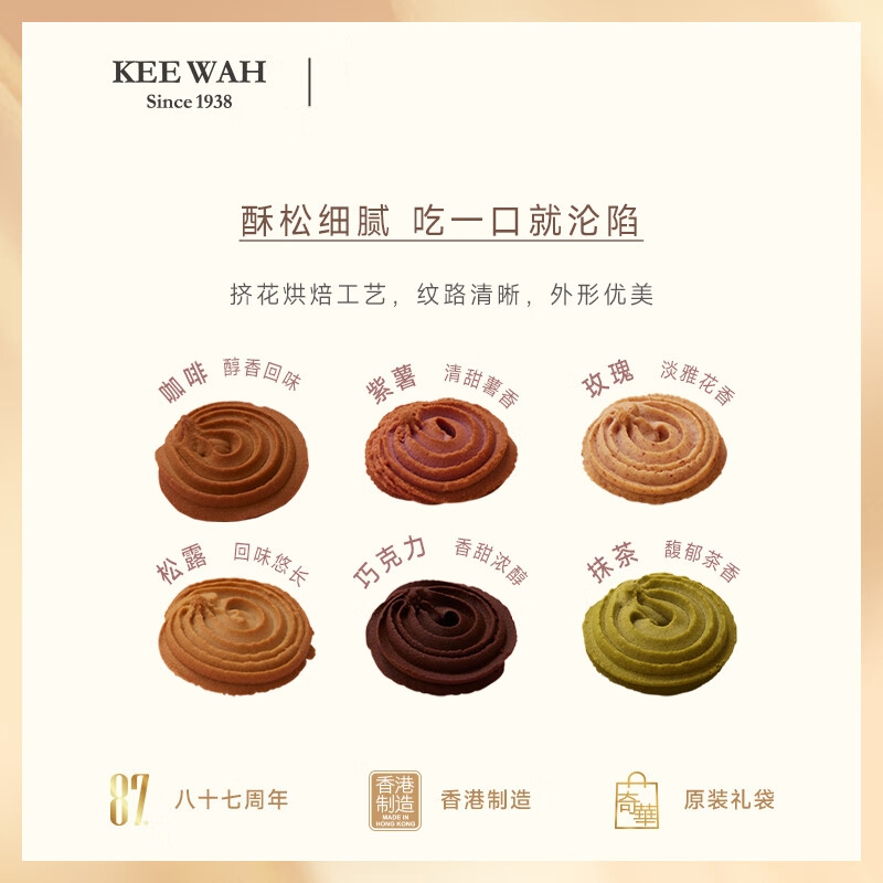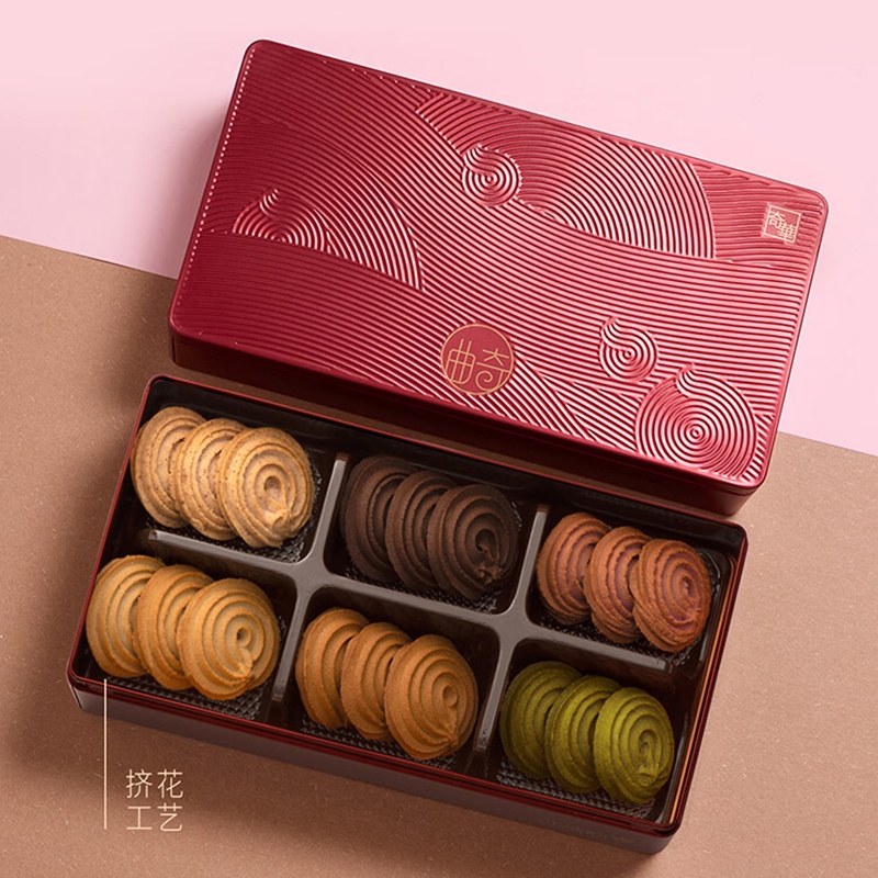 配置:玫瑰曲奇饼干12g*3片紫薯曲奇饼干12g*3片 咖啡曲奇饼干12g*3片 松露曲奇饼干12g*3片抹茶曲奇饼干12g*3片 巧克力味曲奇饼干12g*3片