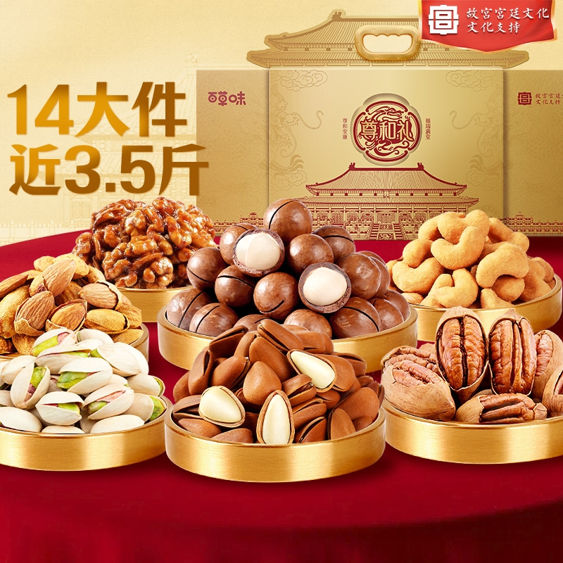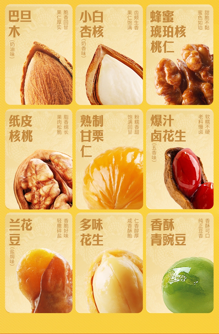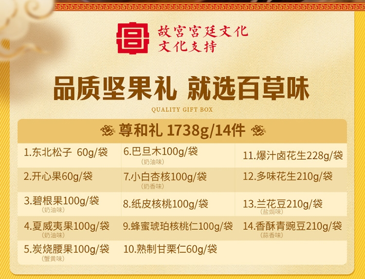 - 配置:【百草味】东北松子 60g 【百草味】开心果 60g 【百草味】炭烧腰果(蟹黄味)100g 【百草味】碧根果(奶油味) 100g 【百草味】夏威夷果(奶油味) 100g 【百草味】巴旦木(奶油味)100g 【百草味】小白杏核(奶香味)100g 【百草味】纸皮核桃 100g 【百草味】蜂蜜琥珀核桃仁 100g 【百草味】熟制板栗仁 60g 【百草味】爆汁卤花生(五香味)228g 【百草味】多味花生 210g 【百草味】兰花豆(盐焗味)210g 【百草味】香酥小豌豆(蒜香味) 210g