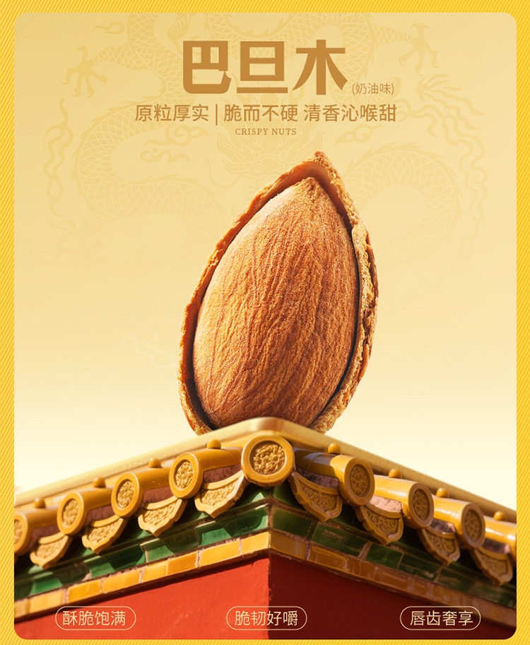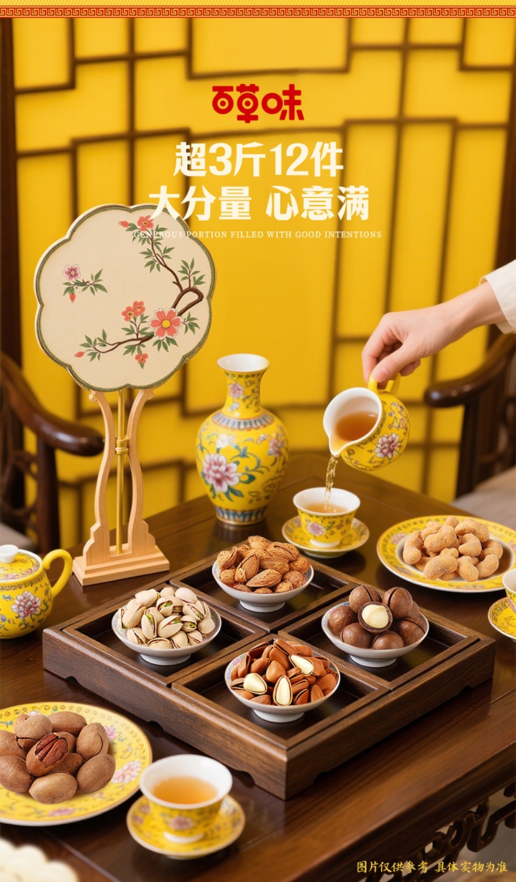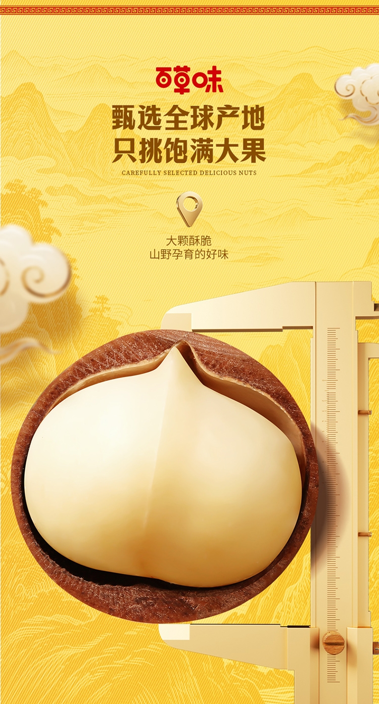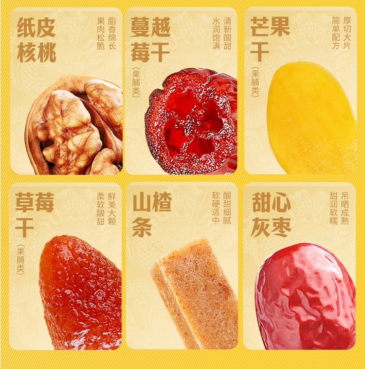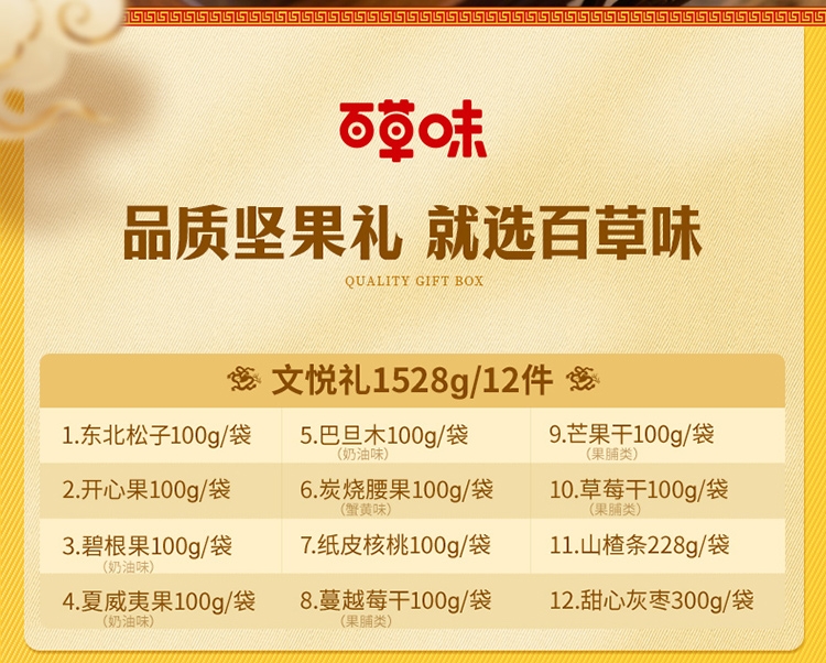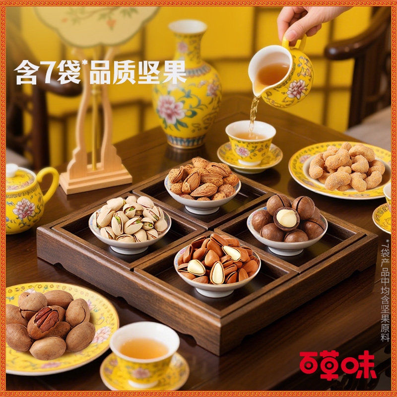 - 配置:【百草味】东北松子 100g 【百草味】开心果 100g 【百草味】碧根果(奶油味) 100g 【百草味】夏威夷果(奶油味) 100g 【百草味】巴旦木(奶油味)100g 【百草味】炭烧腰果(蟹黄味)100g 【百草味】纸皮核桃 100g(G红版) 【百草味】蔓越莓干 100g 【百草味】芒果干 100g 【百草味】草莓干 100g 【百草味】山楂条228g 【百草味】甜心灰枣 300g