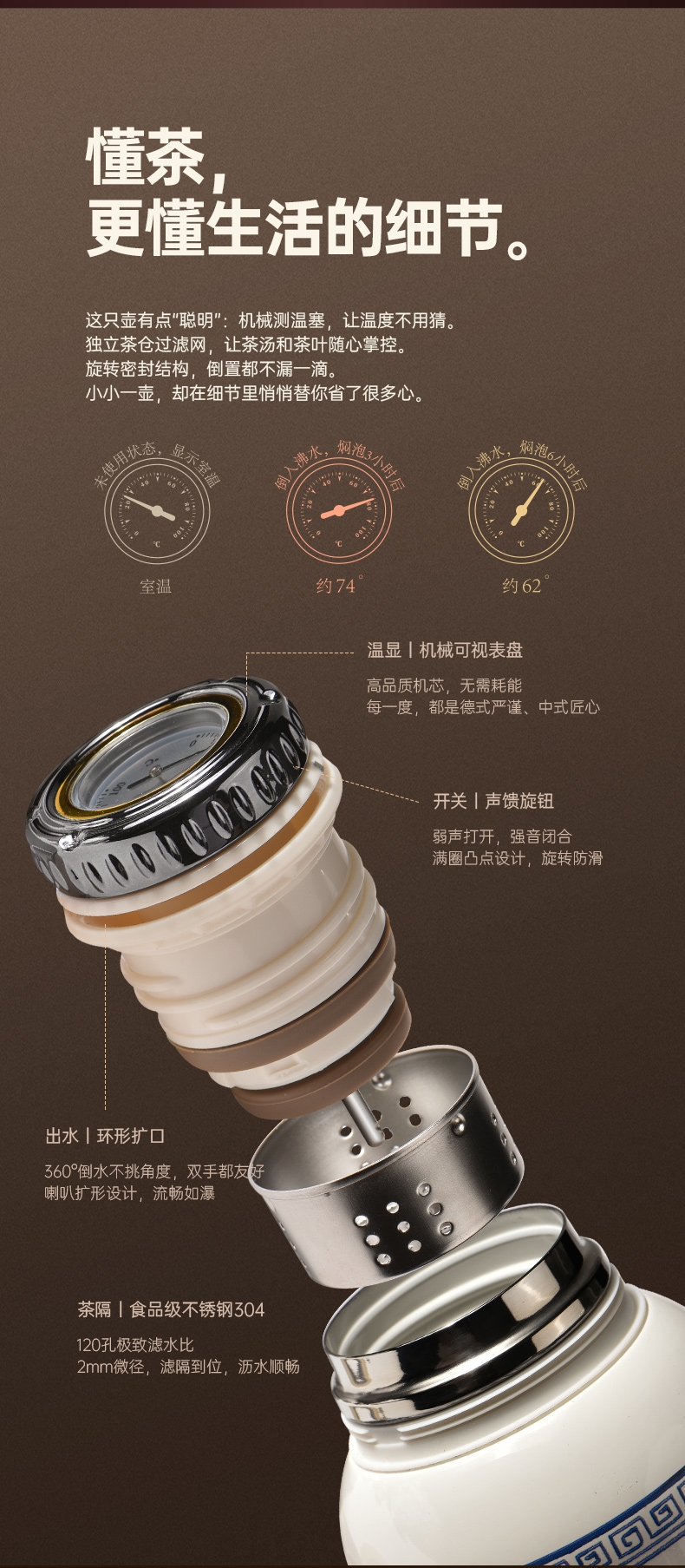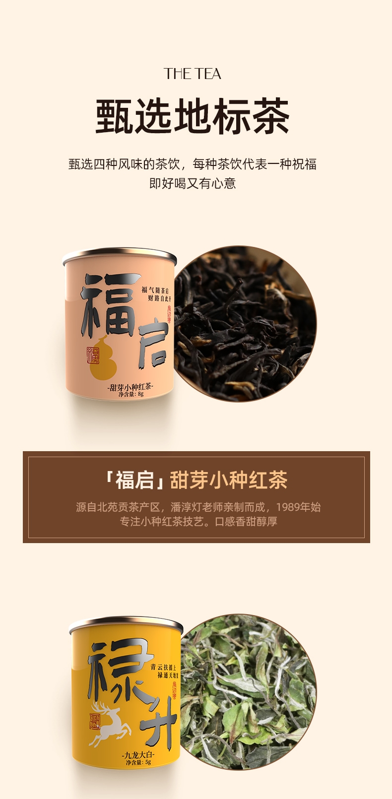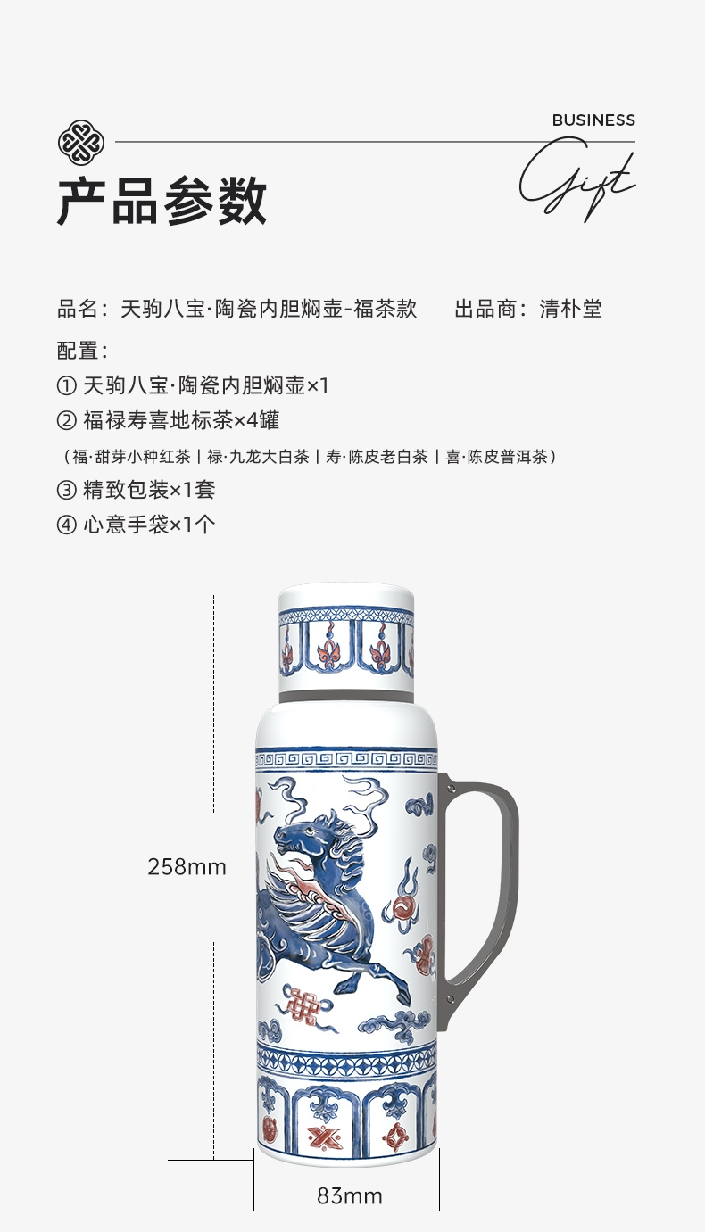 配置:① 天驹八宝·陶瓷内胆焖壶×1(820ml) ② 福禄寿喜地标茶×4罐 (福·甜芽小种红茶8g丨禄·九龙大白茶5g丨寿·陈皮老白茶5g丨喜·陈皮普洱茶8g) ③ 精裱包装盒×1个 ④ 心意手袋×1个