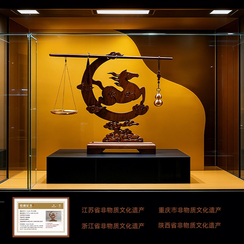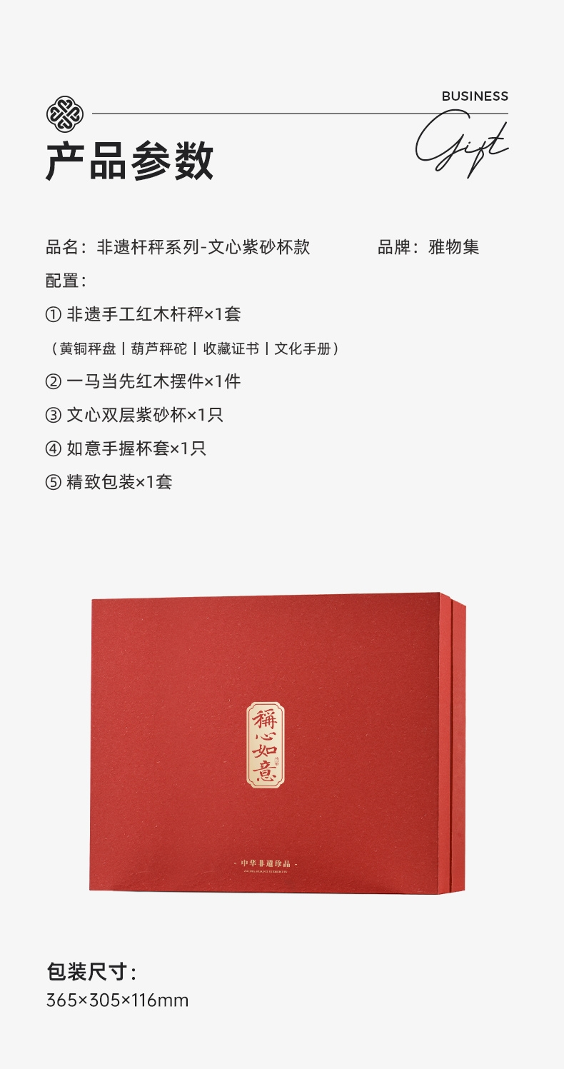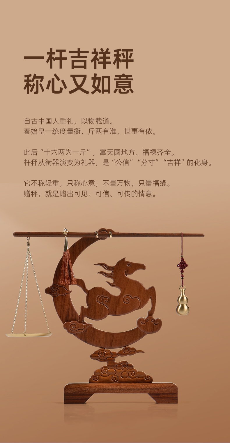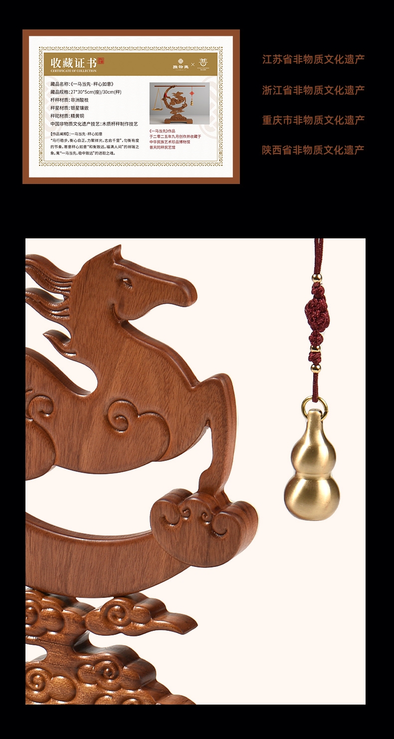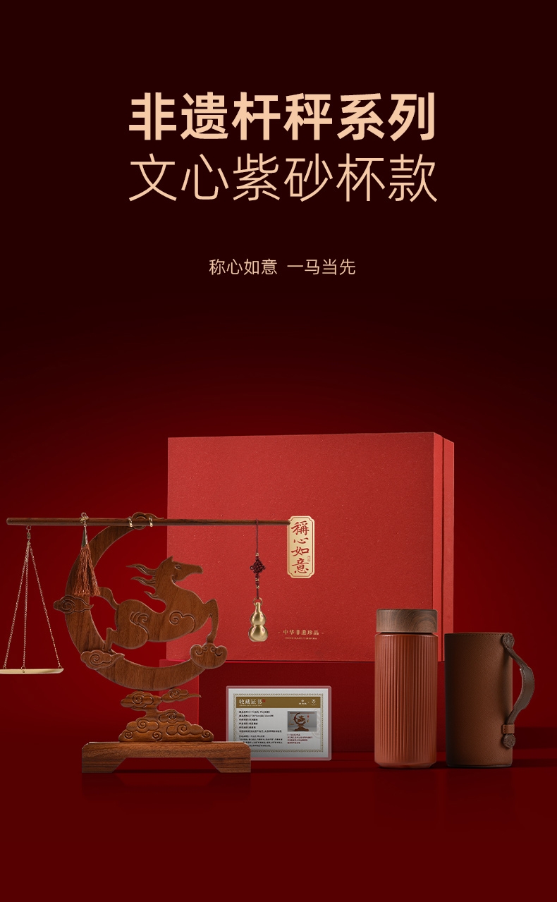 配置:① 非遗手工红木杆秤×1套 (黄铜秤盘丨葫芦秤砣丨收藏证书丨文化手册) ② 一马当先红木摆件×1件 ③ 文心双层紫砂杯×1只 ④ 如意手握杯套×1只 ⑤ 精致包装×1套