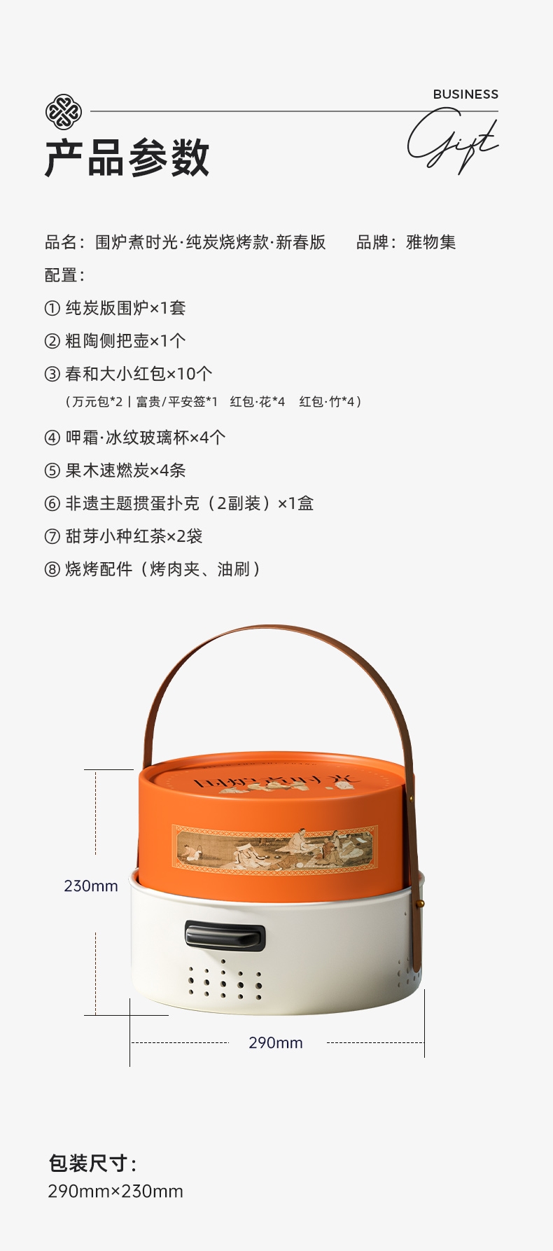 配置:纯炭版围炉×1 粗陶侧把壶×1 呷霜·冰纹玻璃杯×4 春和大小红包×10 果木速燃炭×4 甜芽小种红茶×2