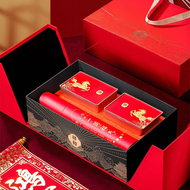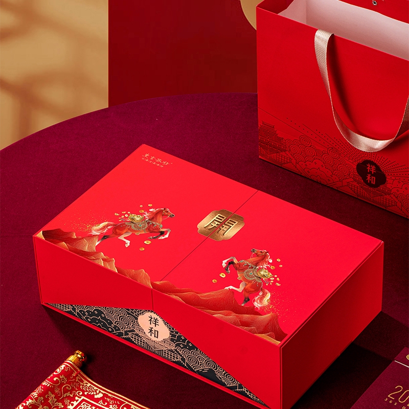 配置清单:手提袋*1、礼盒*1、春节福桶(对联1副、红包6个、福字一张、窗花2张)