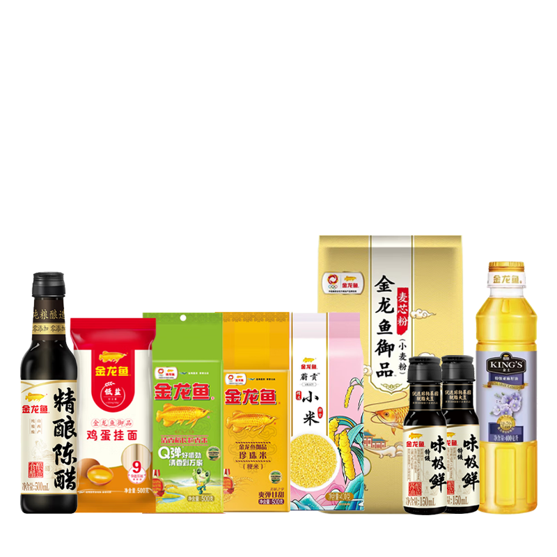 内配:金龙鱼亚麻籽油400ml 金龙鱼蔚贡小米400g 金龙鱼御品珍珠米500g 金龙鱼清香稻长粒香大米500g 金龙鱼御品麦芯粉1kg 金龙鱼精酿陈醋500ml 金龙鱼特级味极鲜酱油150ml*2 金龙鱼御品鸡蛋挂面500g