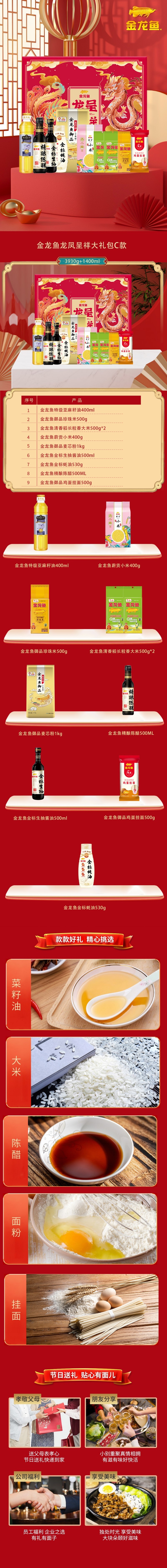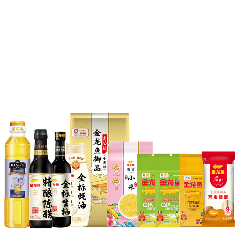 内配:金龙鱼亚麻籽油400ml 金龙鱼御品珍珠米500g 金龙鱼清香稻长粒香大米500g*2 金龙鱼蔚贡小米400g 金龙鱼御品麦芯粉1kg 金龙鱼金标生抽酱油500ml 金龙鱼金标蚝油530g 金龙鱼精酿陈醋500ml 金龙鱼御品鸡蛋挂面500g