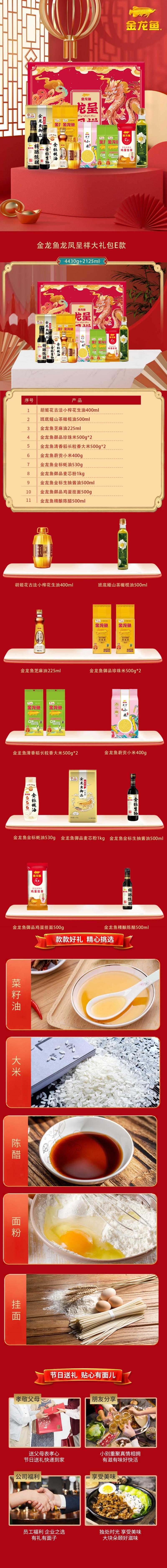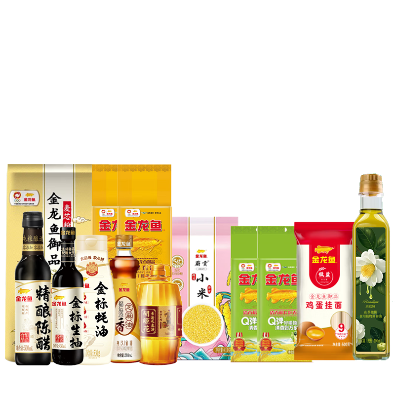 内配:胡姬花古法小榨花生油400ml 班底娅山茶橄榄油500ml 金龙鱼芝麻油225ml 金龙鱼御品珍珠米500g*2 金龙鱼清香稻长粒香大米500g*2 金龙鱼蔚贡小米400g 金龙鱼金标蚝油530g 金龙鱼御品麦芯粉1kg 金龙鱼金标生抽酱油500ml 金龙鱼御品鸡蛋挂面500g 金龙鱼精酿陈醋500ml