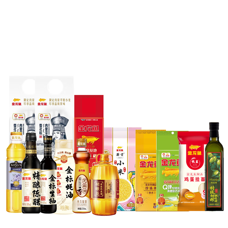 内配:胡姬花古法小榨花生油400ml 班底娅西班牙特级橄榄油500ml 金龙鱼亚麻籽油400ml 金龙鱼原香稻稻花香大米500g 金龙鱼御品珍珠米500g 金龙鱼清香稻长粒香大米500g 金龙鱼芝麻油225ml 金龙鱼蔚贡小米400g 金龙鱼金标蚝油530g 金龙鱼金标生抽酱油500ml 金龙鱼河套平原雪花粉500g*2 金龙鱼精酿陈醋500ml 金龙鱼御品鸡蛋挂面500g