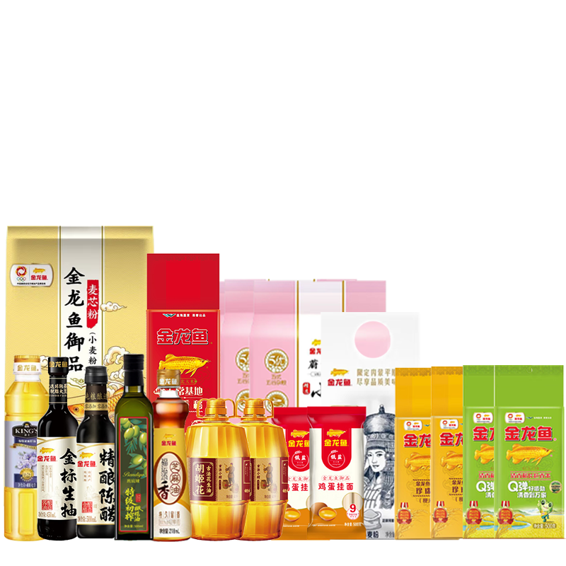 内配:胡姬花古法小榨花生油400ml*2 班底娅西班牙特级橄榄油500ml 金龙鱼芝麻油225ml 金龙鱼亚麻籽油400ml 金龙鱼原香稻稻花香大米500g*2 金龙鱼御品珍珠米500g*2 金龙鱼清香稻长粒香大米500g*2 金龙鱼河套平原雪花粉500g 金龙鱼蔚贡小米400g*3 金龙鱼金标生抽酱油500ml 金龙鱼精酿陈醋500ml 金龙鱼御品鸡蛋挂面500g*2