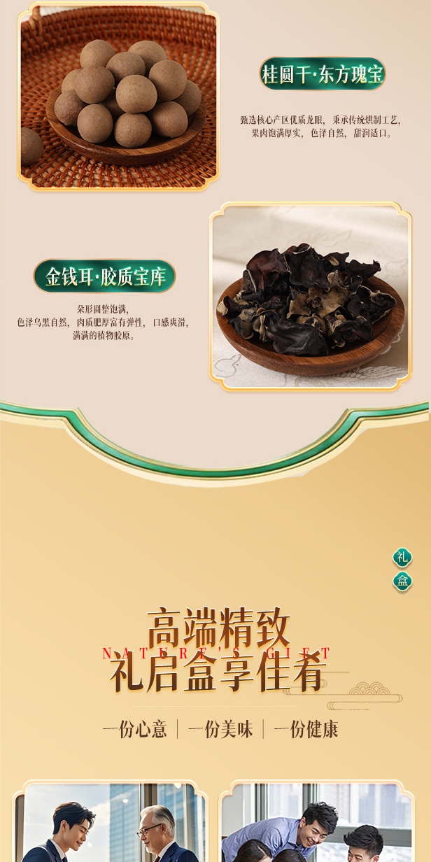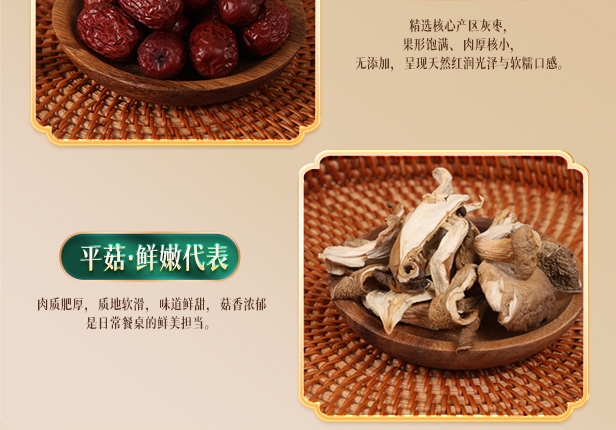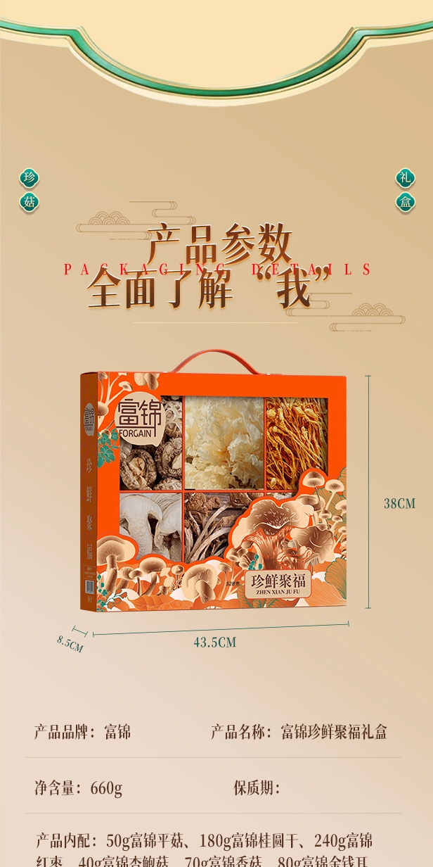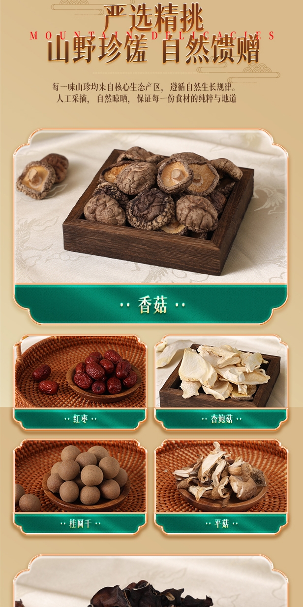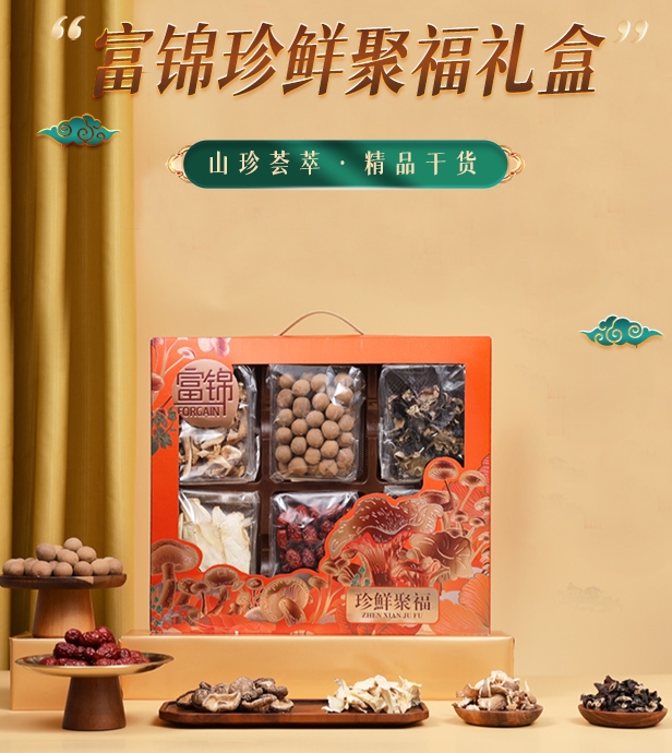 配置:70g富锦香菇 40g富锦杏鲍菇 50g富锦平菇 80g富锦金钱耳 180g富锦桂圆干 240g富锦红枣