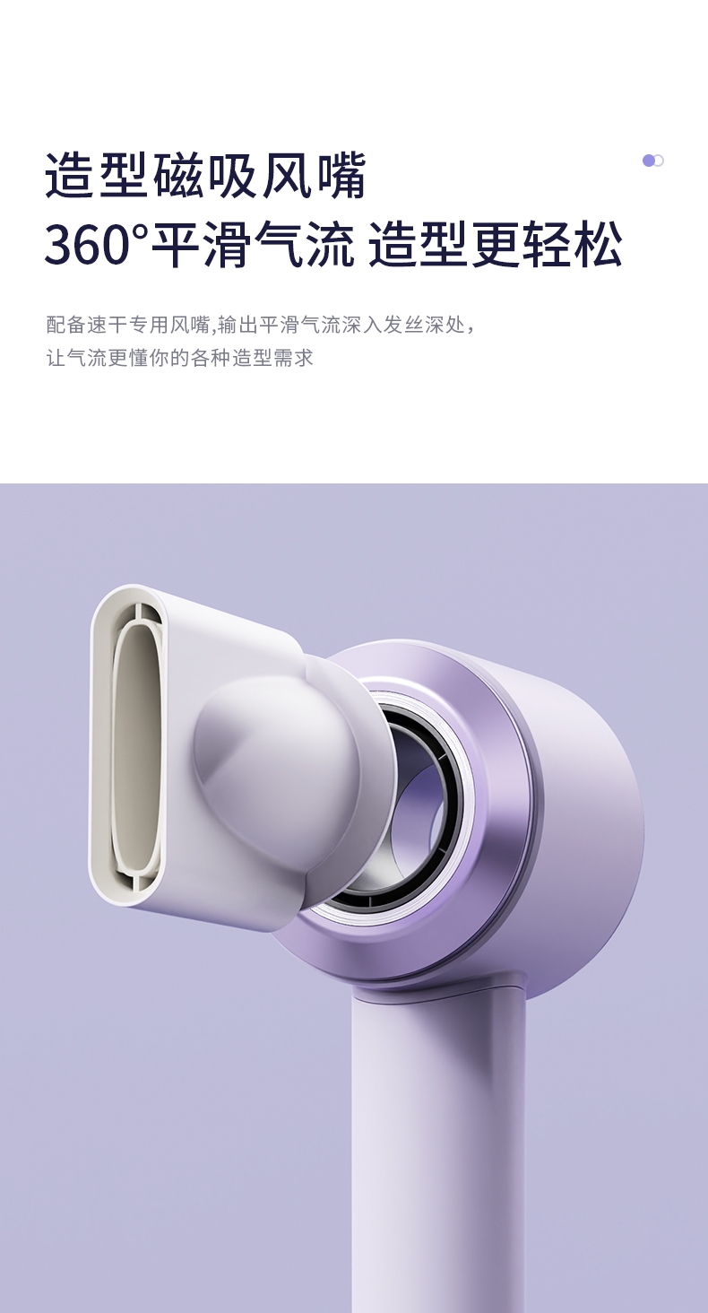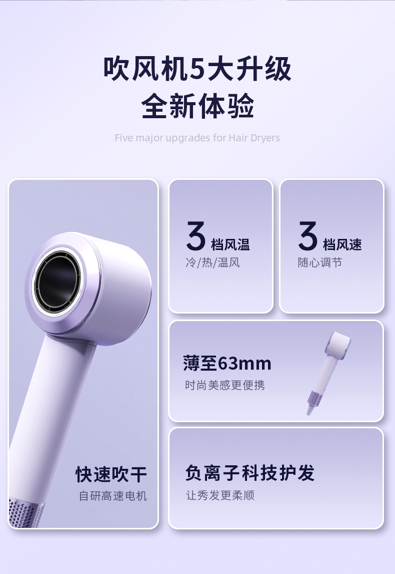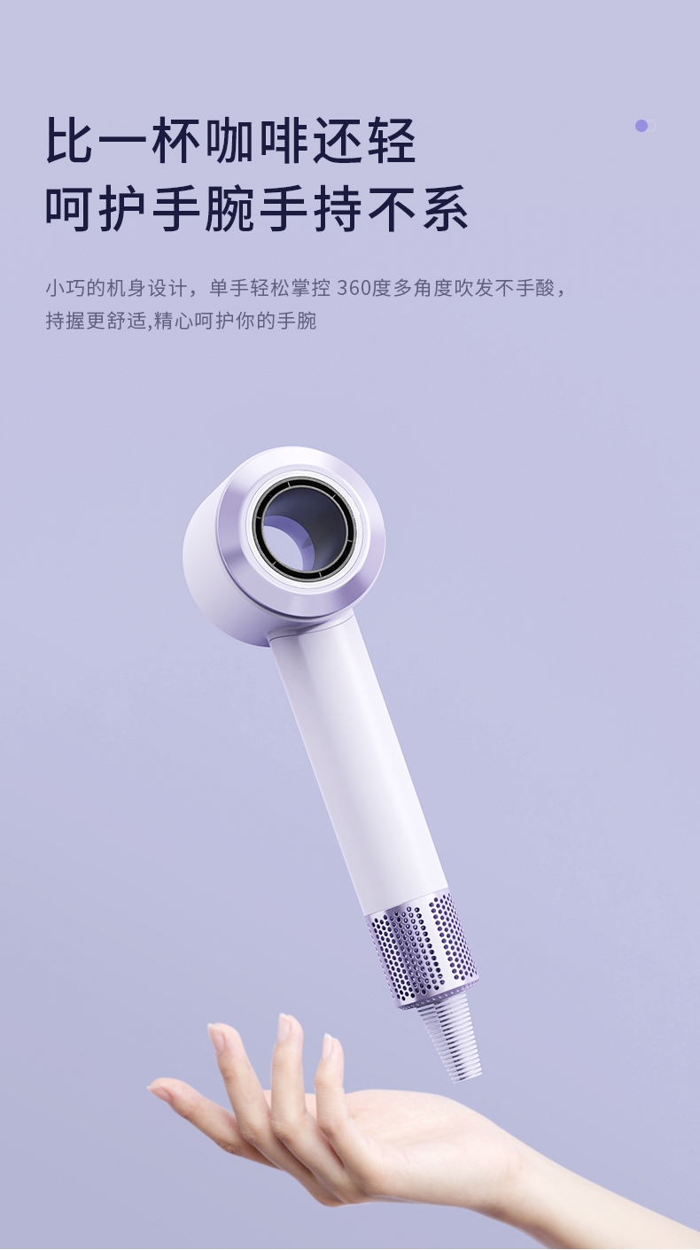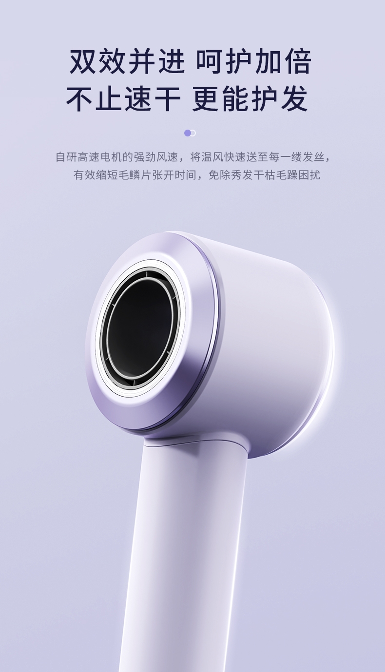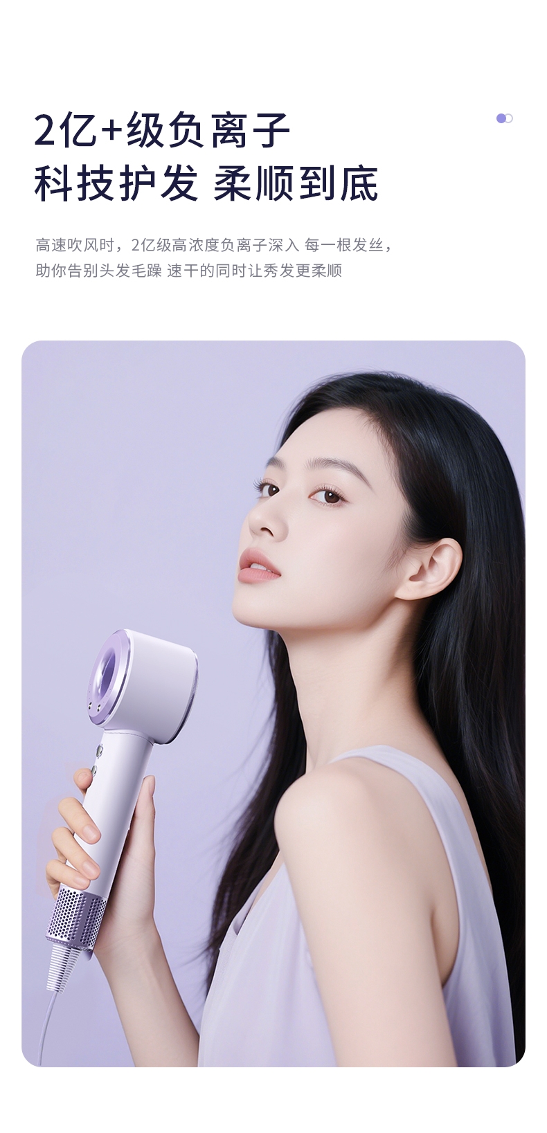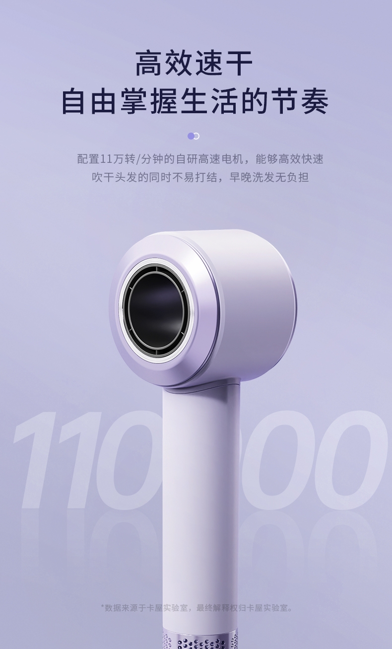 高效吹干 轻巧便携 多重降噪;配置11万转/分钟的自研高速电机;2亿+级负离子科技护发 柔顺到底
