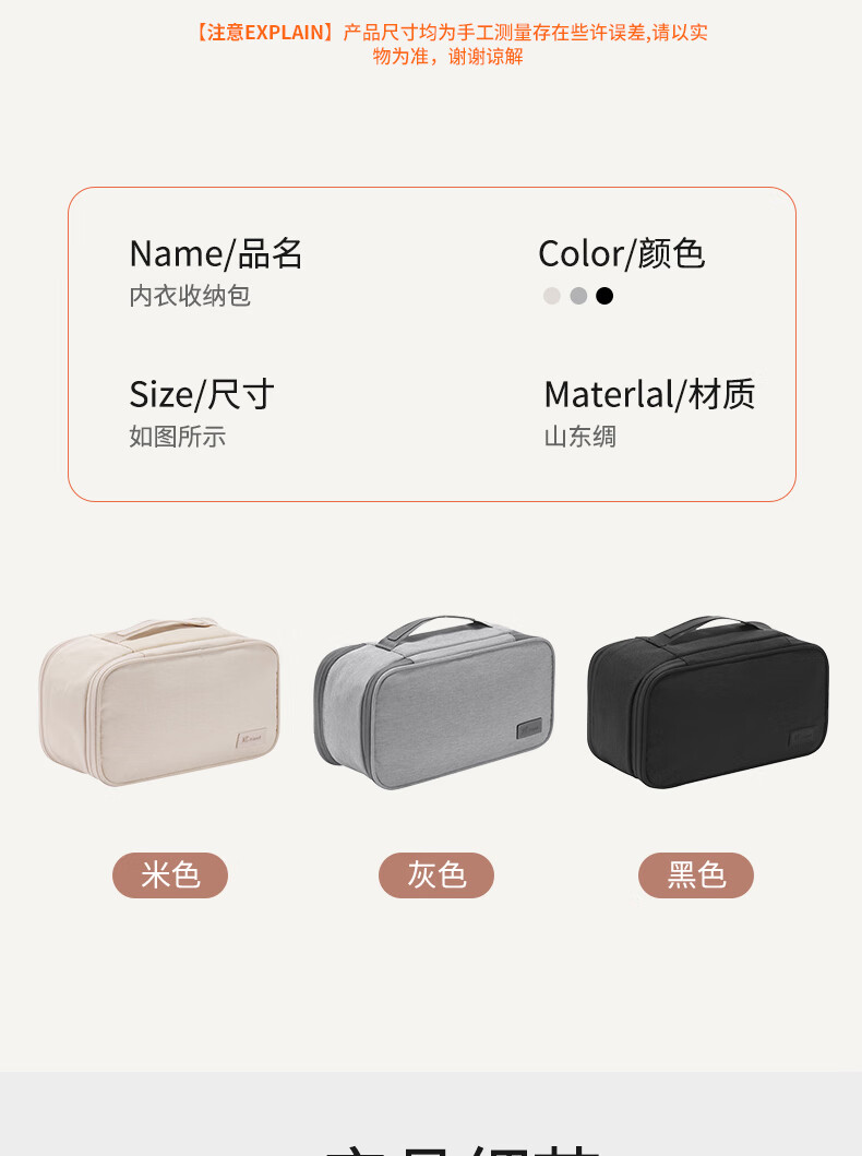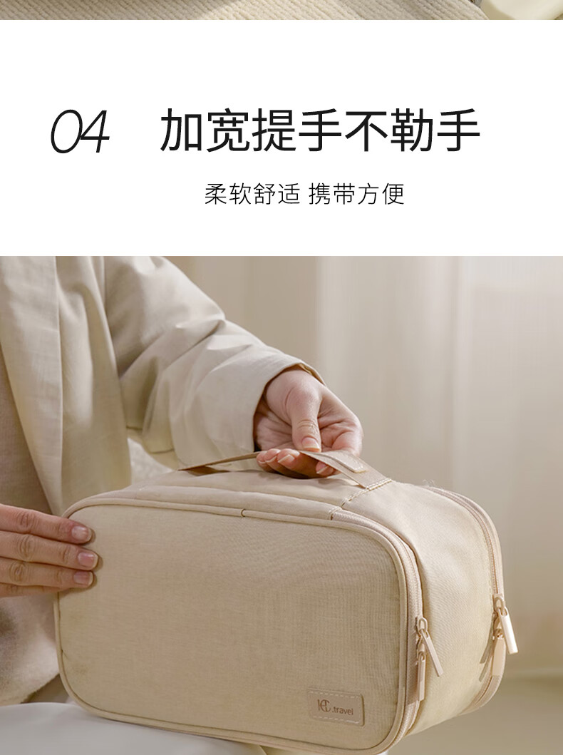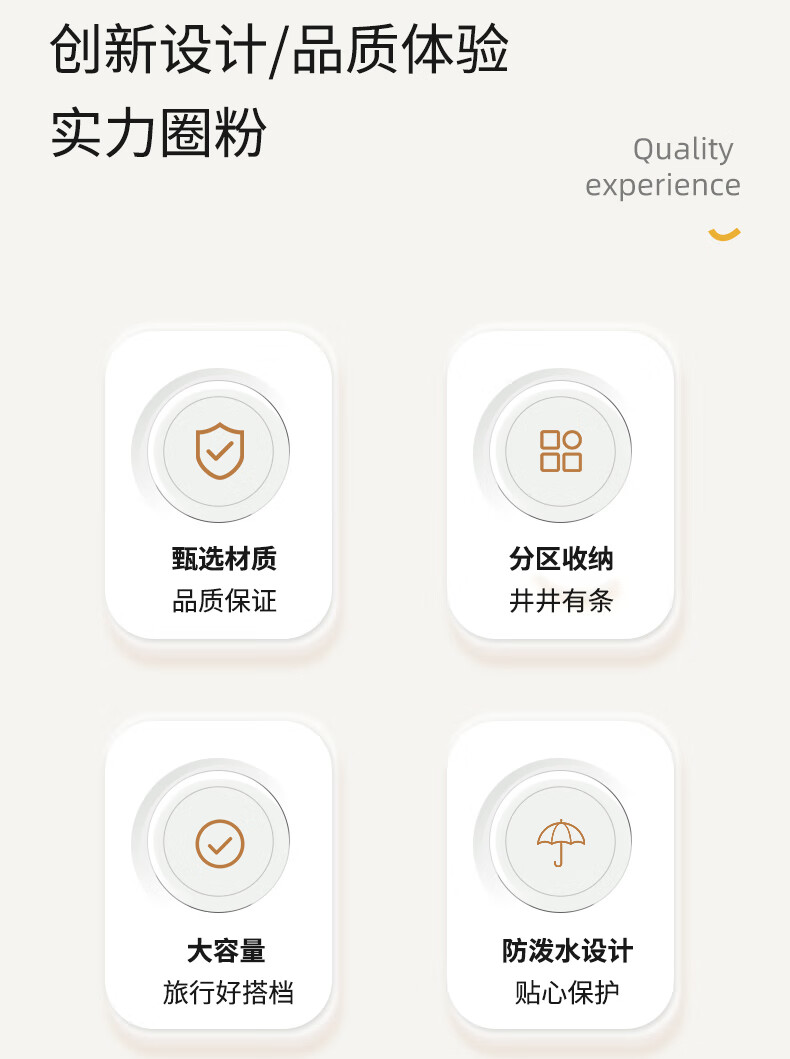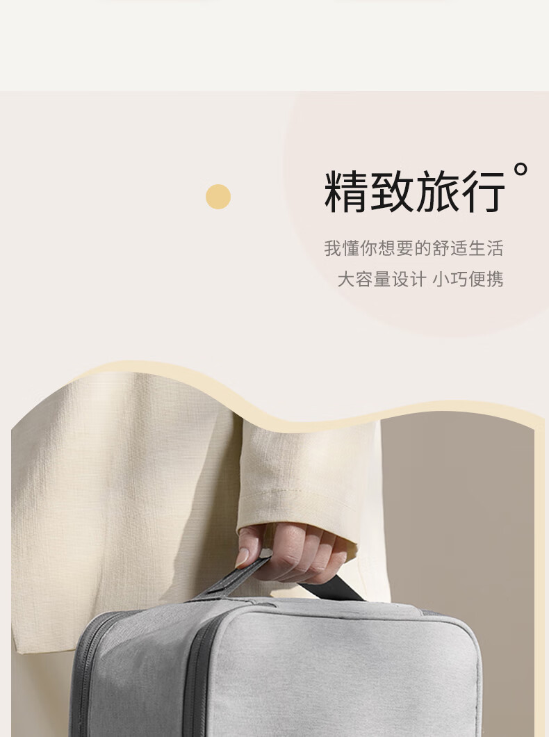 分区收纳,井井有条;防泼水设计;大容量设计,小巧便携;加宽提手不勒手