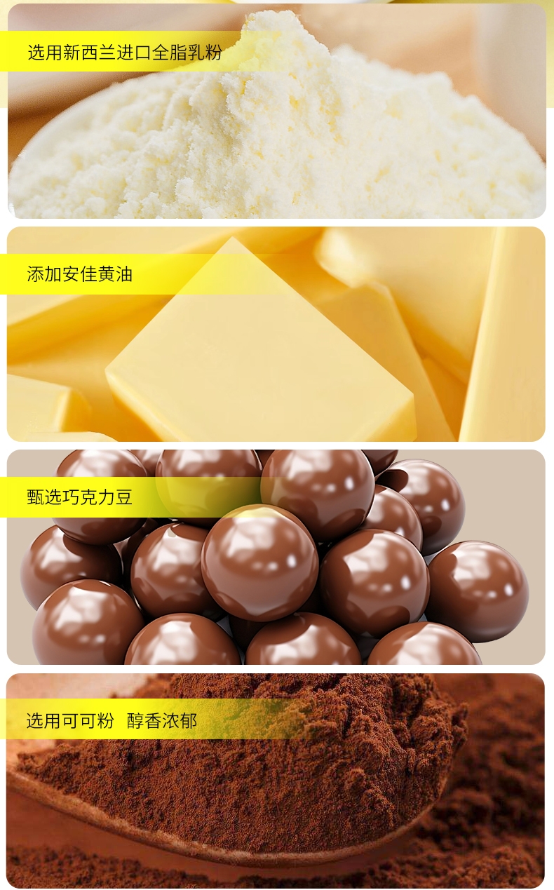 安佳黄油含量≥5% 纯牛奶含量≥28%;浓郁巧克力味 口口醇香软绵 ;香!嫩!软!软嫩有嚼劲