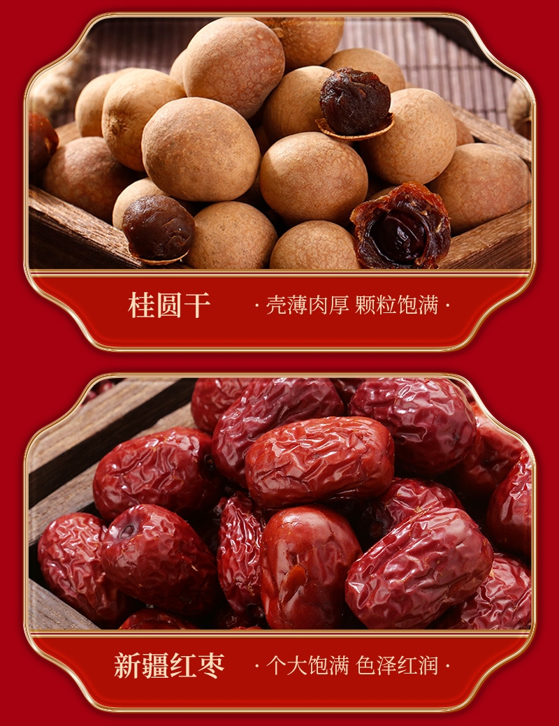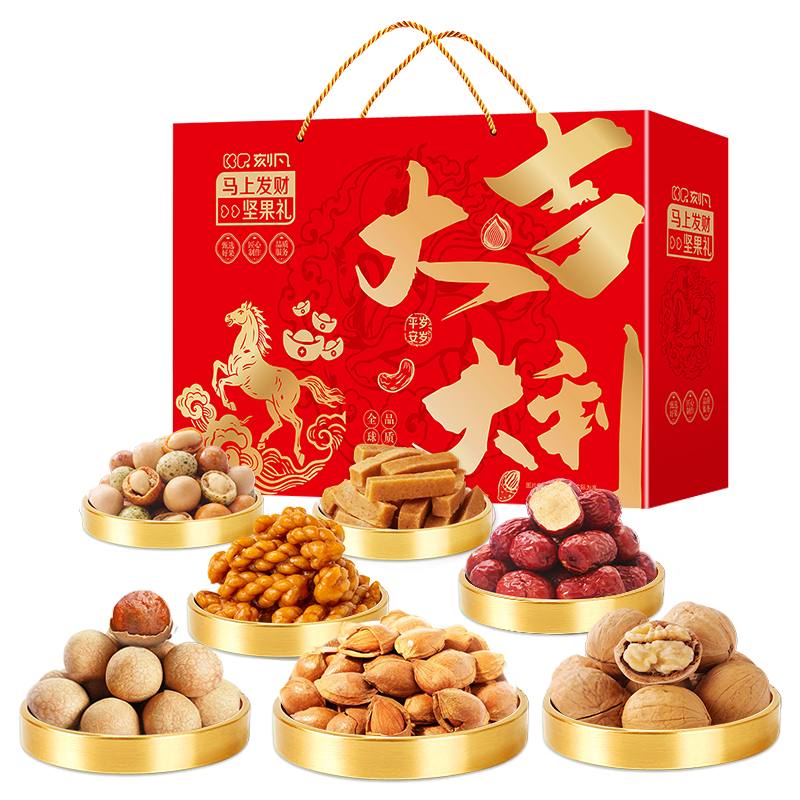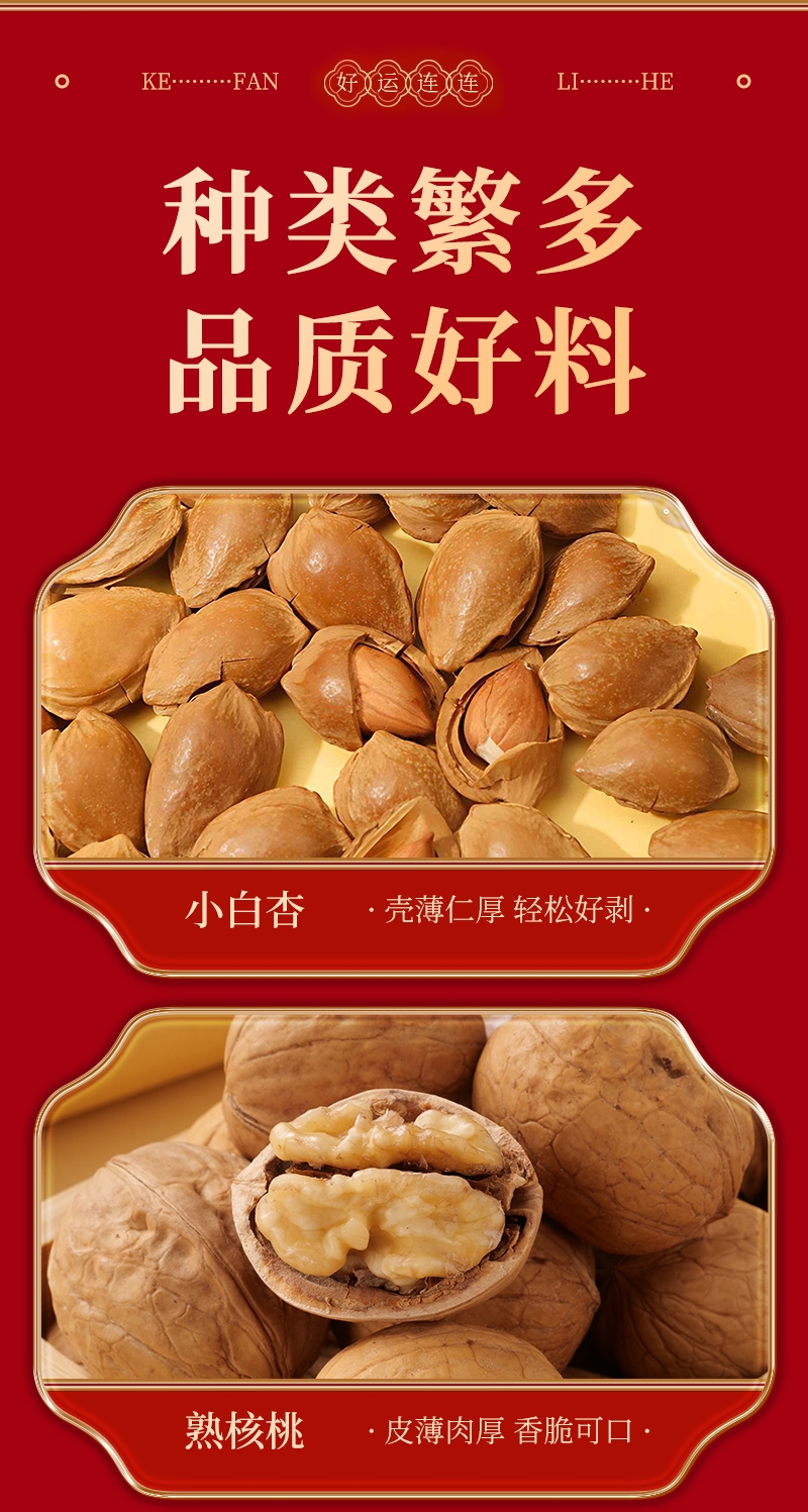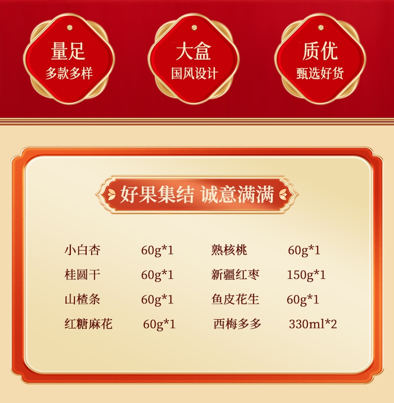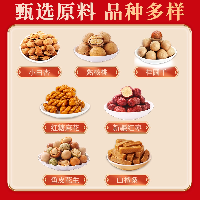 配置清单:小白杏核*1 熟核桃 *1 桂圆干 *1 新疆红枣*1 山楂条*1 鱼皮花生*1 红糖麻花*1 西梅多多*2