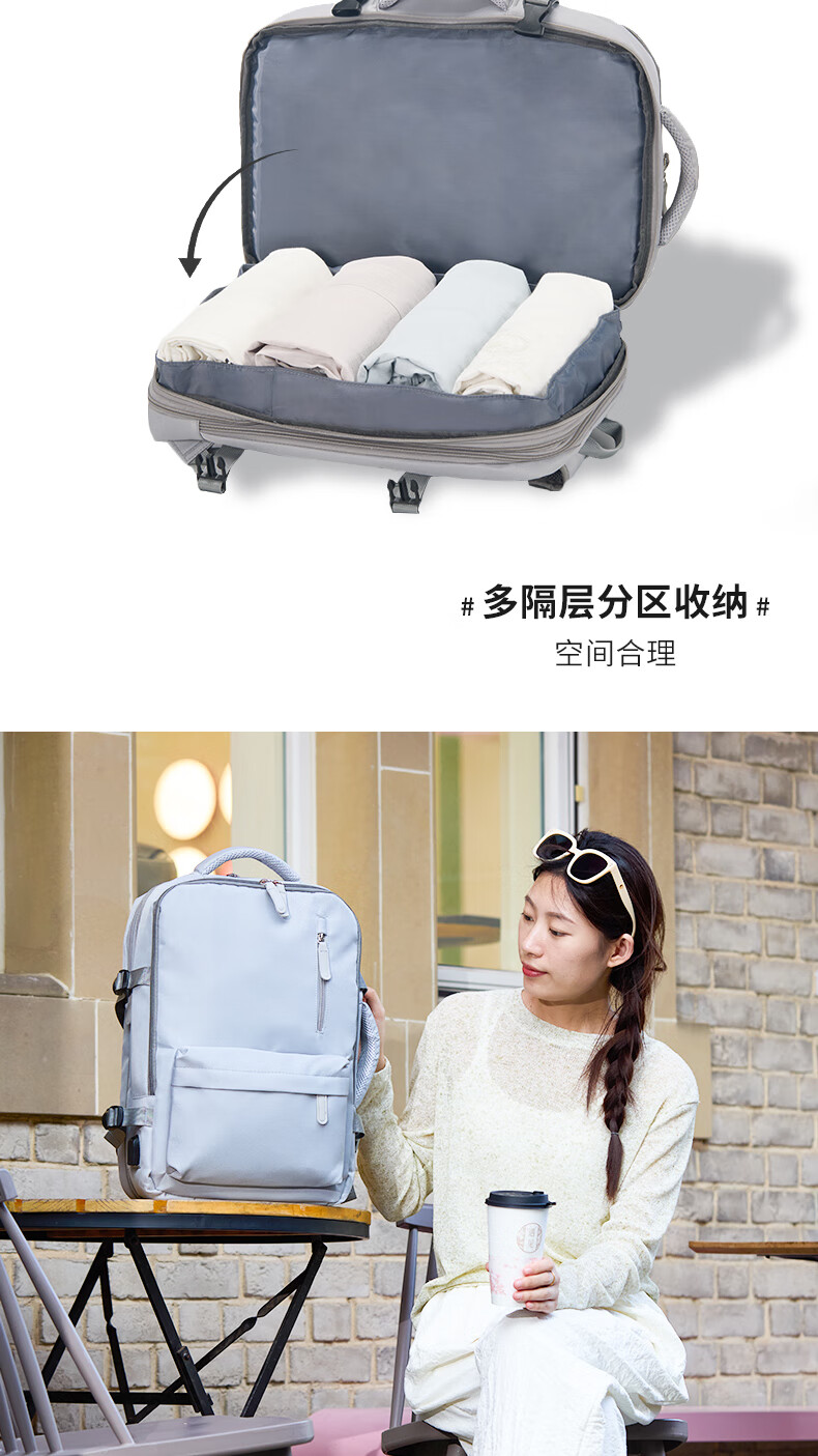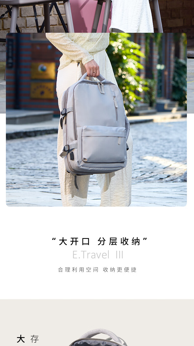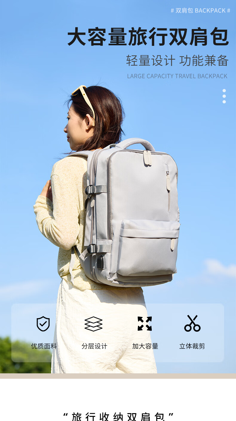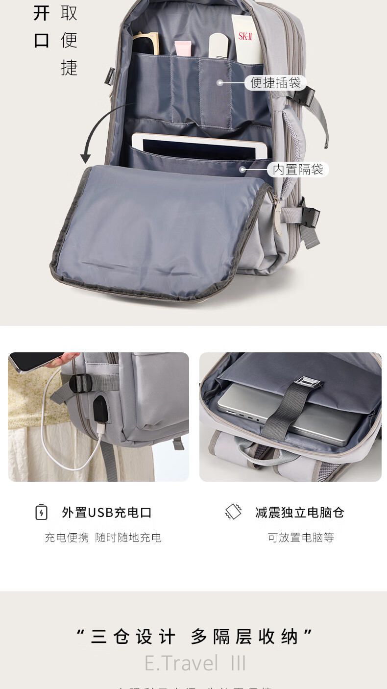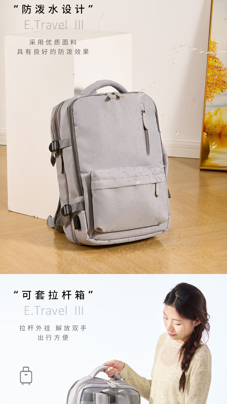 轻量设计,功能兼备;三仓设计,多隔层分区收纳,空间合理;外置USB充电口,减震独立电脑仓;优质面料,防泼水;可套拉杆箱,解放双手