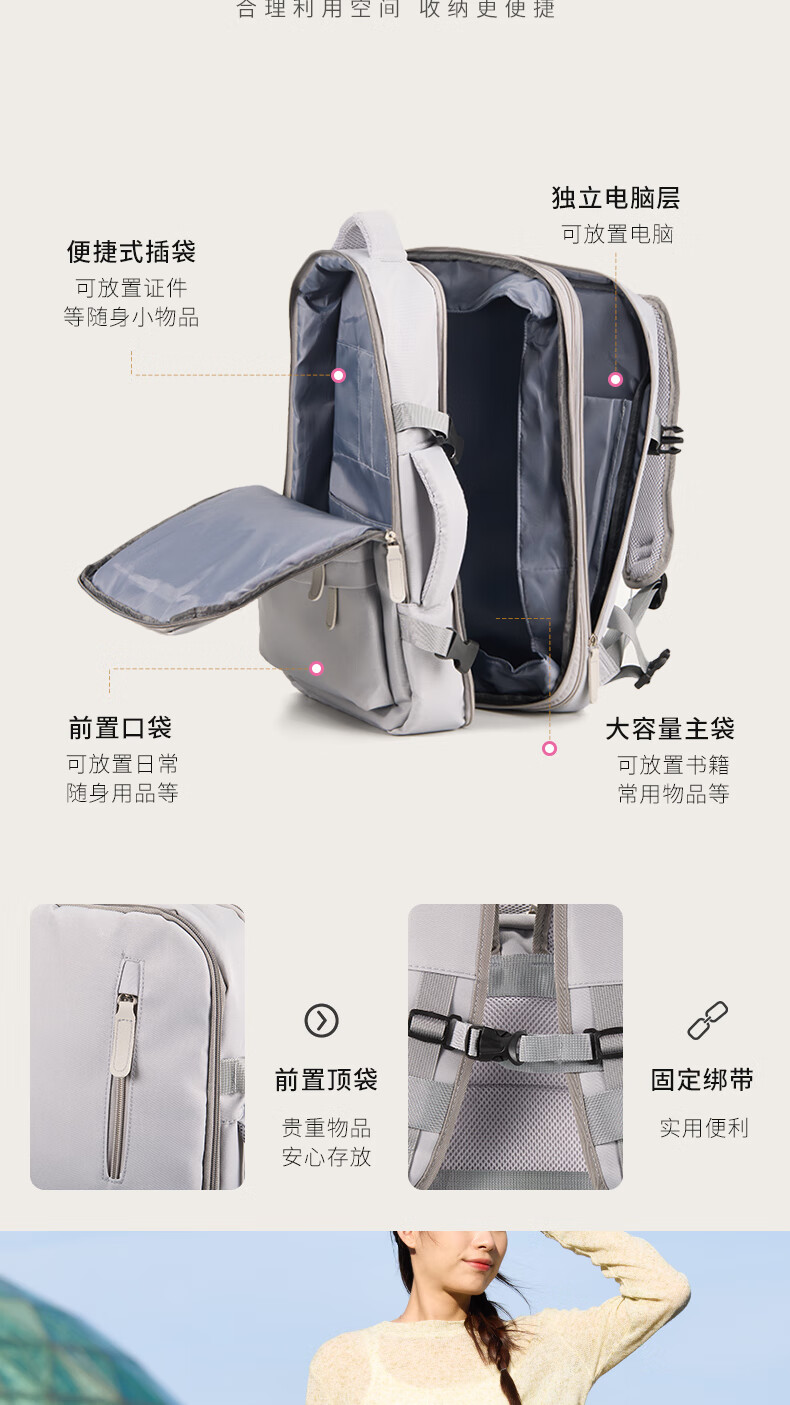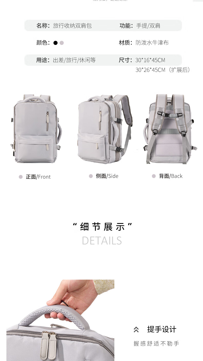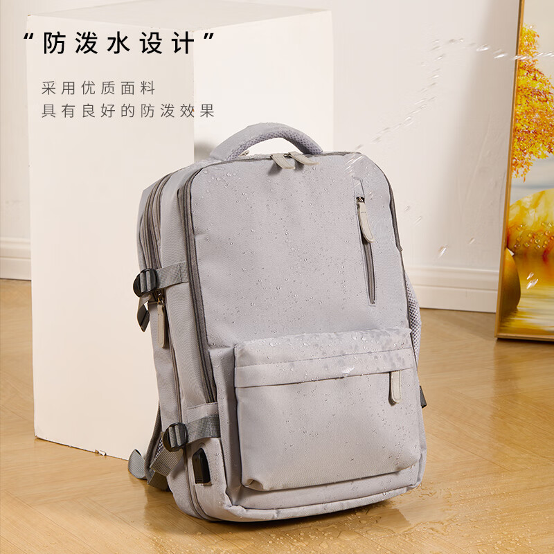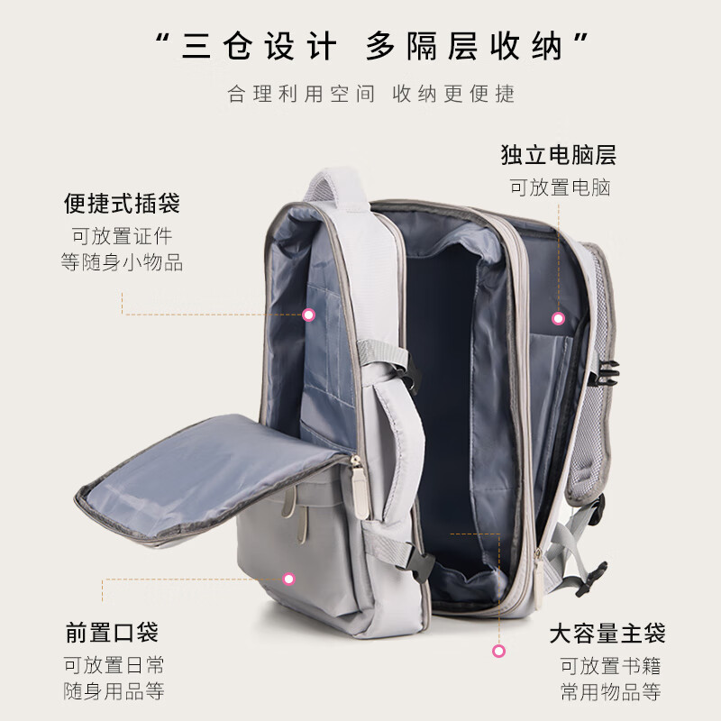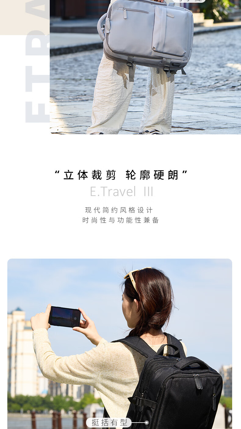 轻量设计,功能兼备;三仓设计,多隔层分区收纳,空间合理;外置USB充电口,减震独立电脑仓;优质面料,防泼水;可套拉杆箱,解放双手