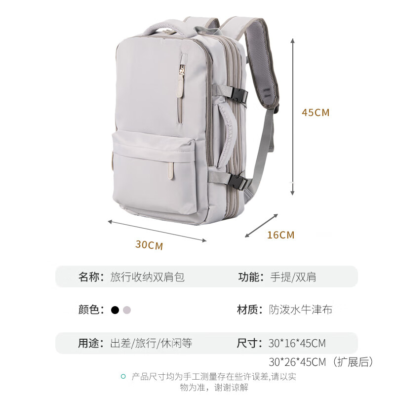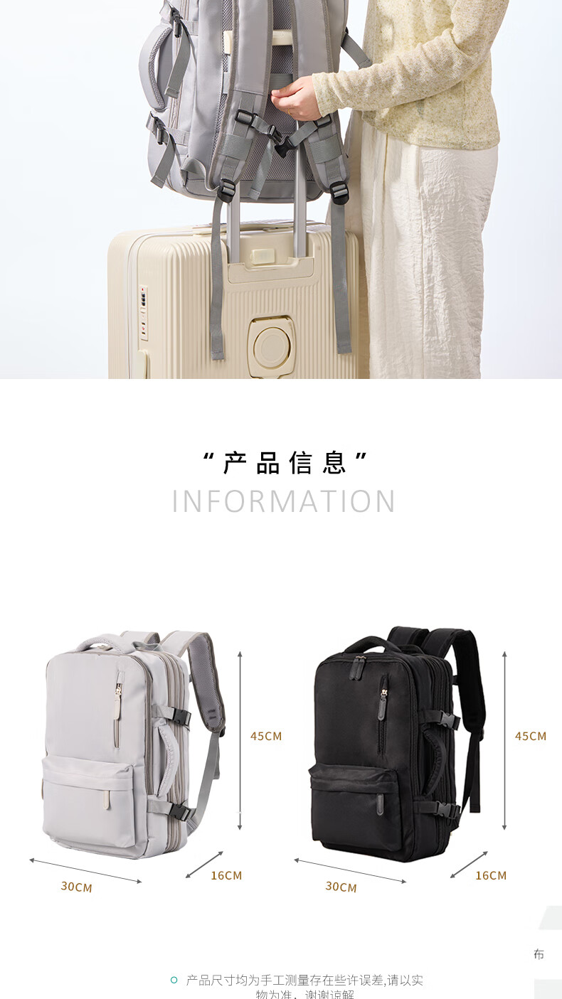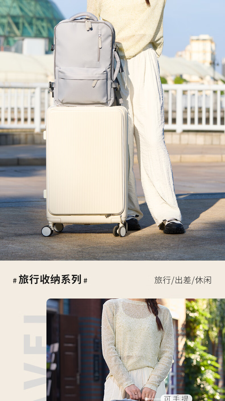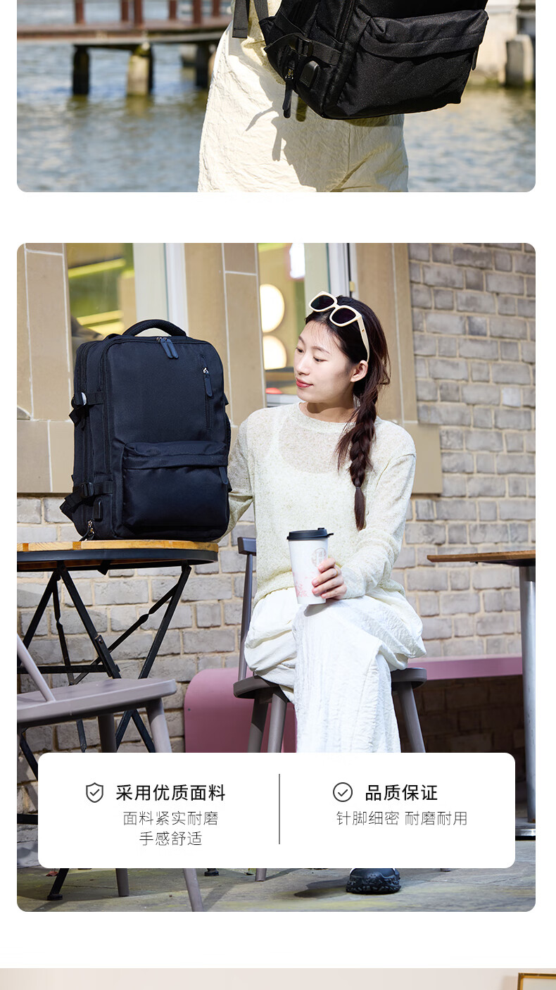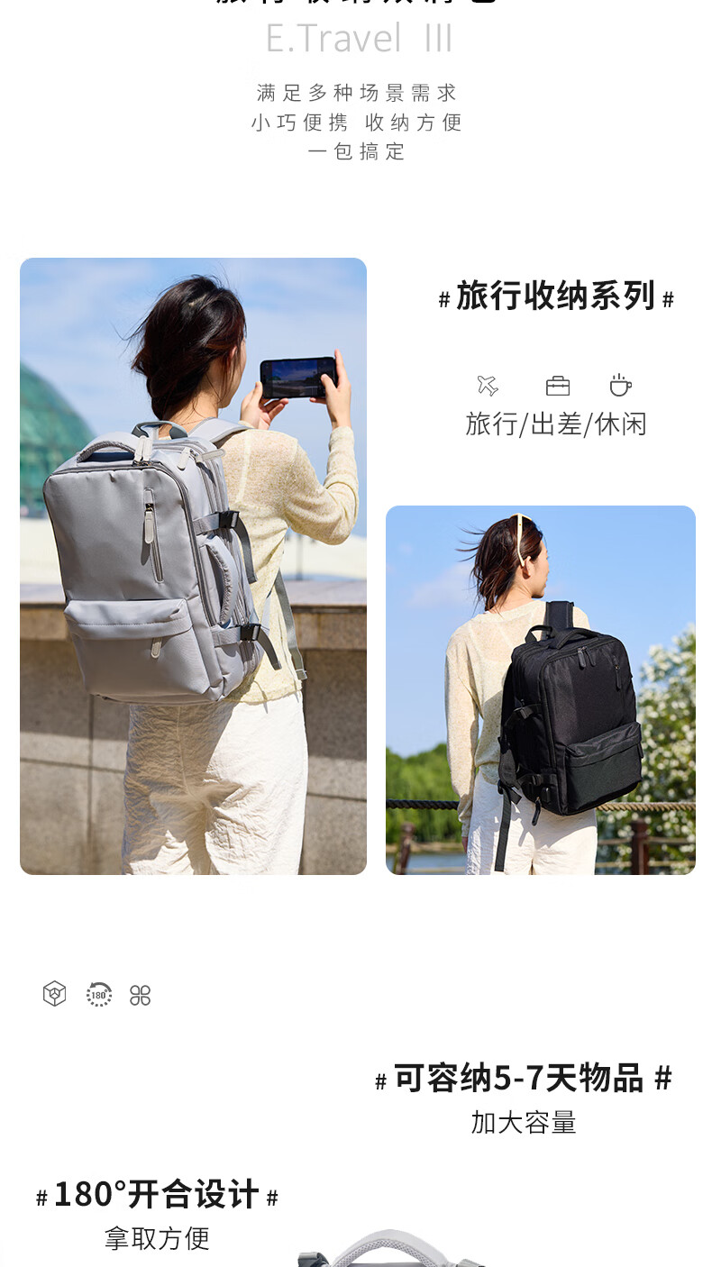 轻量设计,功能兼备;三仓设计,多隔层分区收纳,空间合理;外置USB充电口,减震独立电脑仓;优质面料,防泼水;可套拉杆箱,解放双手