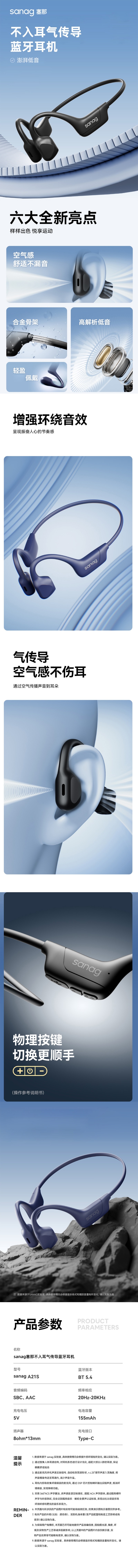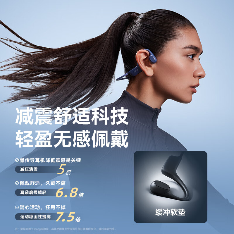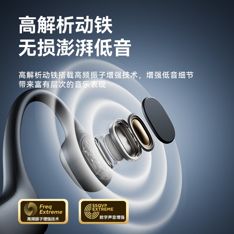 气传导技术,运动听音乐的同时随时随地感知外声音;高解析动铁搭载高频振子增强技术;增强低音组无损澎湃低音,带来富 有层次的音乐表现