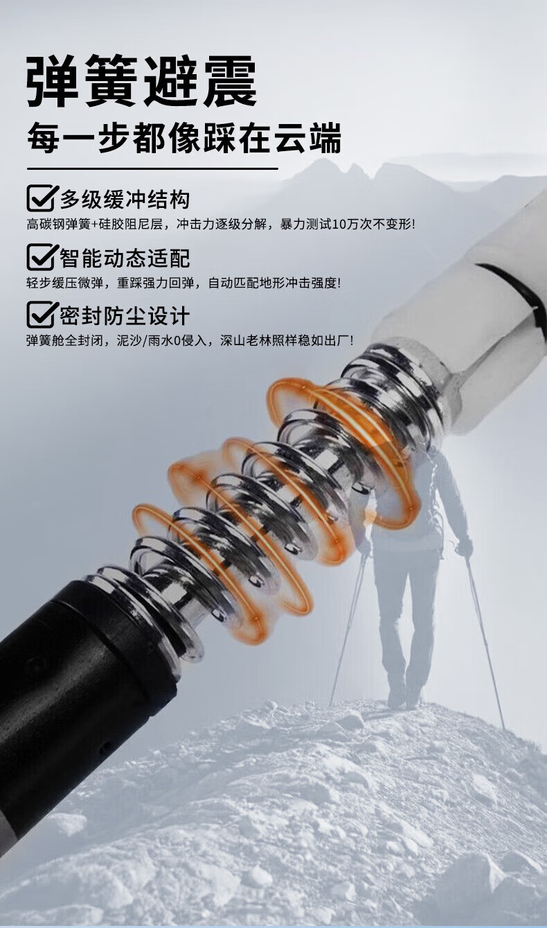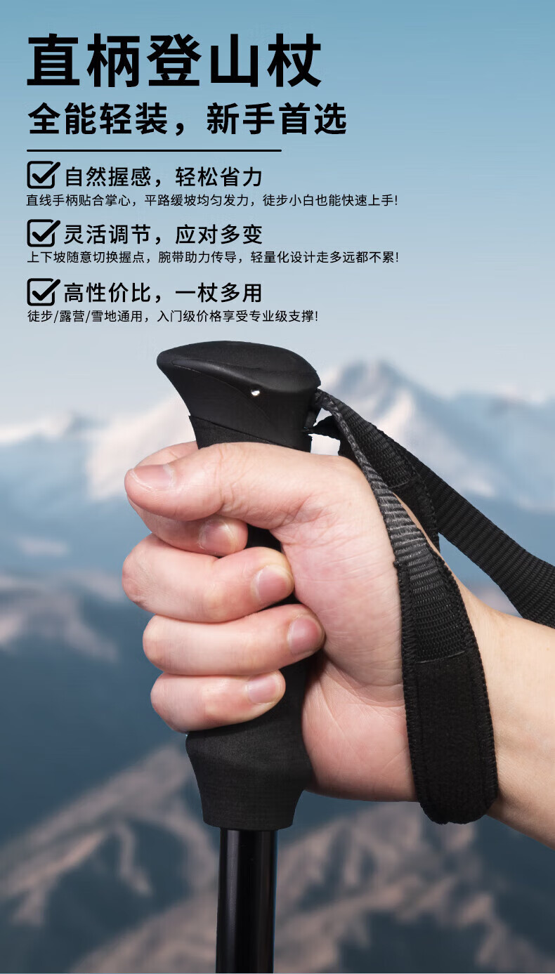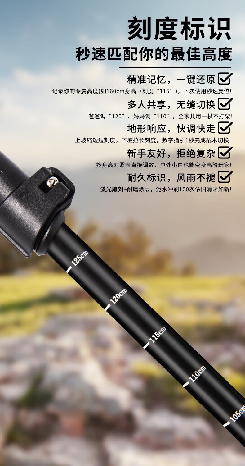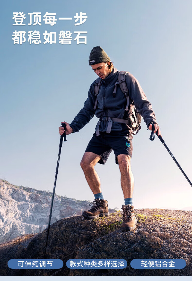 铝合金材质密度低,重量较轻;具有较高的抗拉强度和抗疲劳性能,能够承受较大的压力;铝合金登山杖通常采用多节伸缩设计(三节)