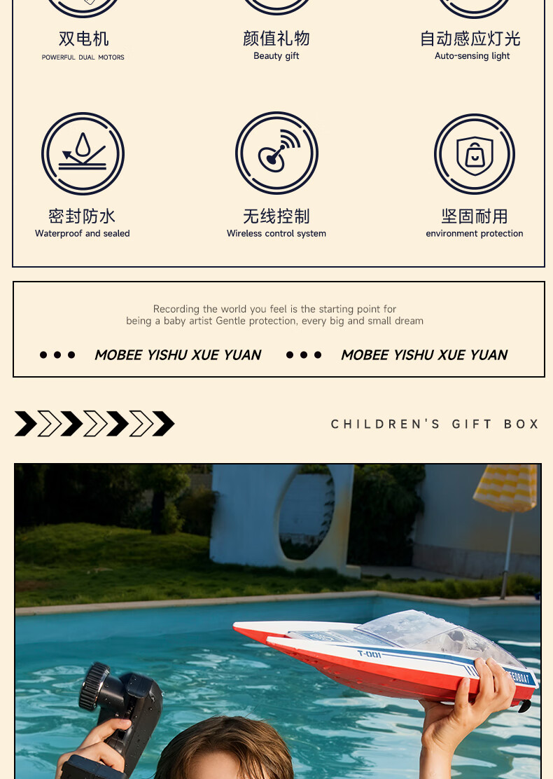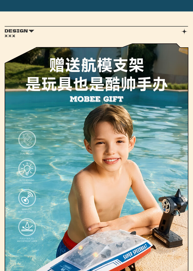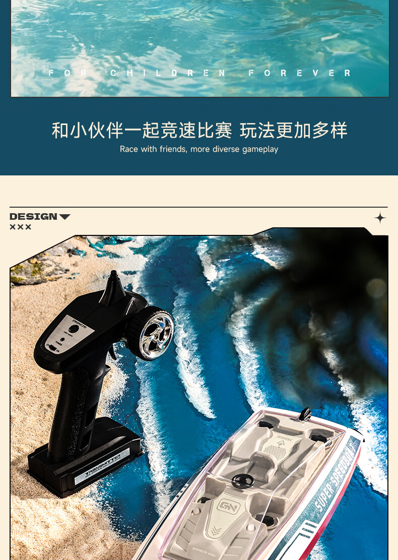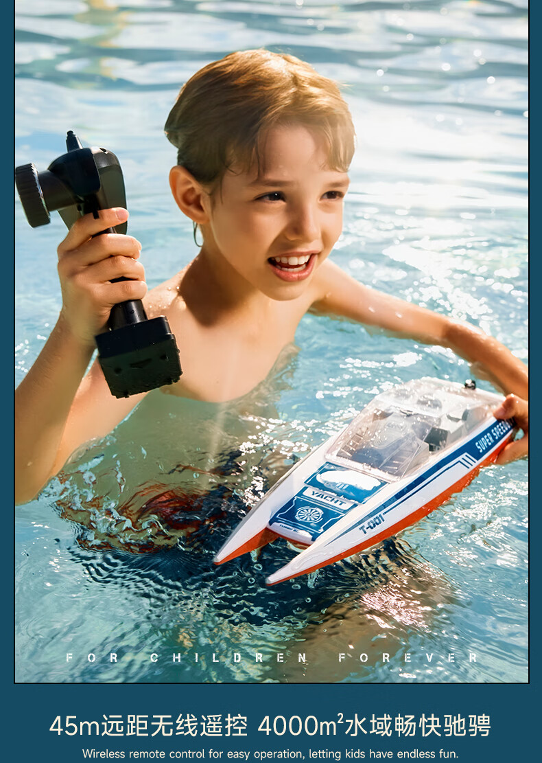 三层式船体结构,密封性极佳;高仿真时尚涂装,外形酷炫;搭载双高性能马达,45米遥控手柄,灵活操作轻松驰骋