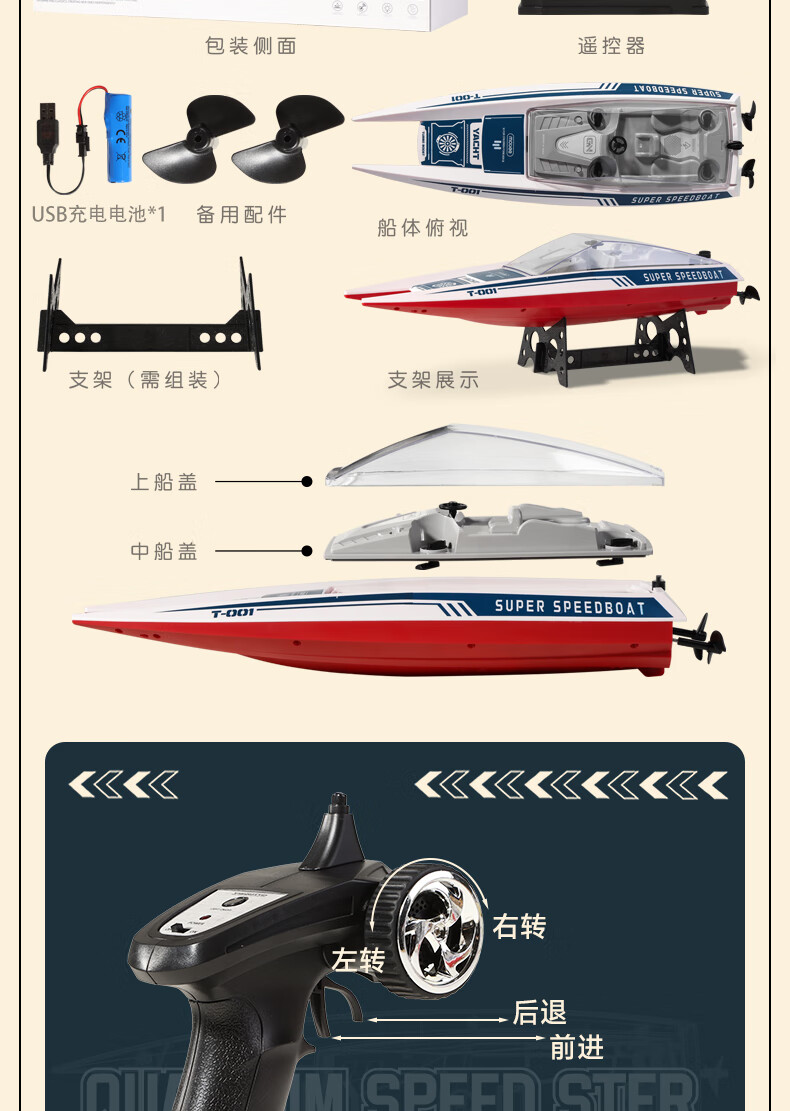 产品组成:船体*1、遥控器*1、USB充电线*1、螺旋桨*2、支架*1、电池*1。