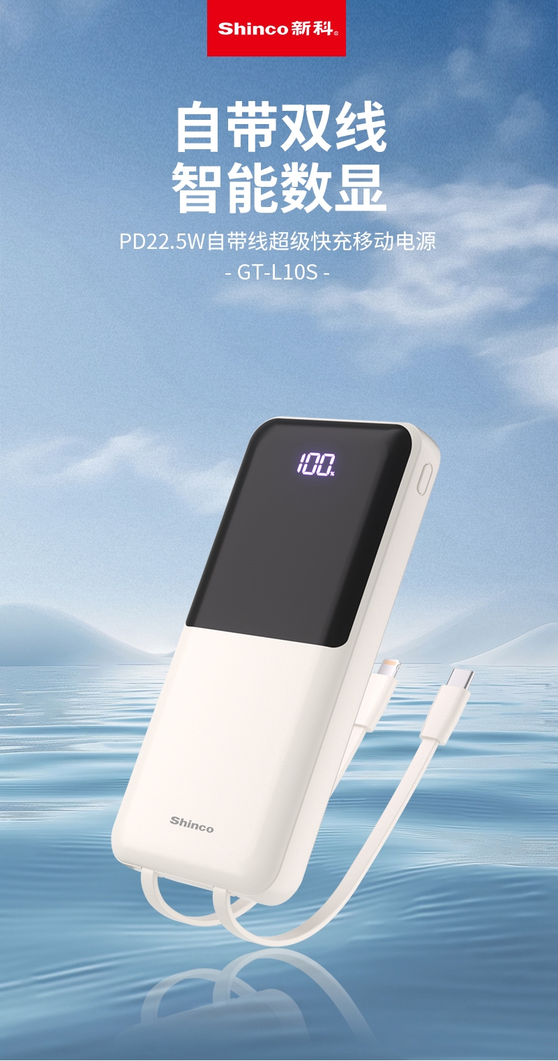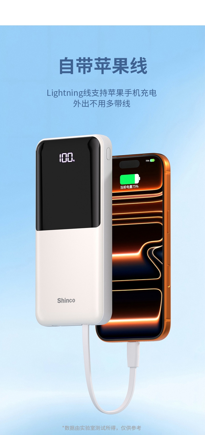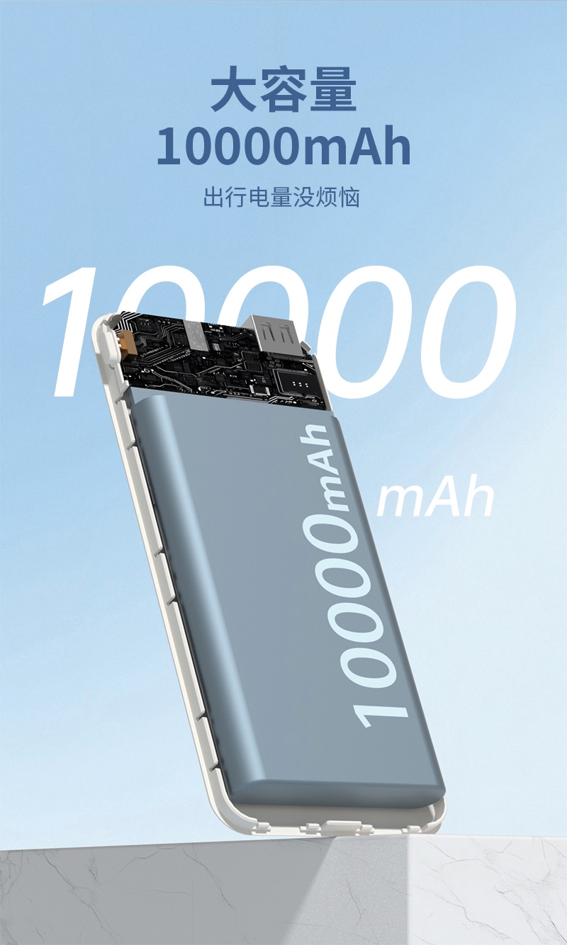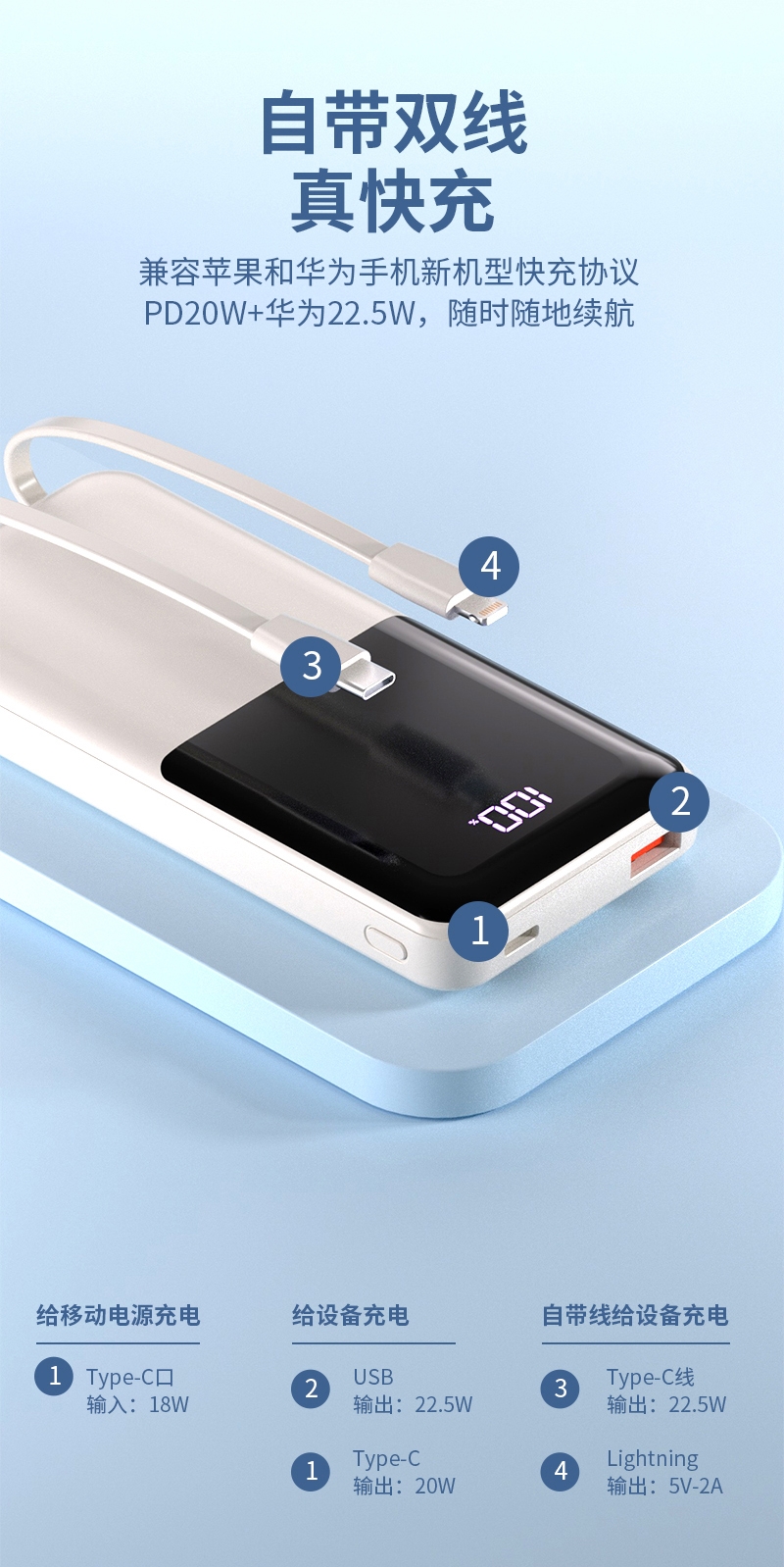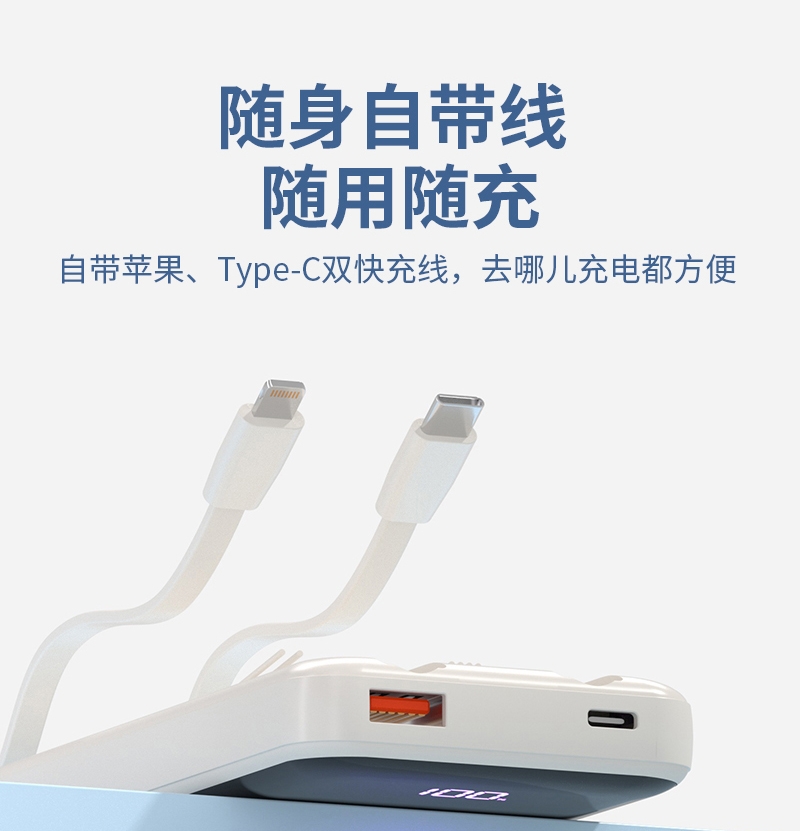 随身自带线、随用随充;大容量 10000mAh、出行电量没烦恼;智能大数显屏、电量一目了然