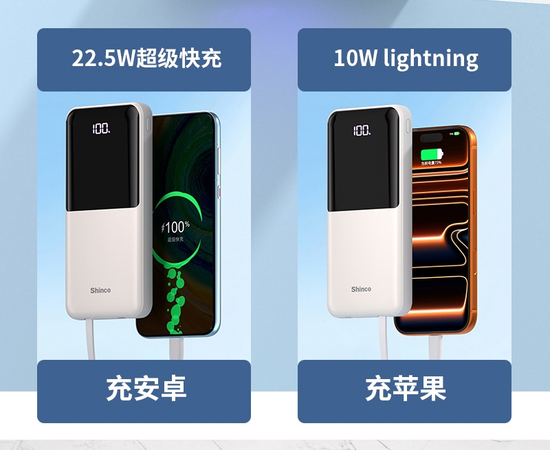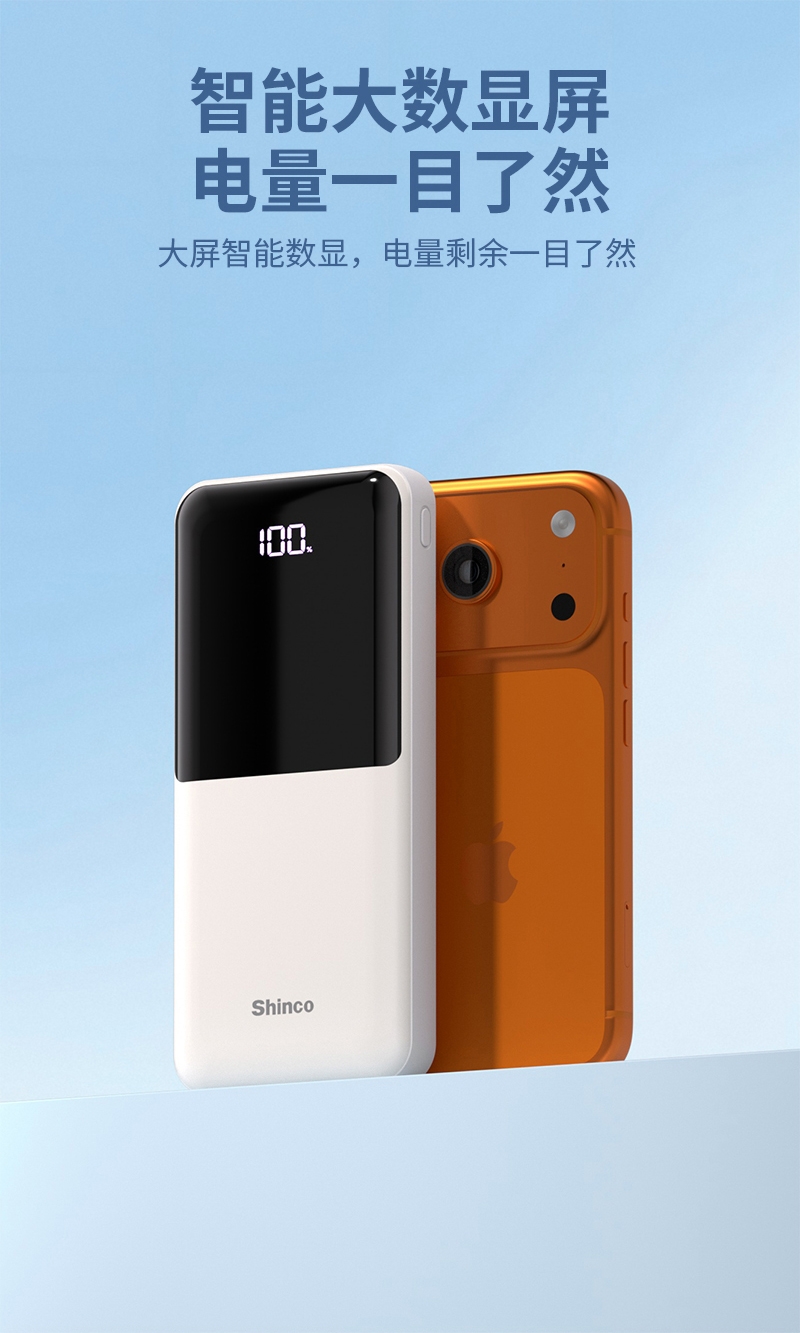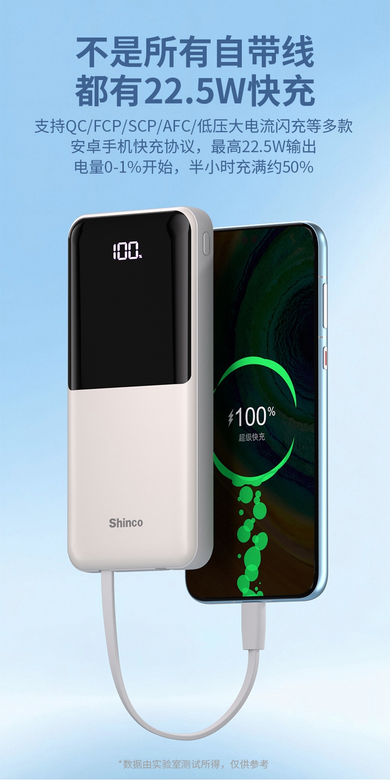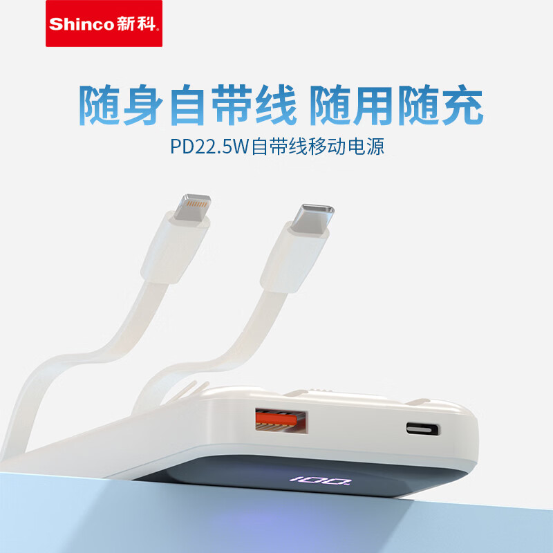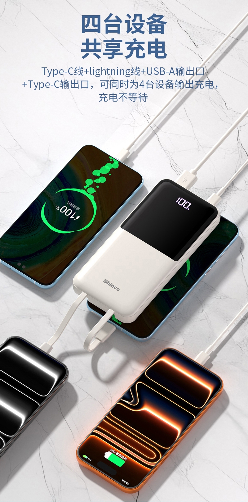 随身自带线、随用随充;大容量 10000mAh、出行电量没烦恼;智能大数显屏、电量一目了然