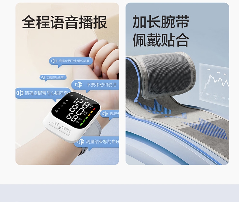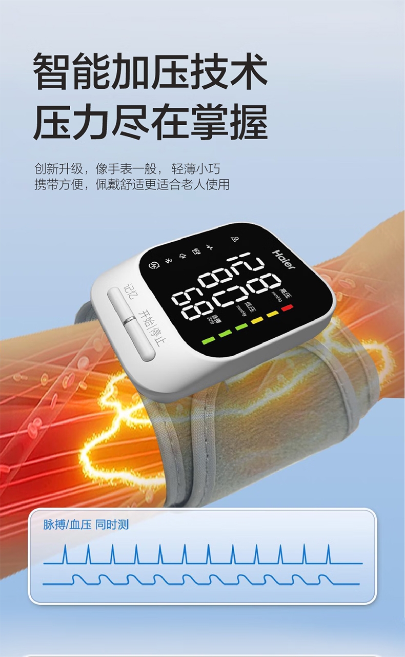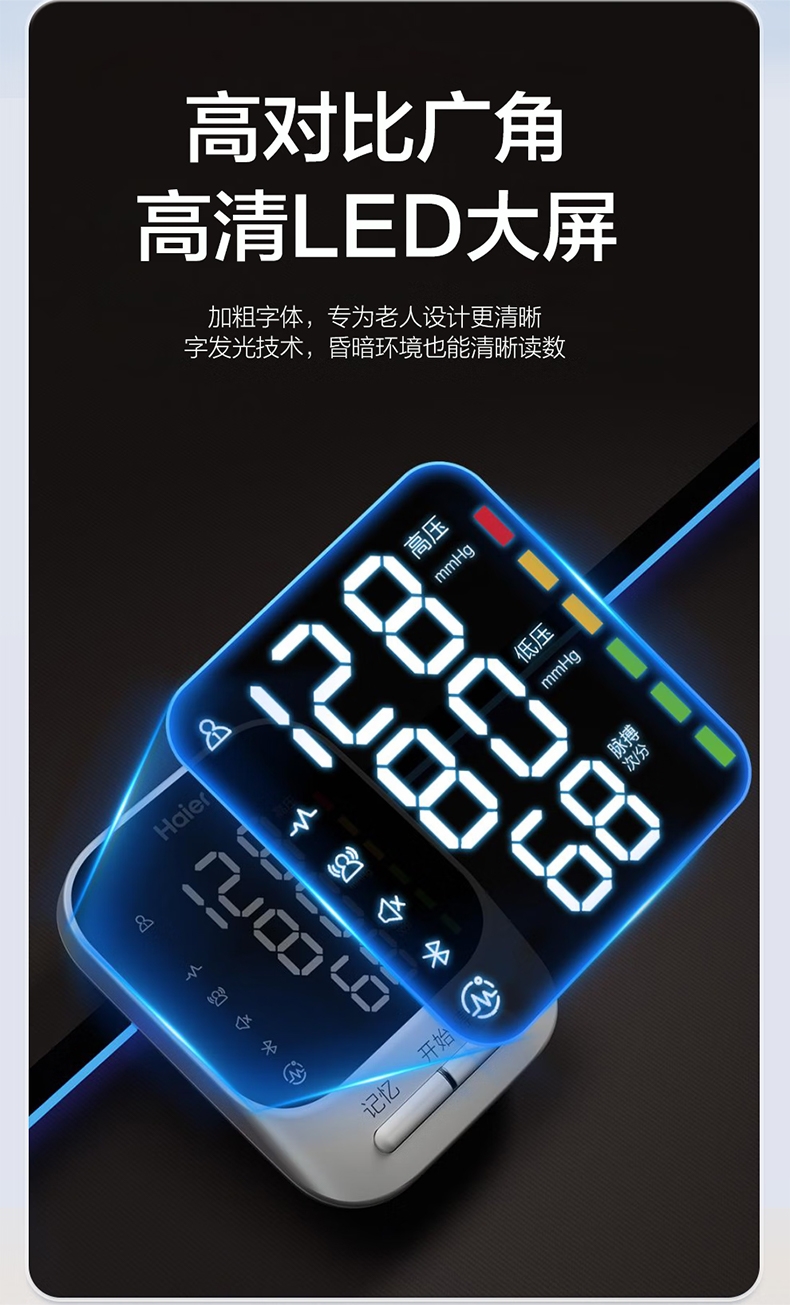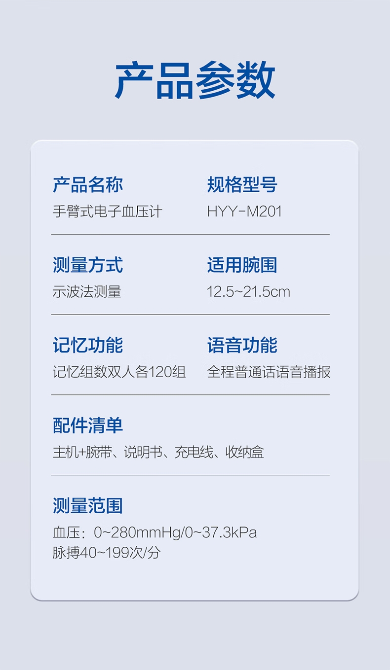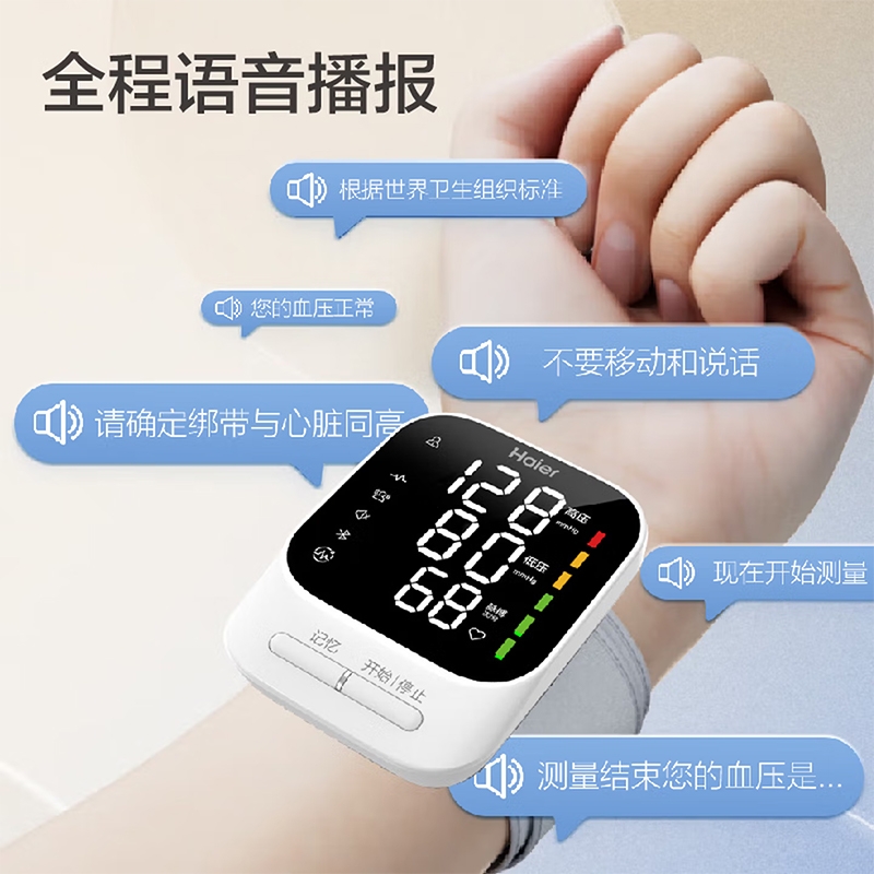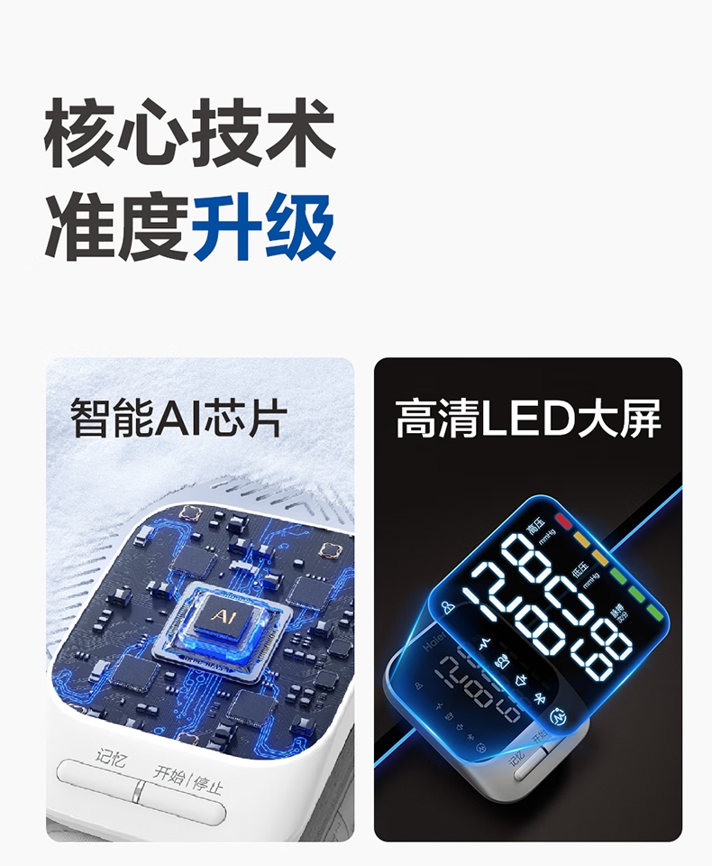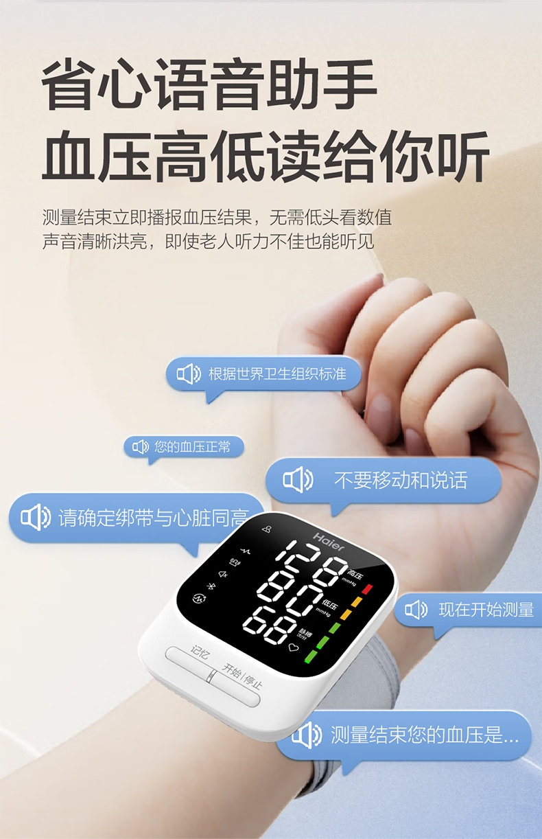 三色血压显示健康一目了然;更加轻巧机身随身便捷携带;全程语音指导测量方便简单;智能加压技术测量过程舒适