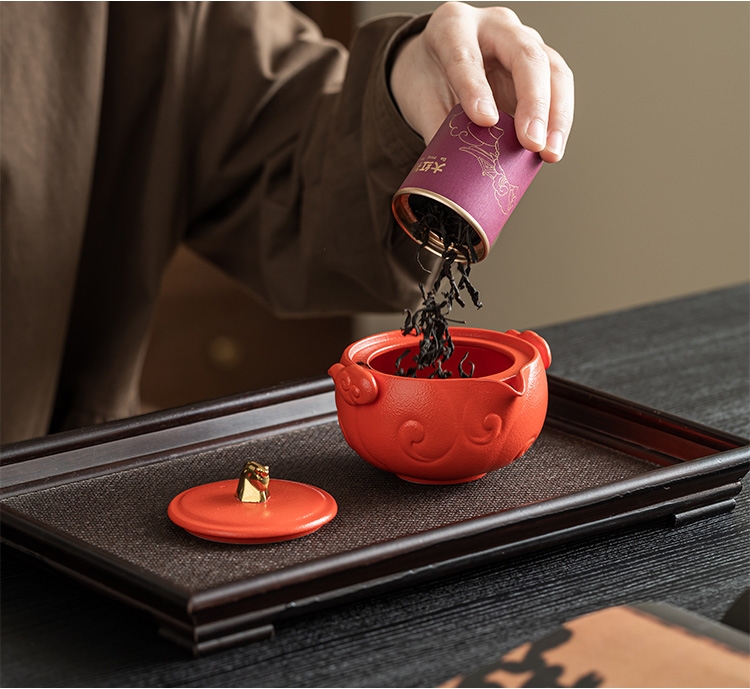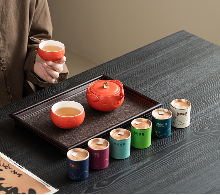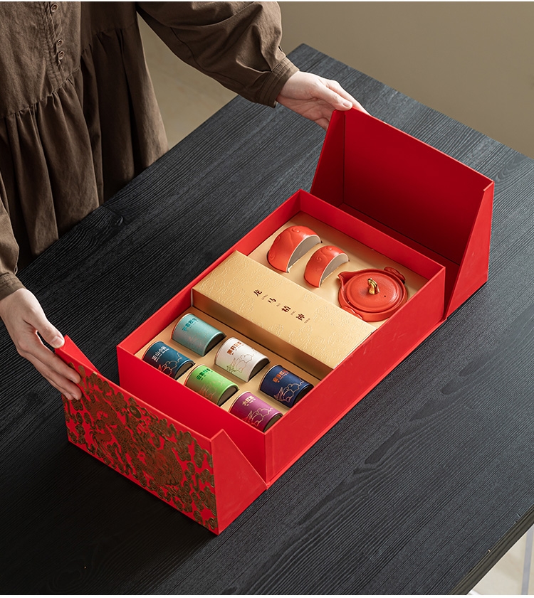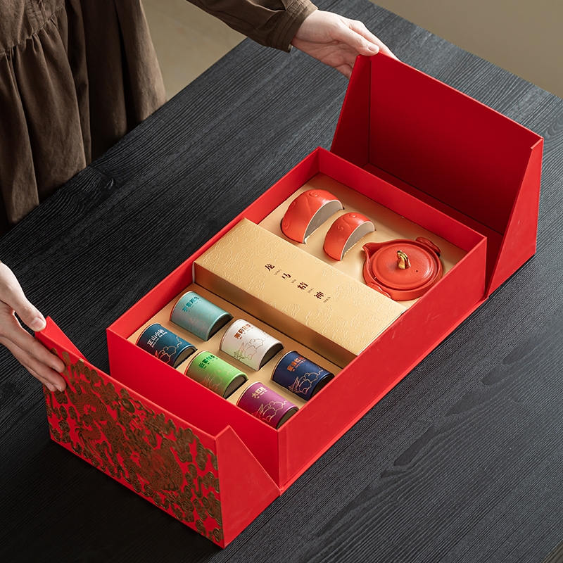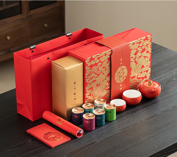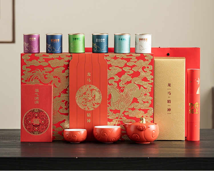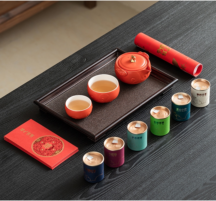 配置清单:茶壶*1、客杯*1、主人杯*1、对联*1、红包*6、小罐茶*6(赠:大红袍、子君观音、云雾绿茶、正山小种、茉莉花茶、蜜香红茶各一罐)、浮雕烫金礼盒、礼袋