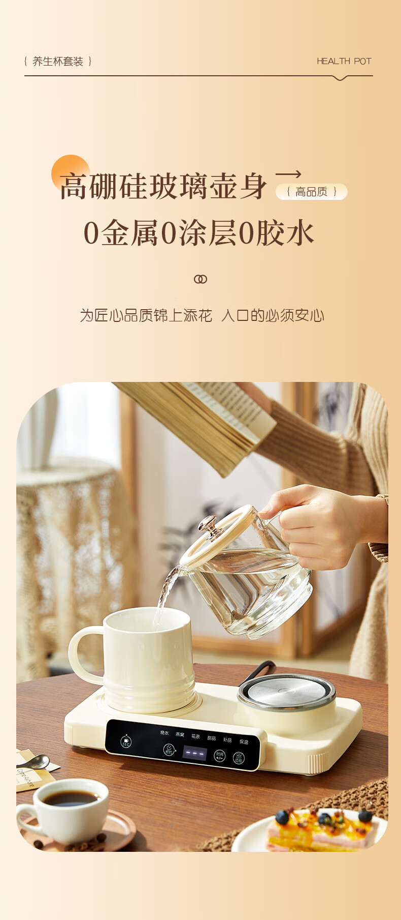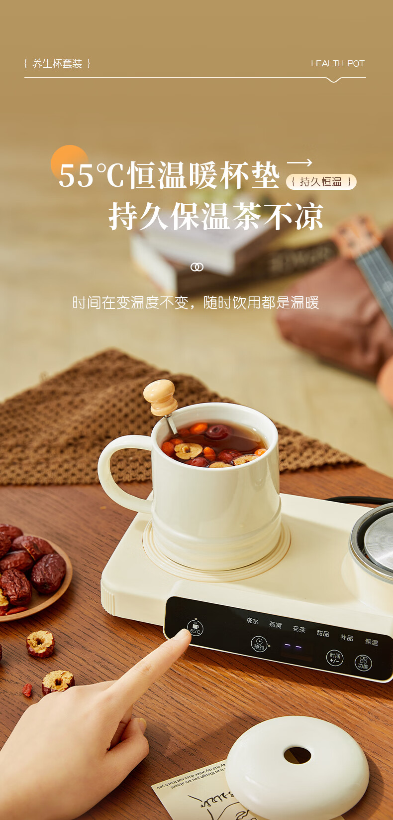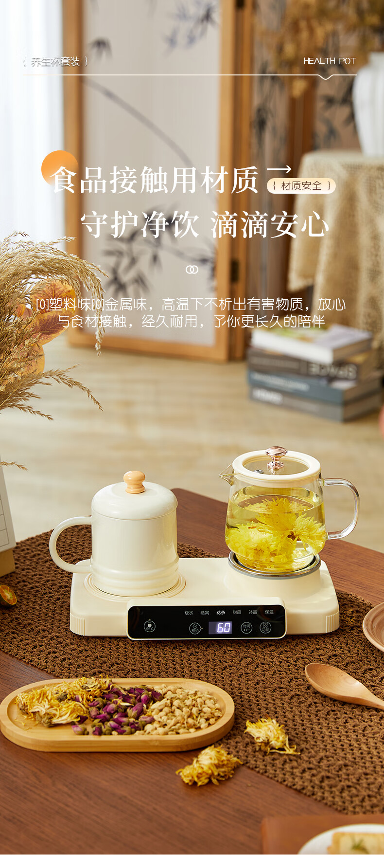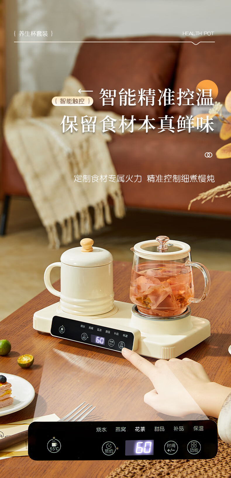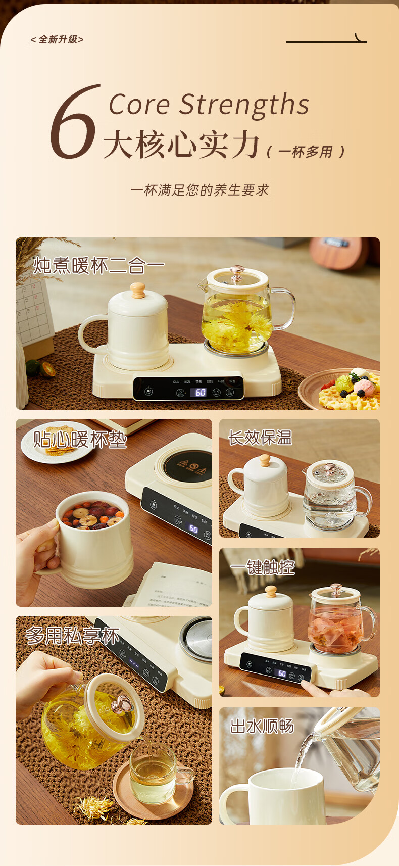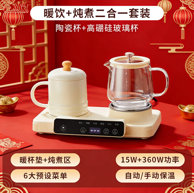 双底座养生壶炖煮二合一,左边保温,右边炖煮同享;;1壶1杯一套装,6大预设功能,15W暖饮,375W;600ML炖煮养生杯+400ML恒温杯二合一;;分体式养生壶杯壶,清洗方便,提壶即饮;;高硼硅玻璃壶+白瓷饮水杯,高温防干烧自动断电;