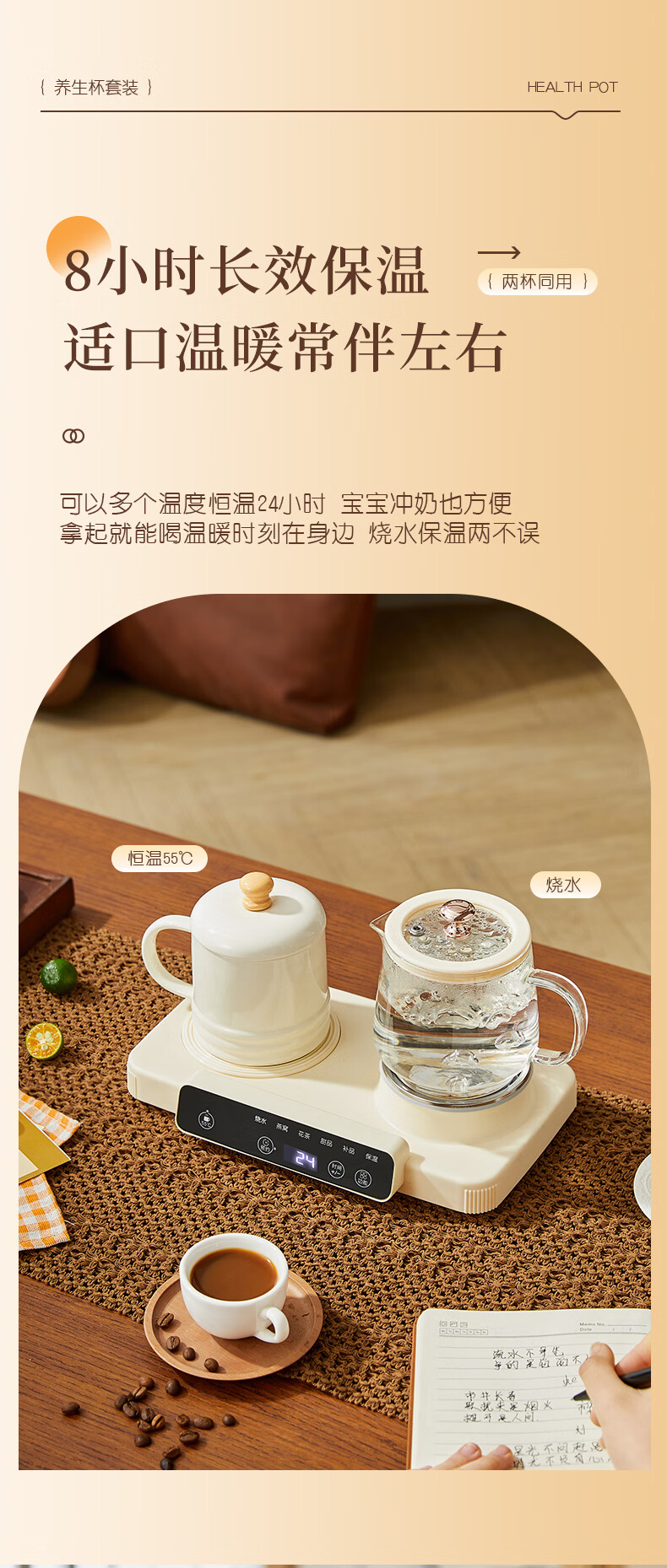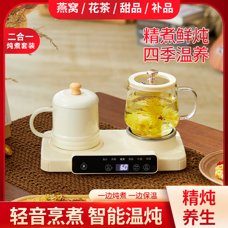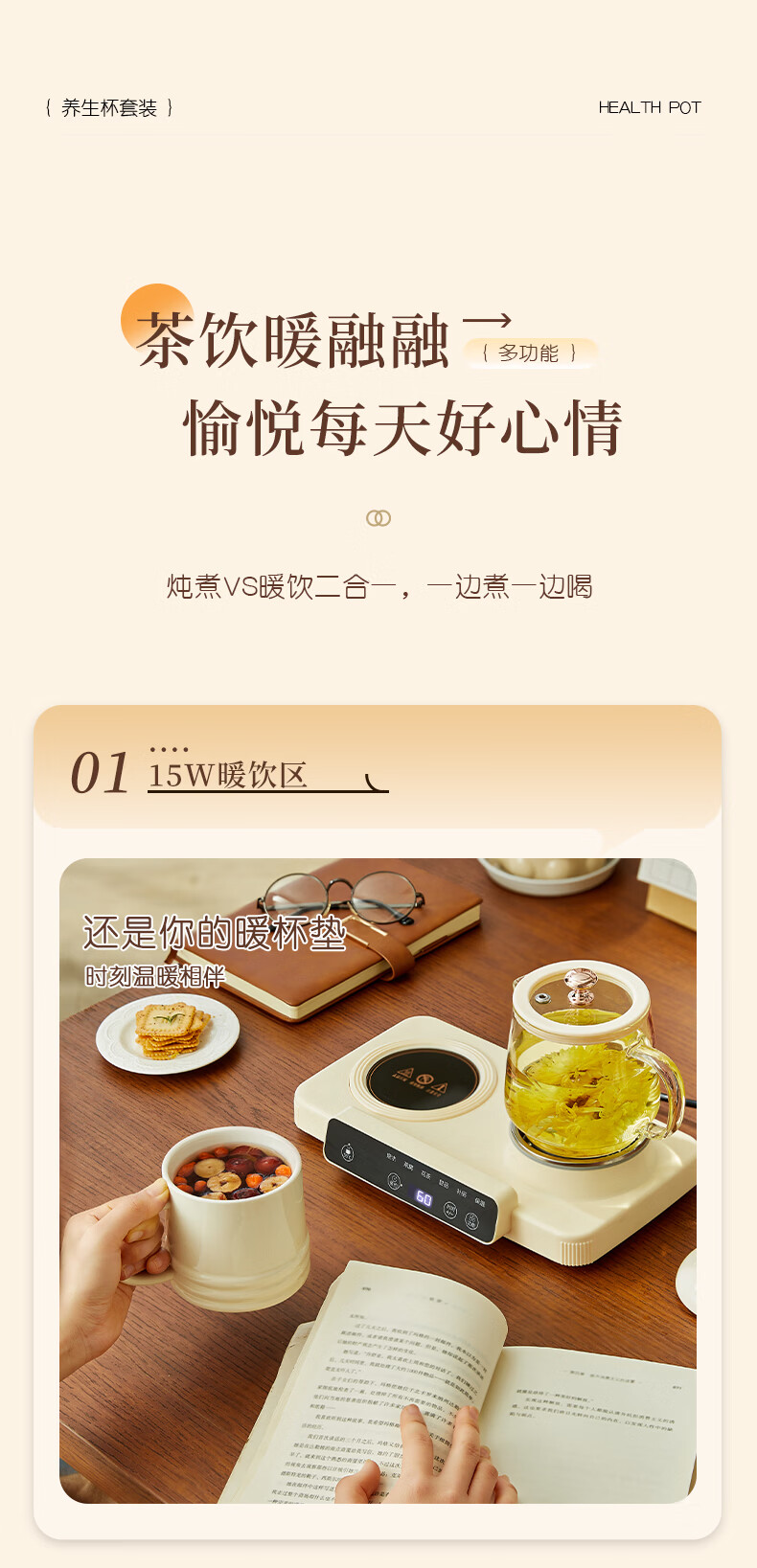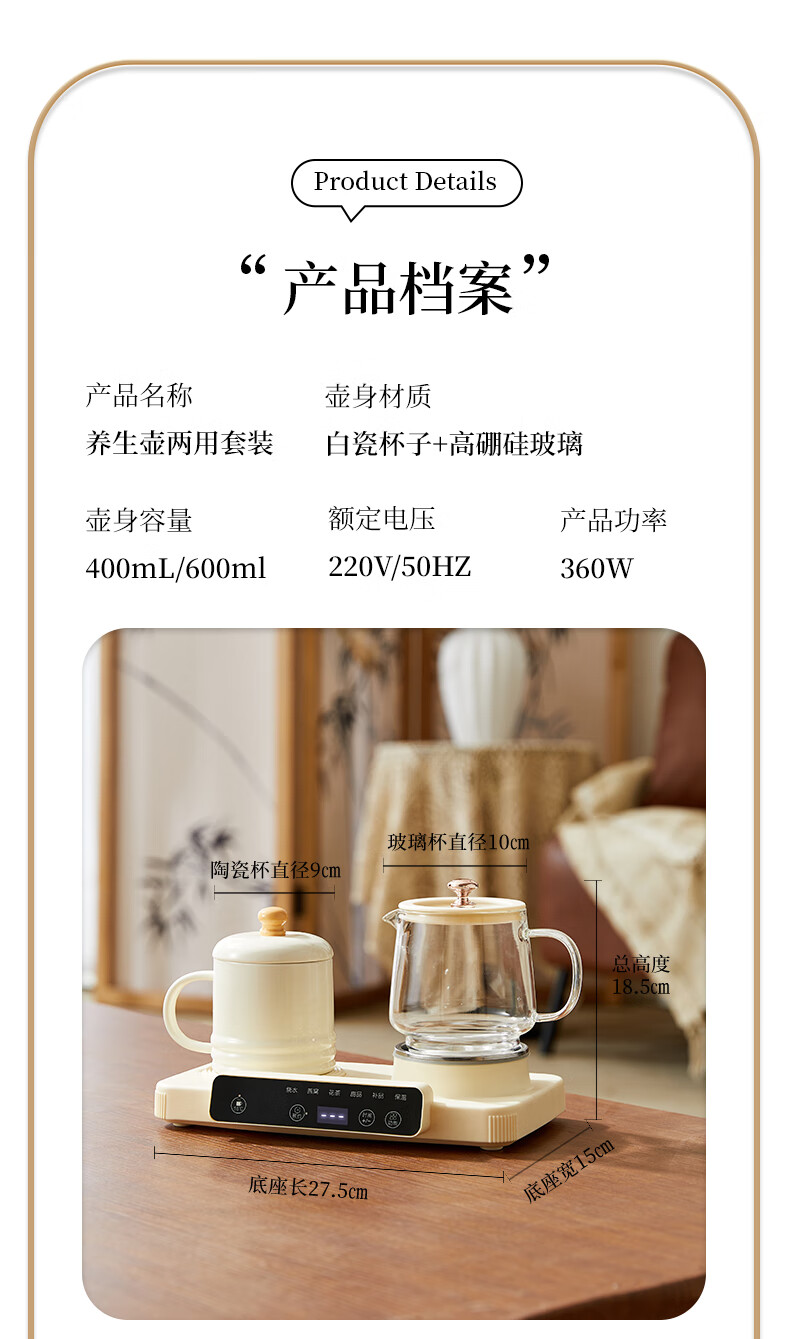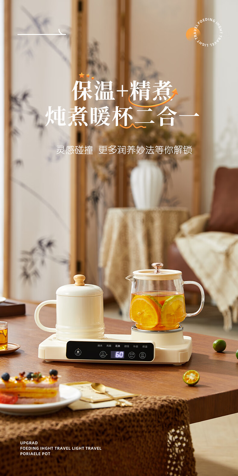 双底座养生壶炖煮二合一,左边保温,右边炖煮同享;;1壶1杯一套装,6大预设功能,15W暖饮,375W;600ML炖煮养生杯+400ML恒温杯二合一;;分体式养生壶杯壶,清洗方便,提壶即饮;;高硼硅玻璃壶+白瓷饮水杯,高温防干烧自动断电;