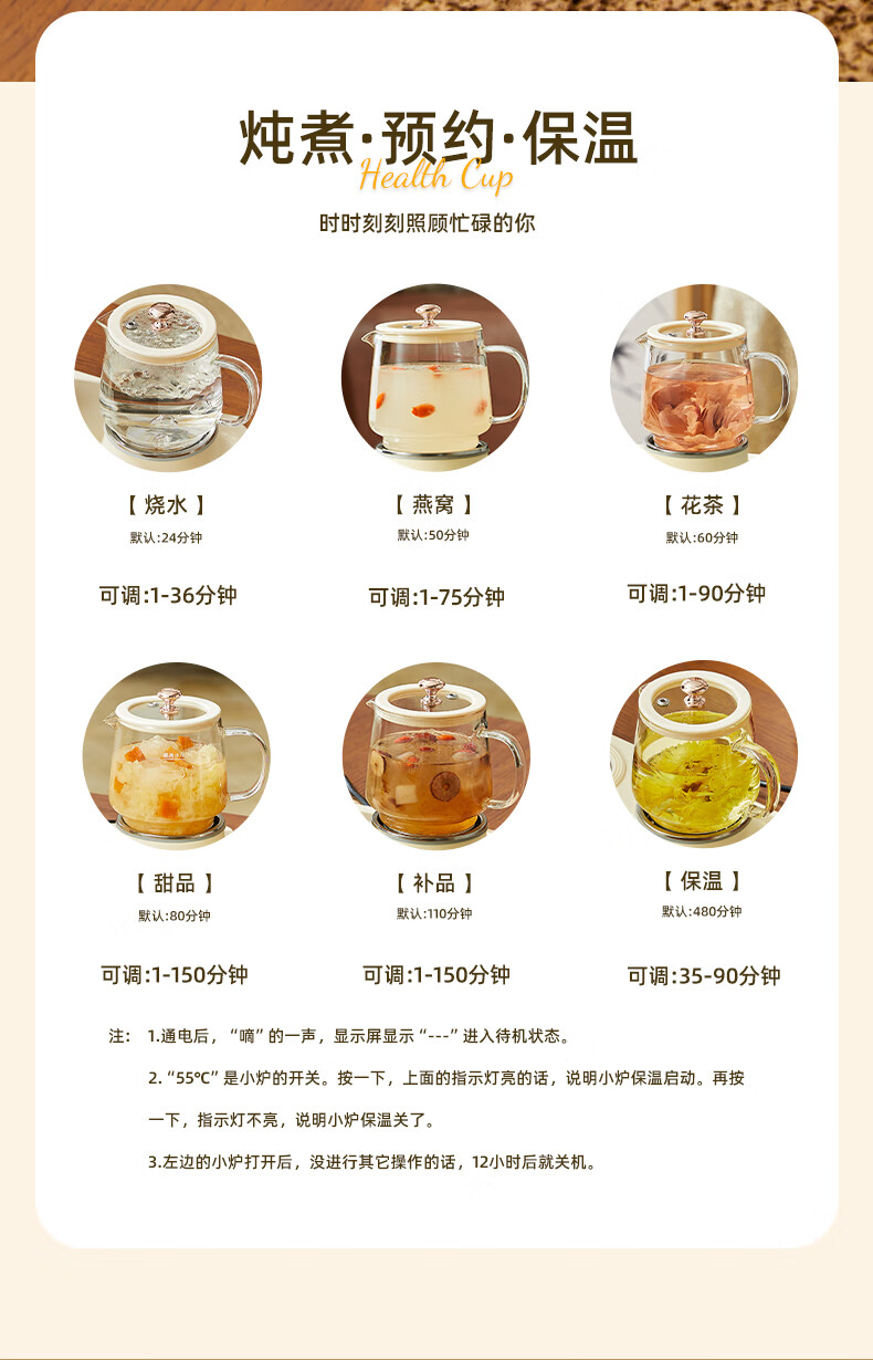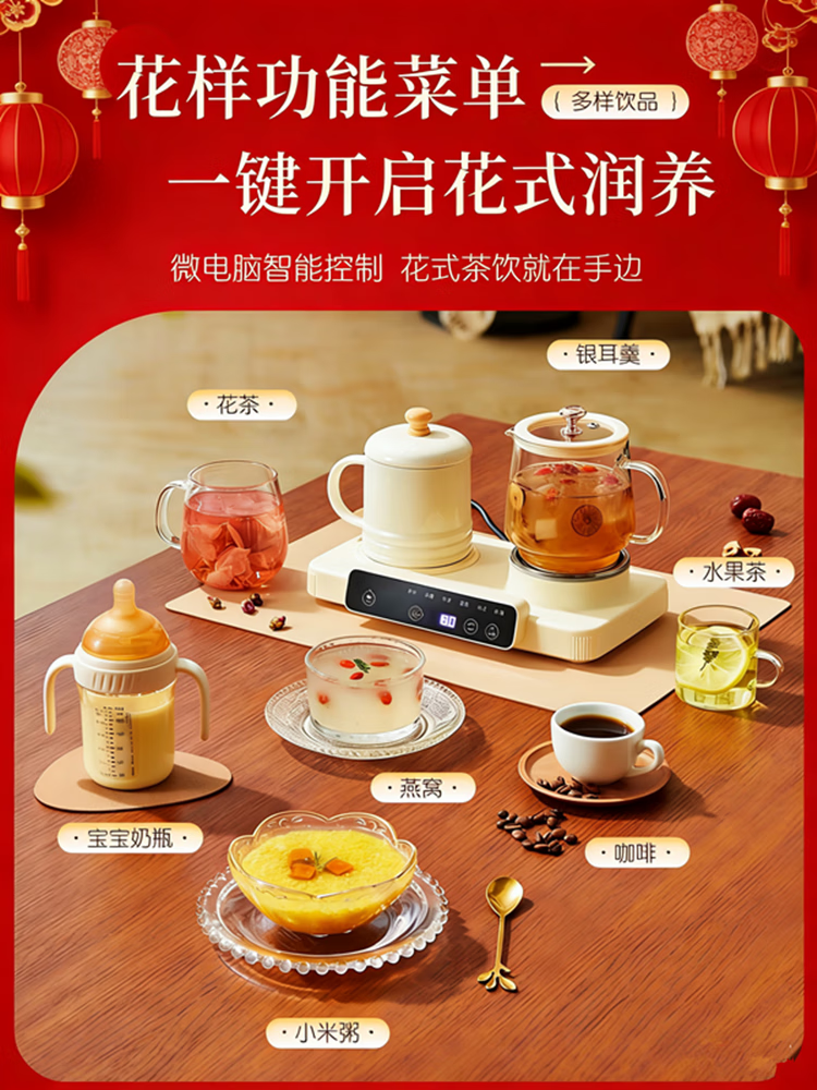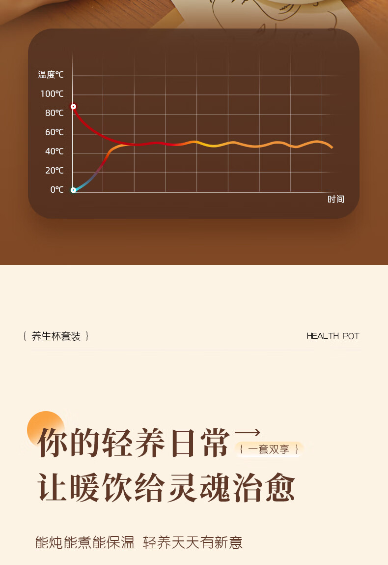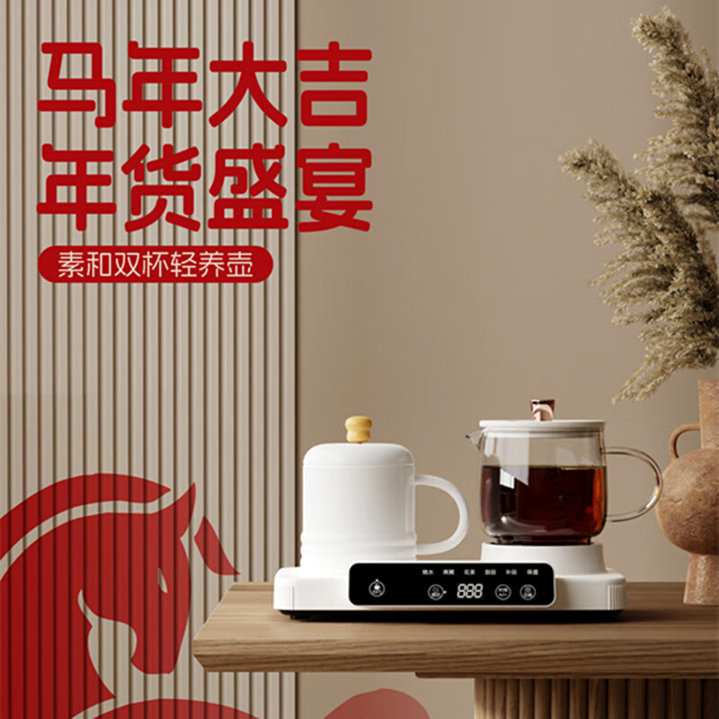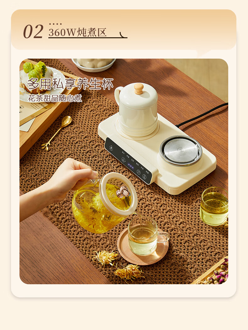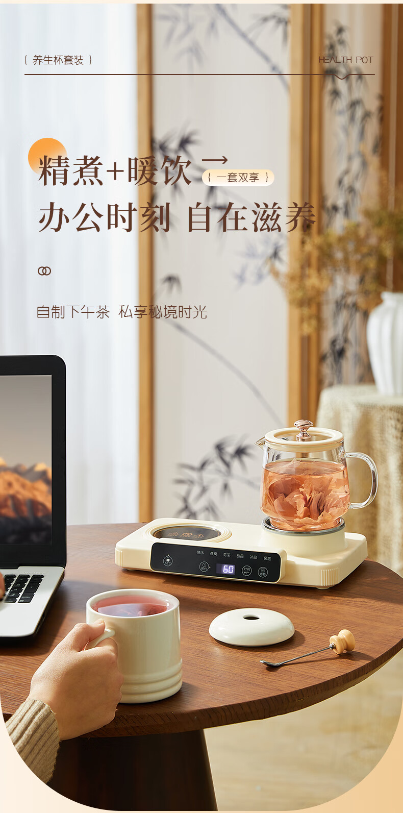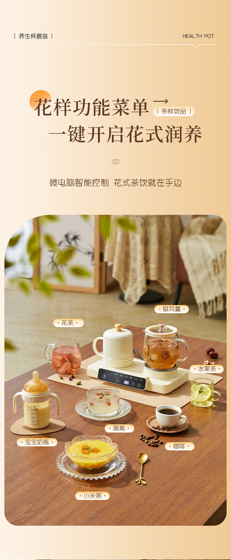 双底座养生壶炖煮二合一,左边保温,右边炖煮同享;;1壶1杯一套装,6大预设功能,15W暖饮,375W;600ML炖煮养生杯+400ML恒温杯二合一;;分体式养生壶杯壶,清洗方便,提壶即饮;;高硼硅玻璃壶+白瓷饮水杯,高温防干烧自动断电;