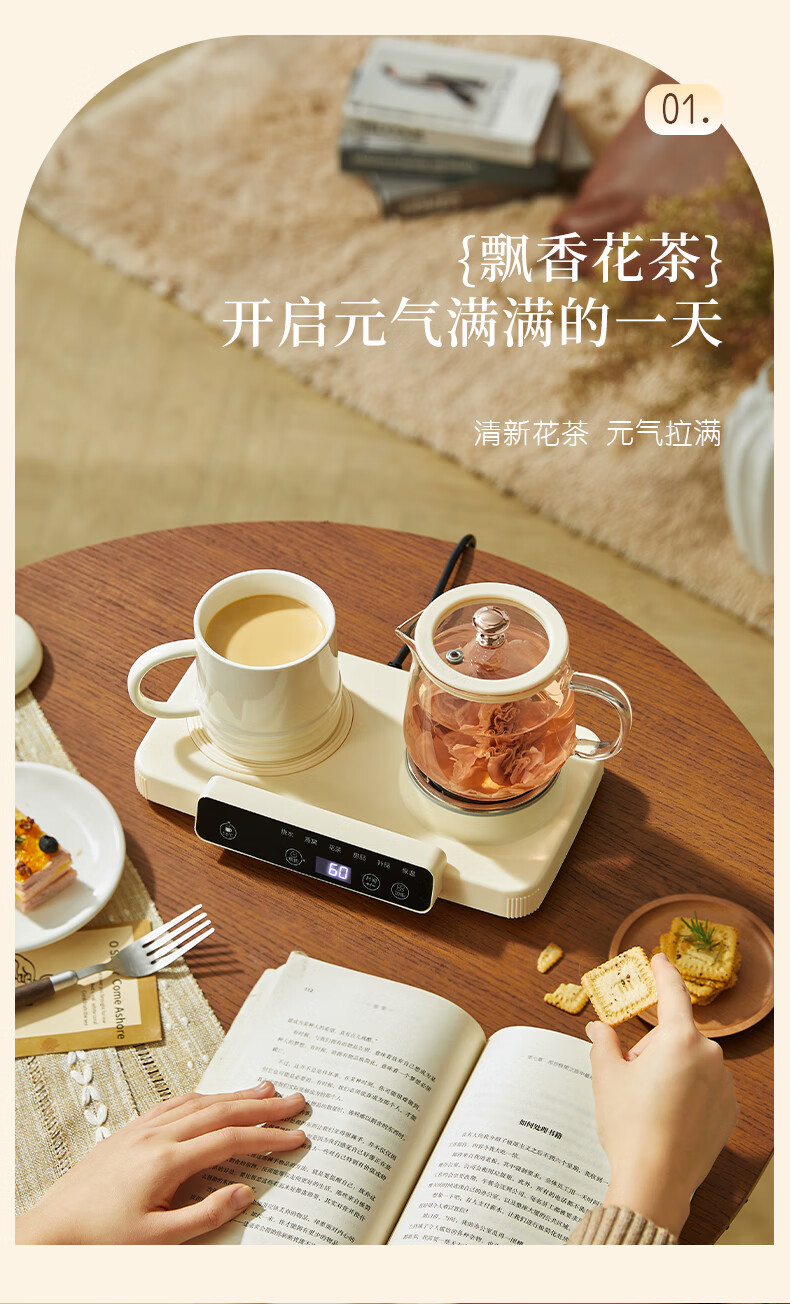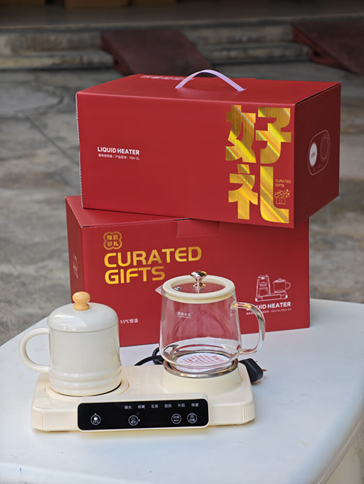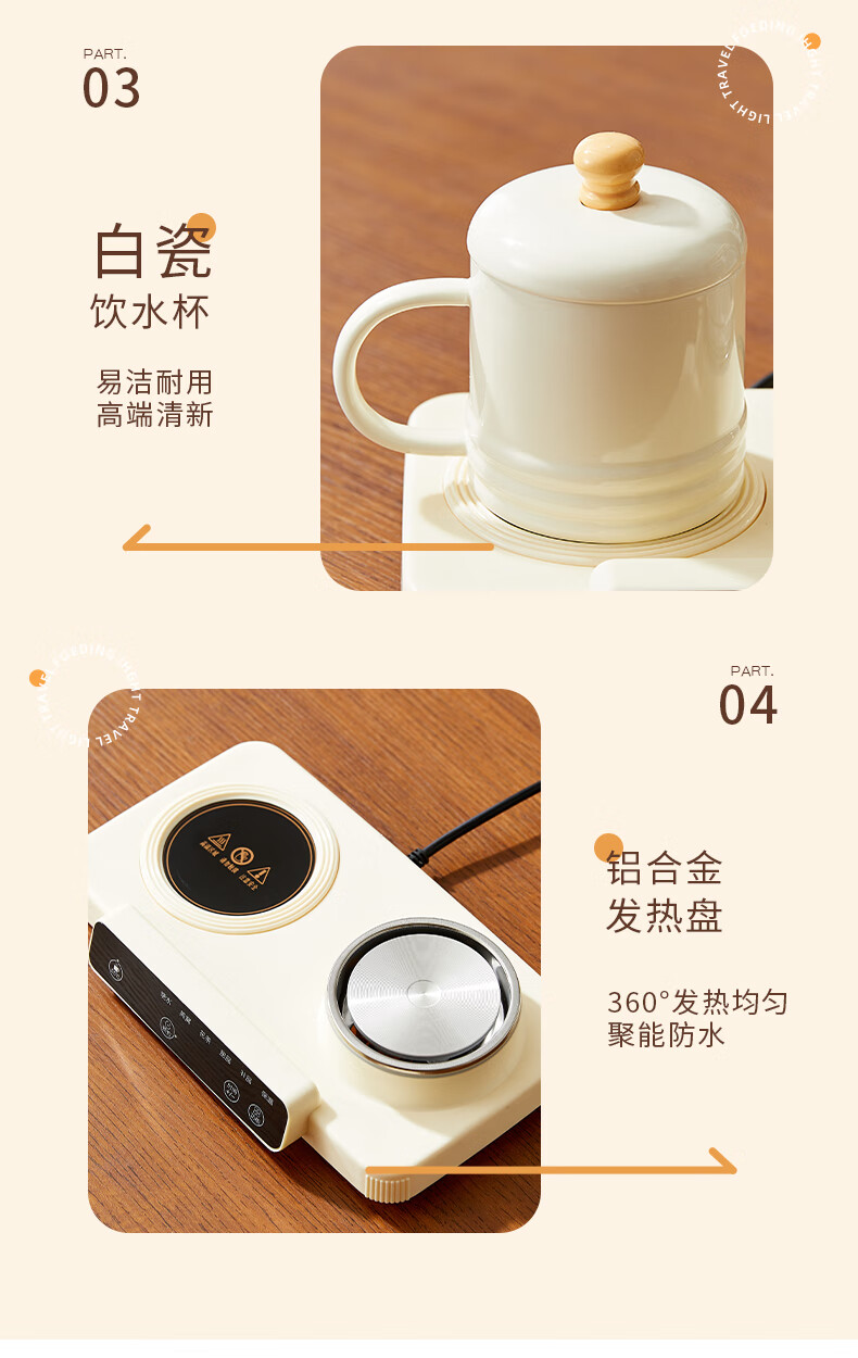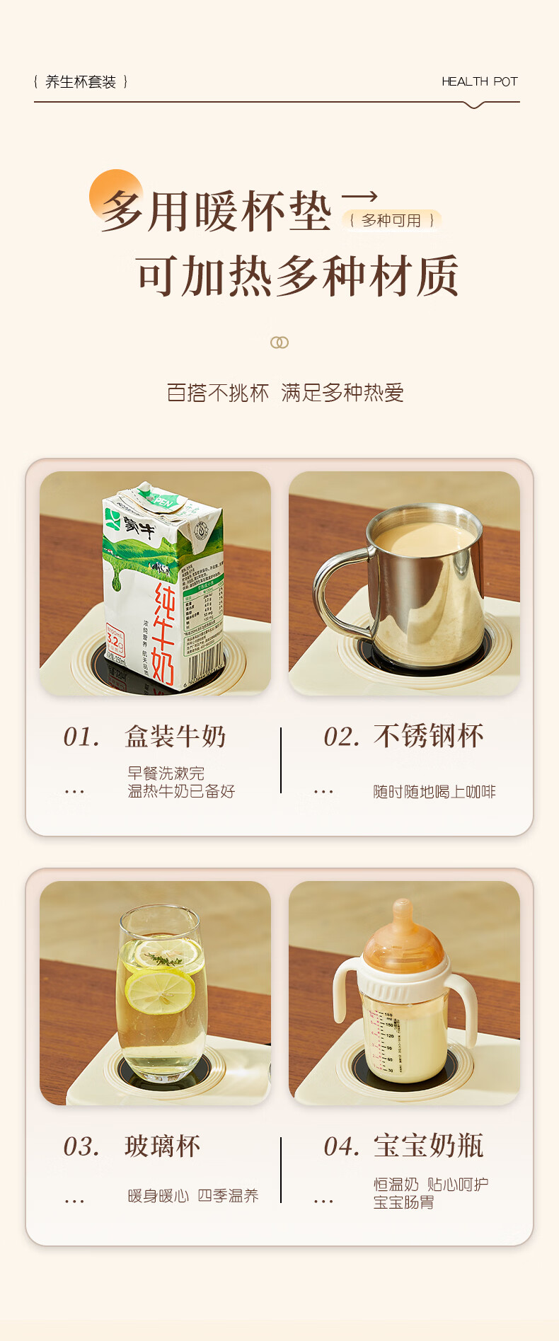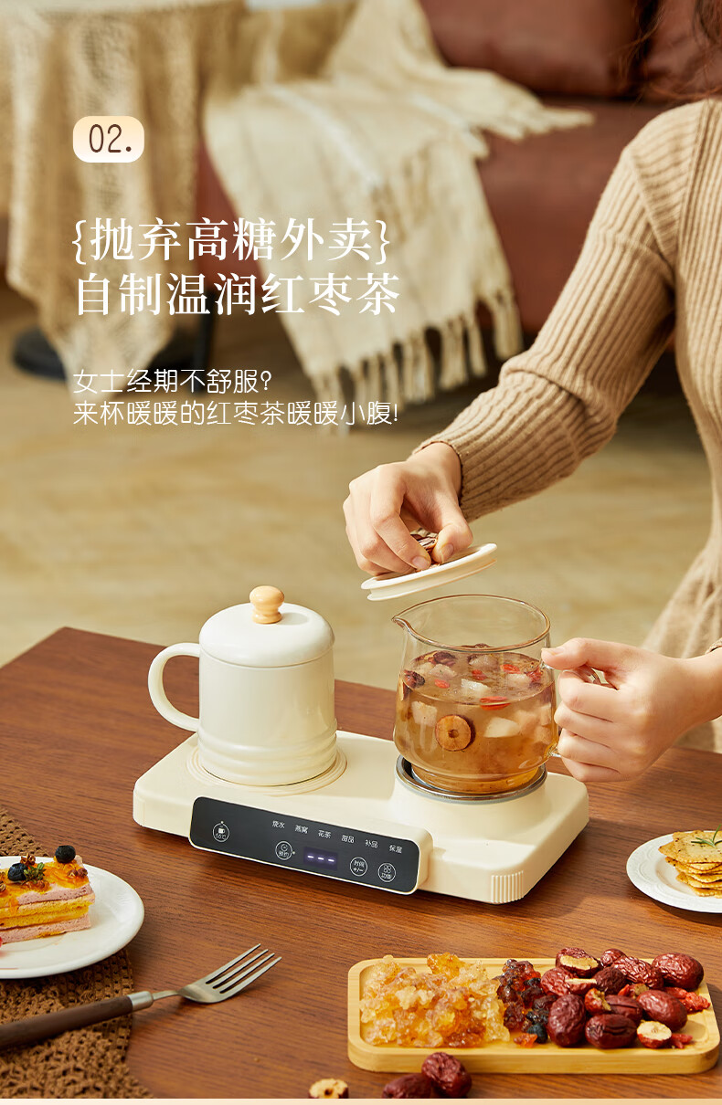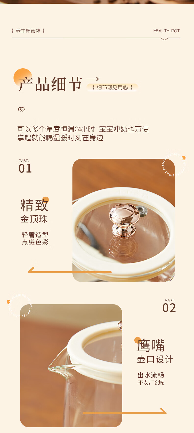 双底座养生壶炖煮二合一,左边保温,右边炖煮同享;;1壶1杯一套装,6大预设功能,15W暖饮,375W;600ML炖煮养生杯+400ML恒温杯二合一;;分体式养生壶杯壶,清洗方便,提壶即饮;;高硼硅玻璃壶+白瓷饮水杯,高温防干烧自动断电;