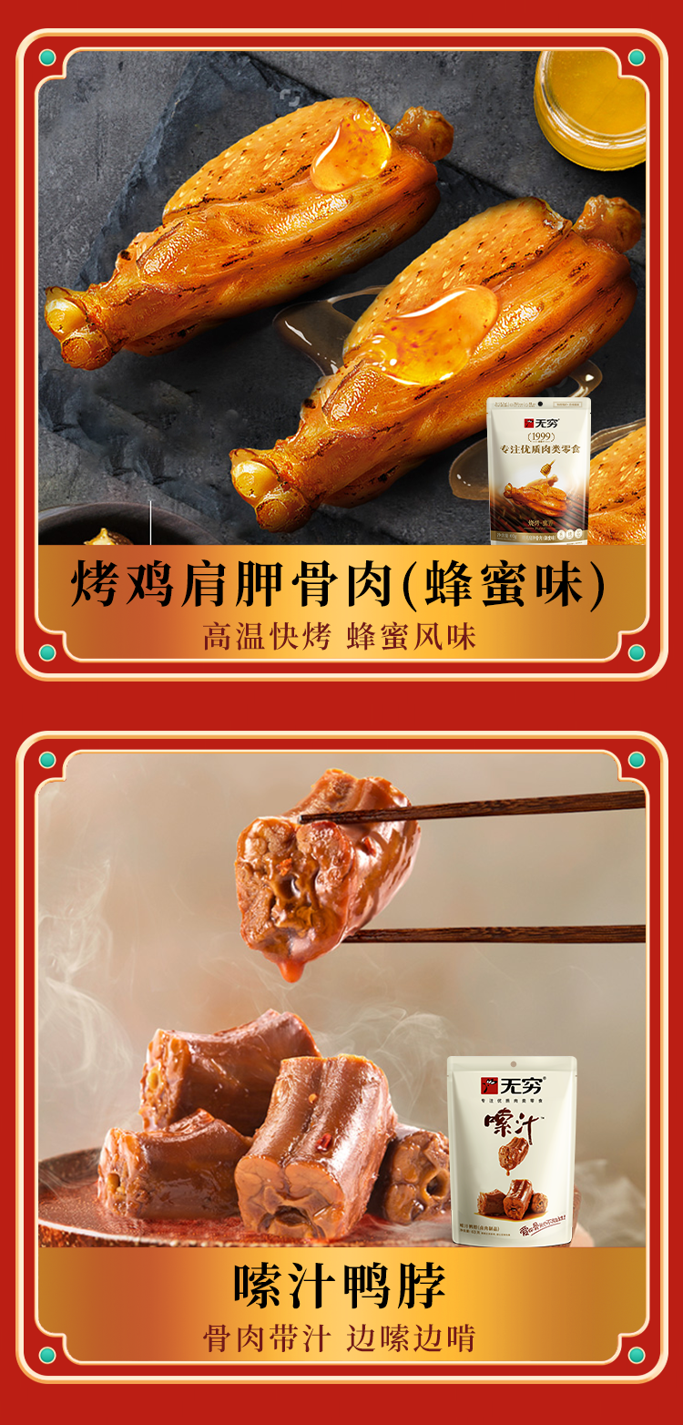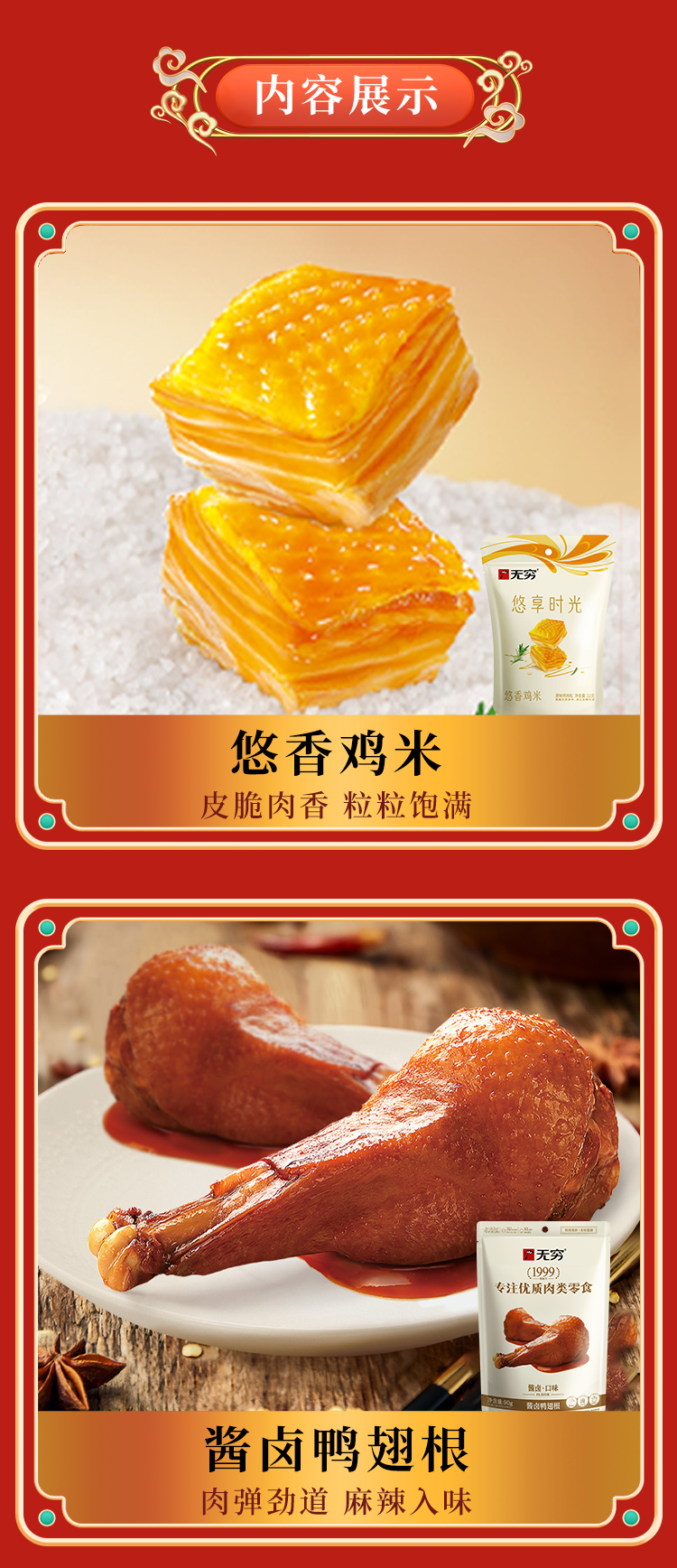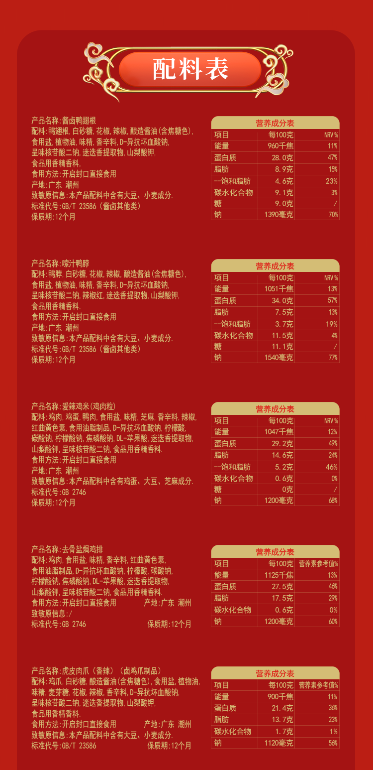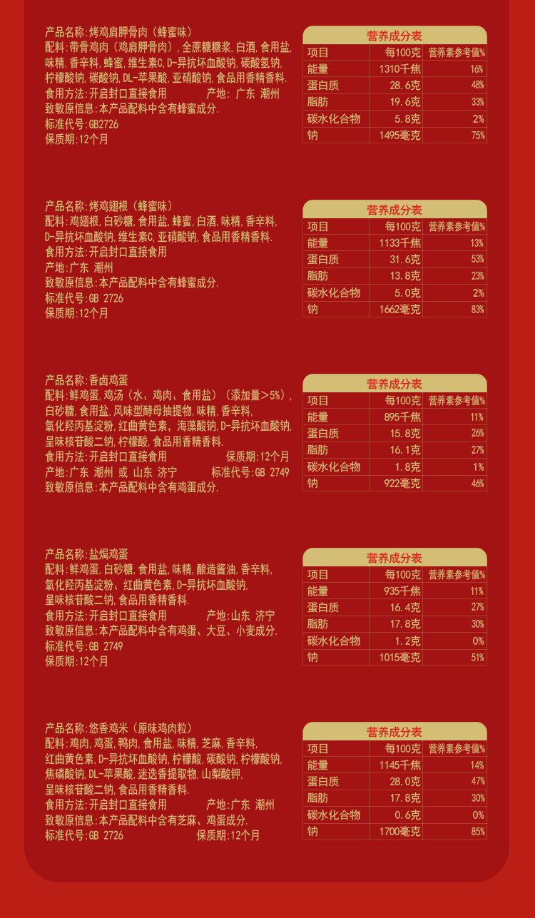 配置清单:486g盐焗鸡蛋(铝膜) 50g去骨盐焗鸡排(原味) 60g爱辣鸡米(鸡肉粒) 120g香卤鸡蛋 63g嗦汁鸭脖 22g悠香鸡米 90g酱卤鸭翅根 105g虎皮凤爪( 香辣味) 60g烤鸡肩胛骨肉(蜂蜜味) (60+40g)烤鸡翅根(蜂蜜味)