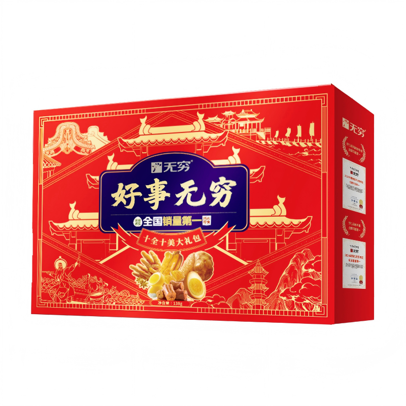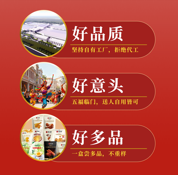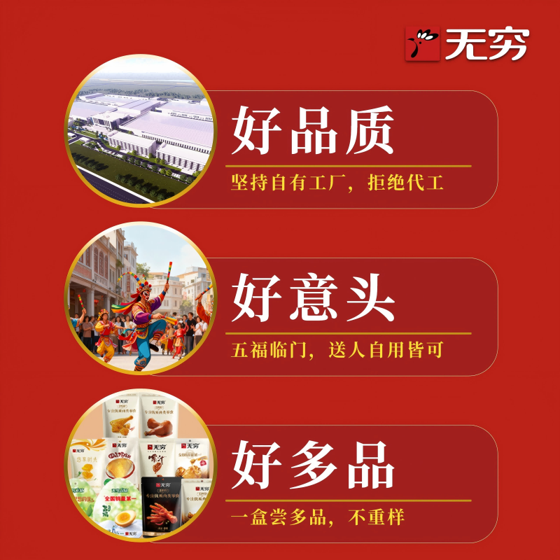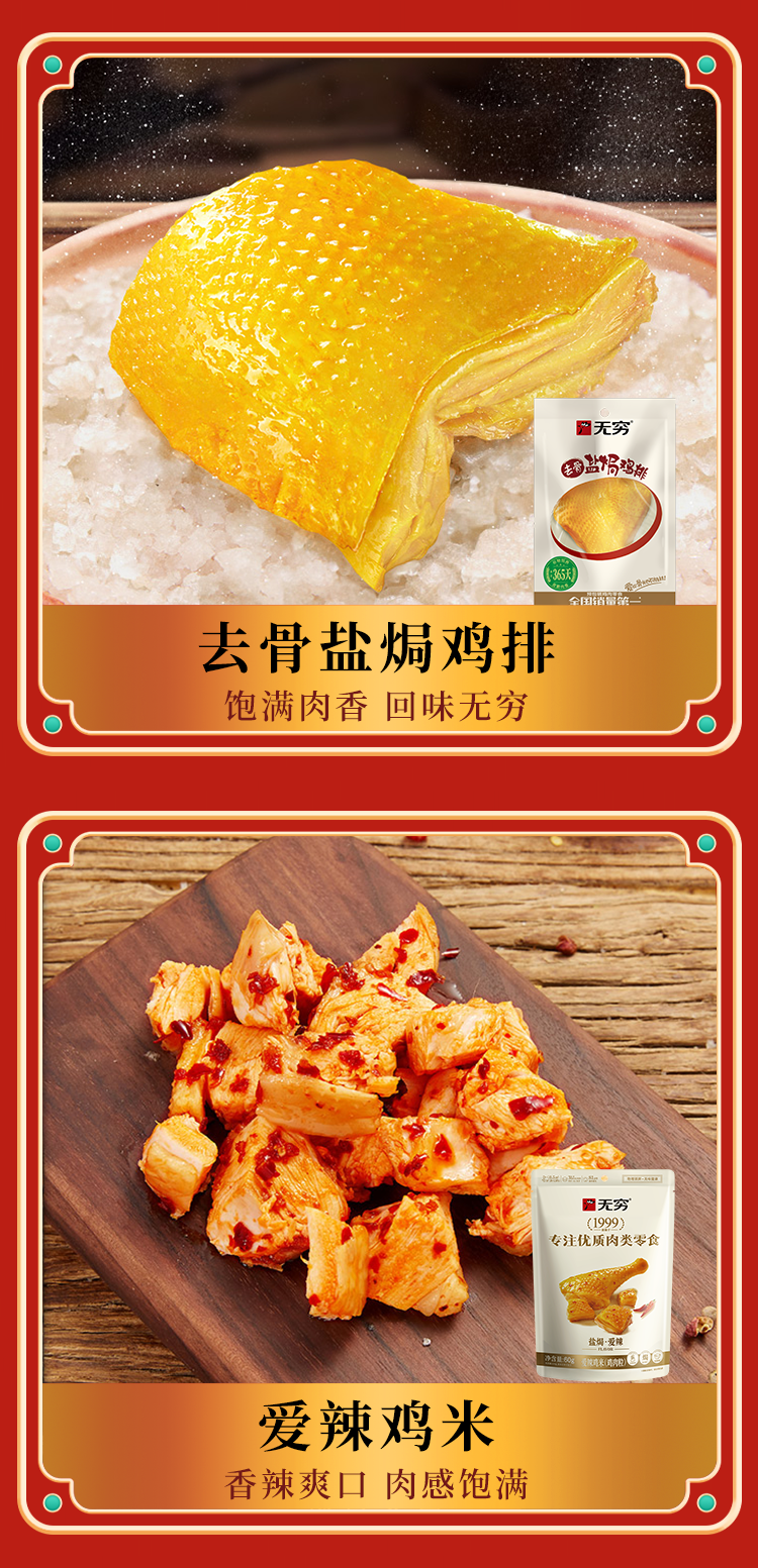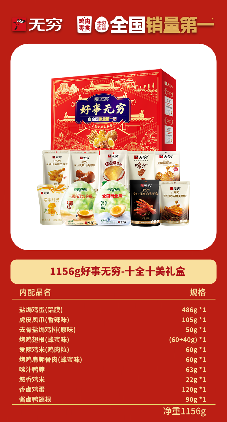 配置清单:486g盐焗鸡蛋(铝膜) 50g去骨盐焗鸡排(原味) 60g爱辣鸡米(鸡肉粒) 120g香卤鸡蛋 63g嗦汁鸭脖 22g悠香鸡米 90g酱卤鸭翅根 105g虎皮凤爪( 香辣味) 60g烤鸡肩胛骨肉(蜂蜜味) (60+40g)烤鸡翅根(蜂蜜味)