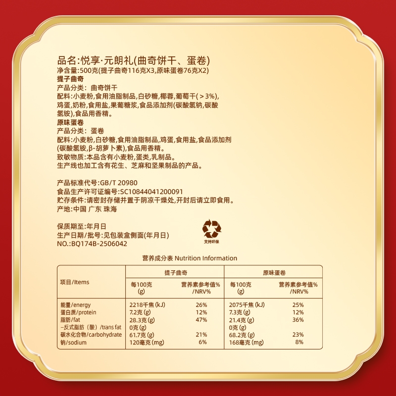配置清单:76g原味蛋卷*2 116g提子曲奇*3