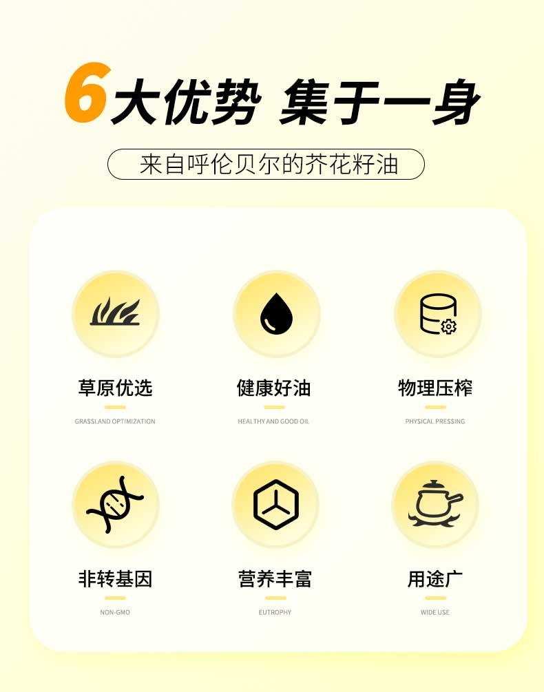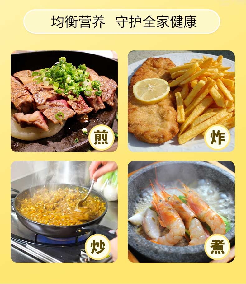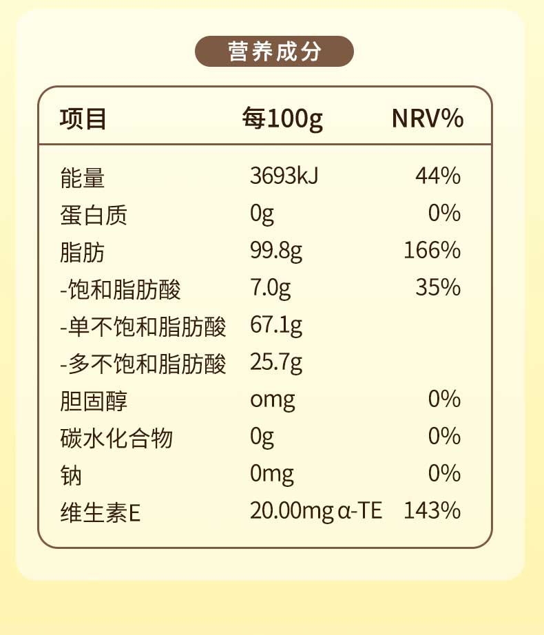 不饱和脂肪酸92.8% ;营养比例1:2.2 含有天然维生素E;可 清蒸 油炸 快炒 凉拌 真正实现一油多用