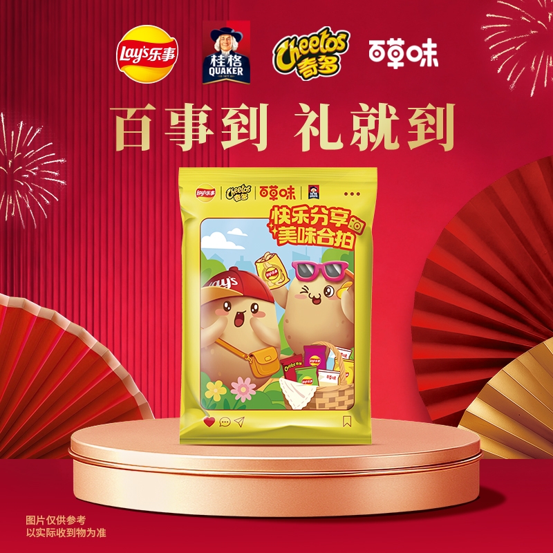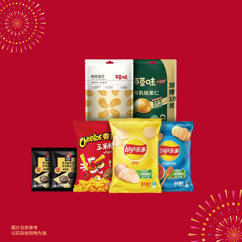 配置清单:1 X 乐事经典原味40克 1 X 乐事意大利香浓红烩味40克 1 X 奇多日式牛排味50克 1 X 桂格黑芝麻黑米食养燕麦片30克 1 X 桂格黑芝麻黑米食养燕麦片30克 1 X 百草味蟹香蚕豆70克(经典) 1 X 百草味本味甄果有机板栗仁80克 赠品:冰箱贴