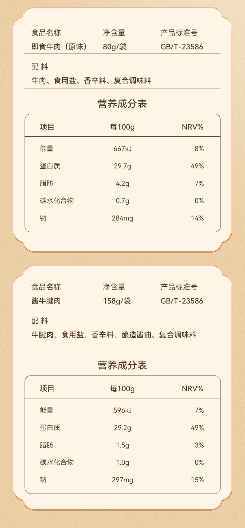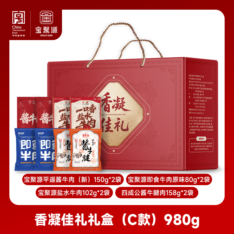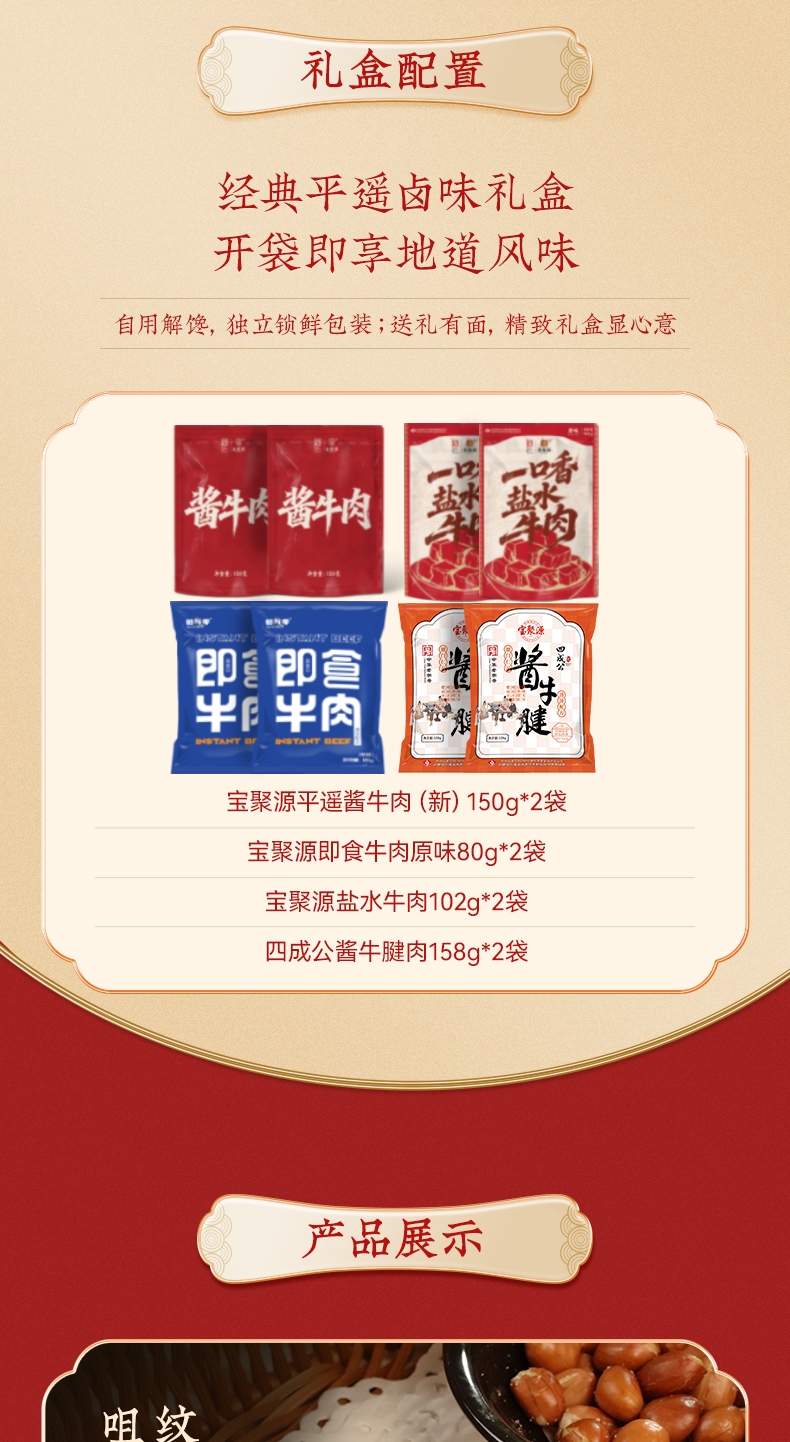 配置清单:宝聚源平遥酱牛肉(新)150g*1袋 宝聚源平遥酱牛肉(新)150g*1袋 宝聚源即食牛肉原味80g*1袋 宝聚源即食牛肉原味80g*1袋 宝聚源盐水牛肉102g*1袋 宝聚源盐水牛肉102g*1袋 四成公酱牛腱肉158g*1袋 四成公酱牛腱肉158g*1袋