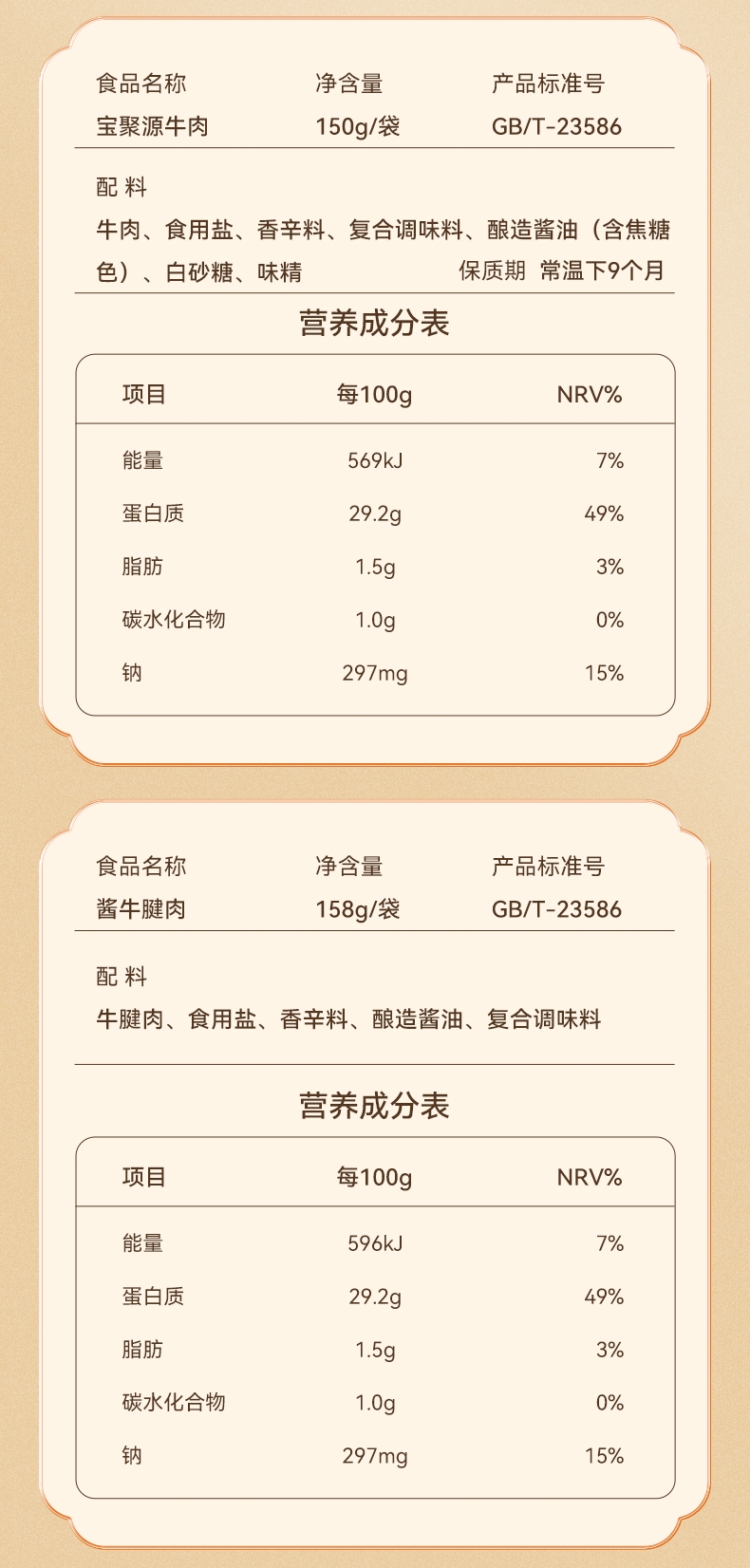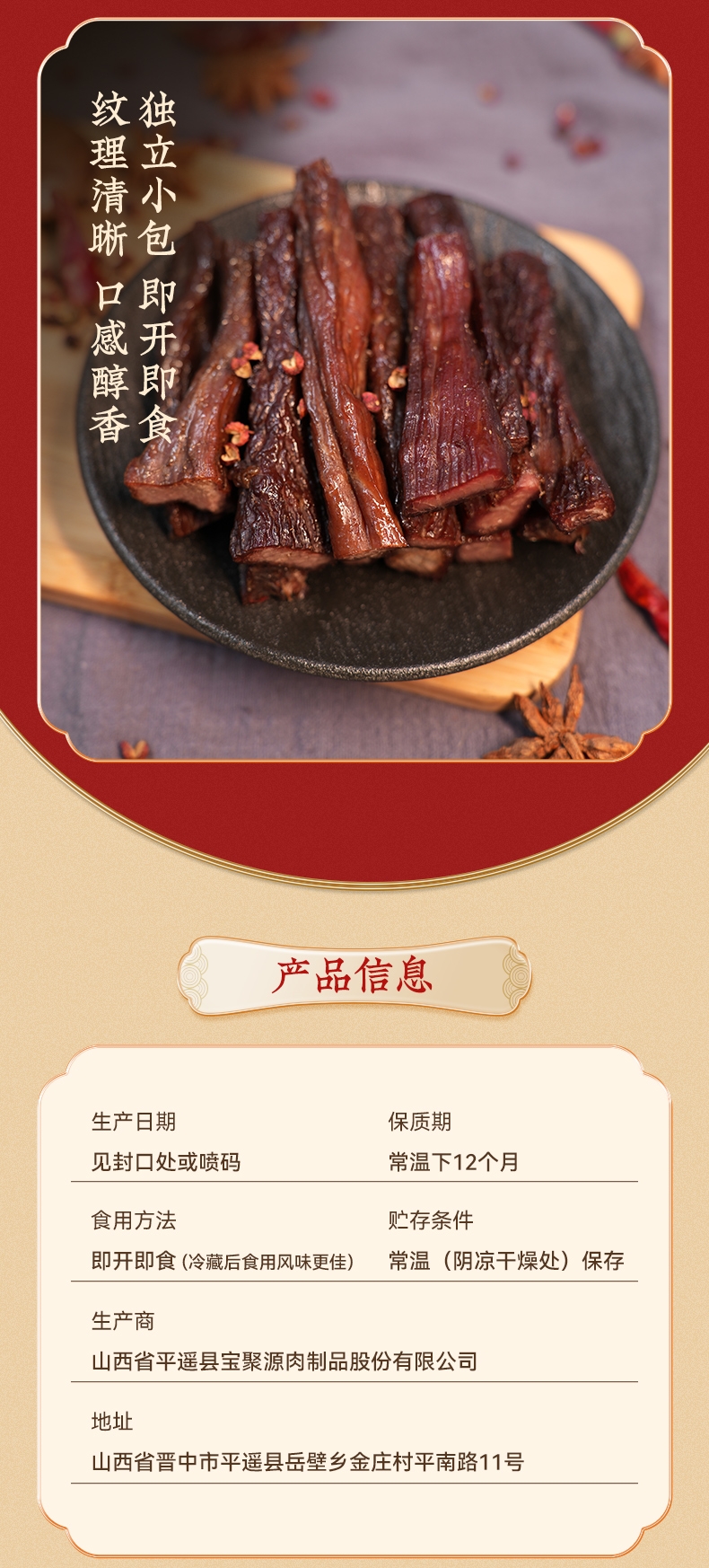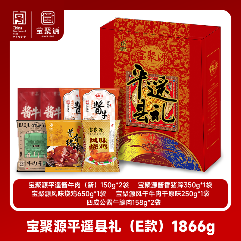 配置清单:宝聚源平遥酱牛肉(新)150g*1袋 宝聚源平遥酱牛肉(新)150g*1袋 宝聚源四成公酱牛腱肉158g*1袋 宝聚源四成公酱牛腱肉158g*1袋 宝聚源风干牛肉干原味250g*1袋 宝聚源酱香猪蹄350g*1袋 宝聚源风味烧鸡650g*1袋