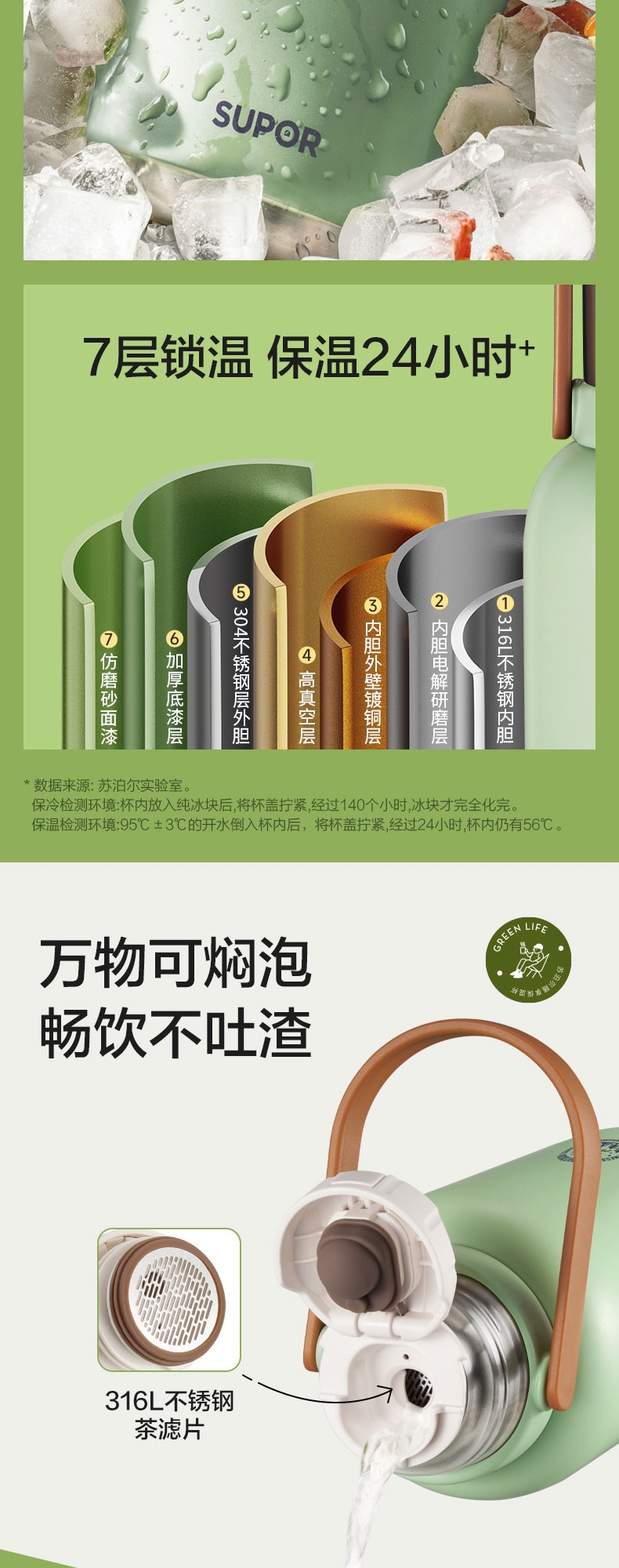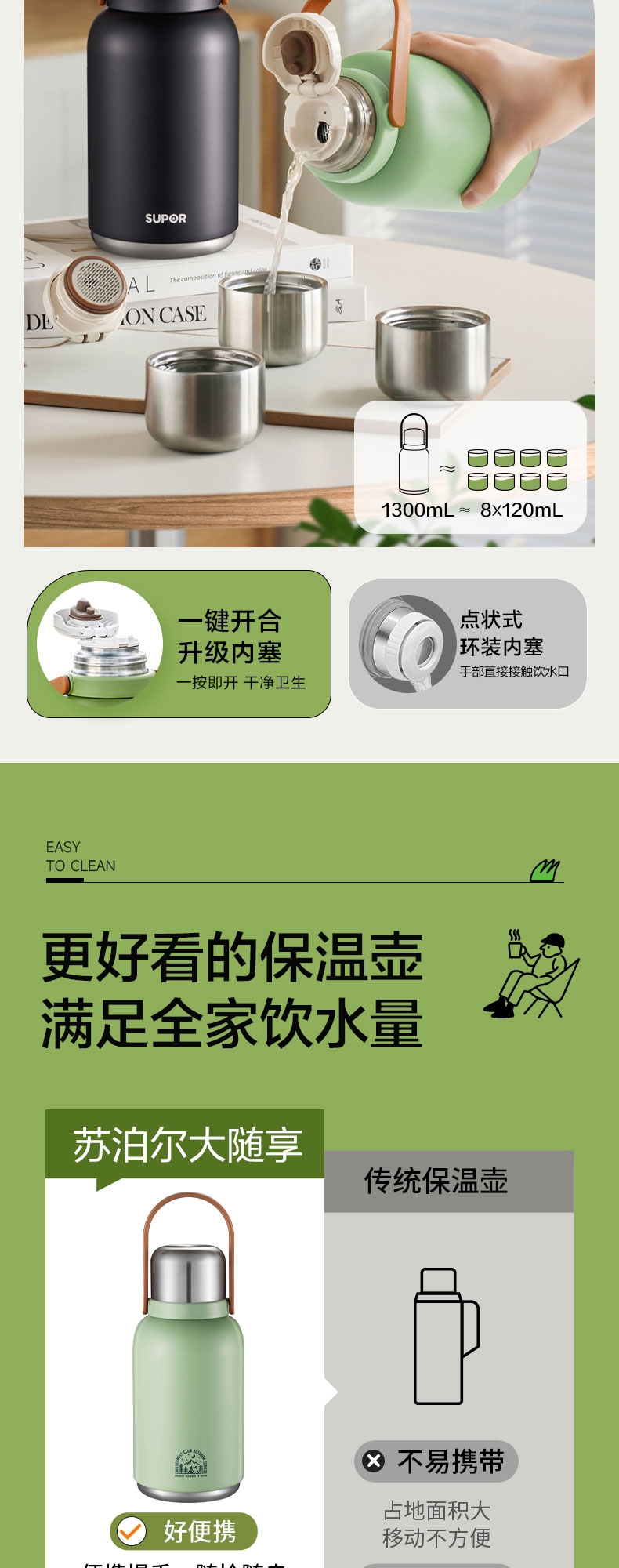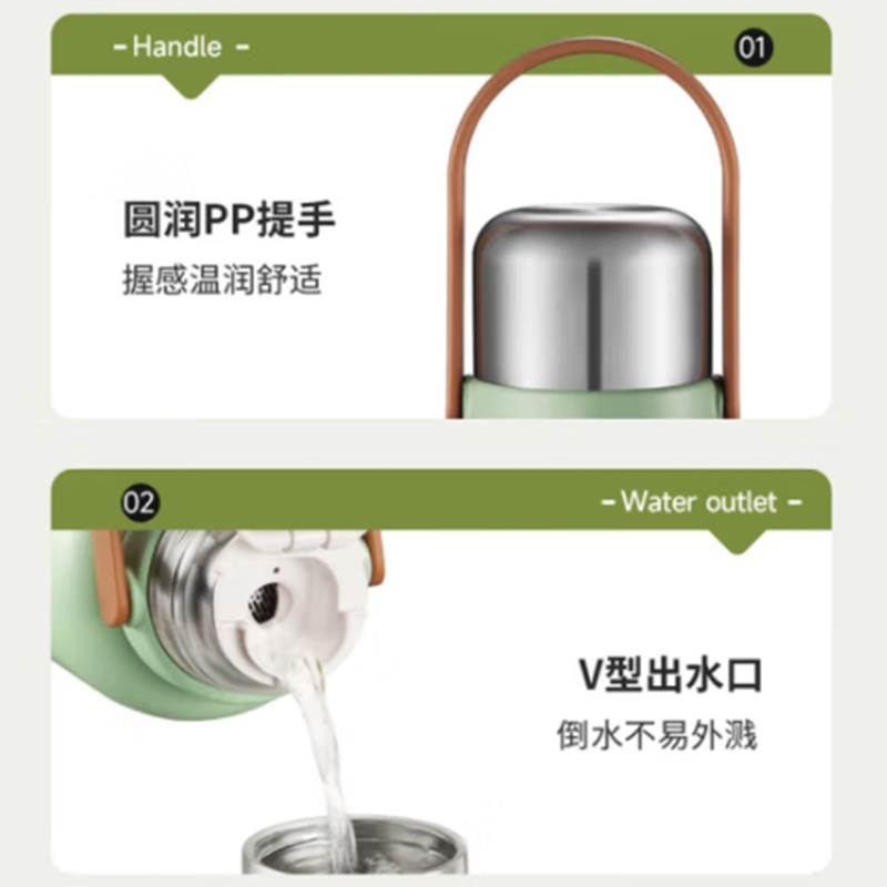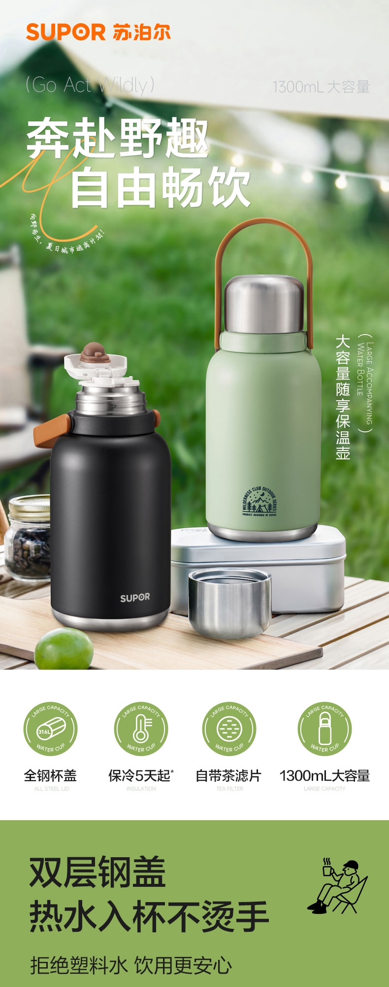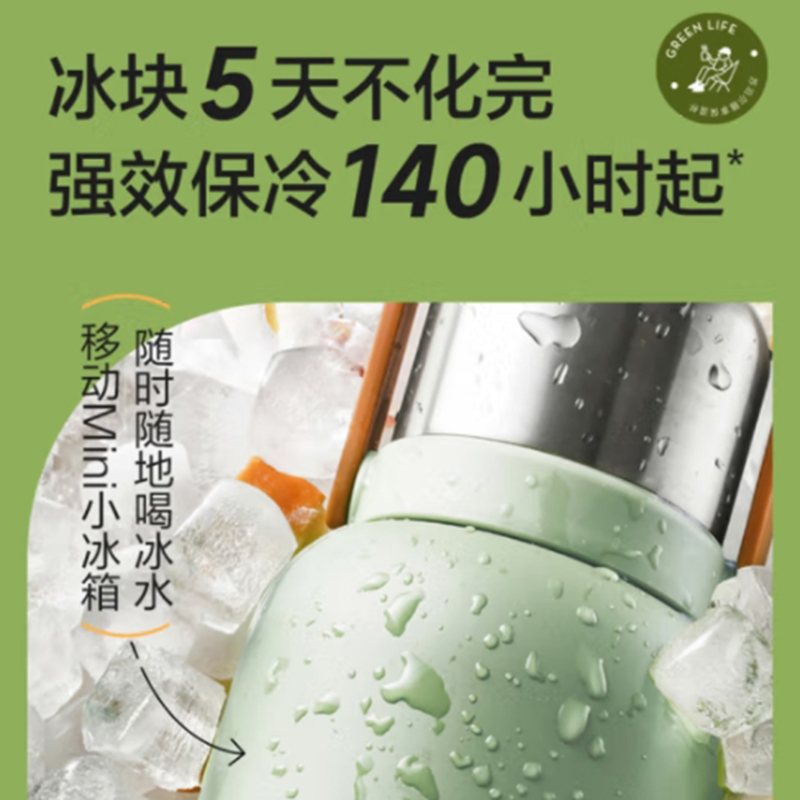 1.3L大容量,旅行、居家好帮手;双层钢盖,热水入杯不烫手,饮用更安心;强效保冷140小时+;保温24小时 杯双用(直饮)