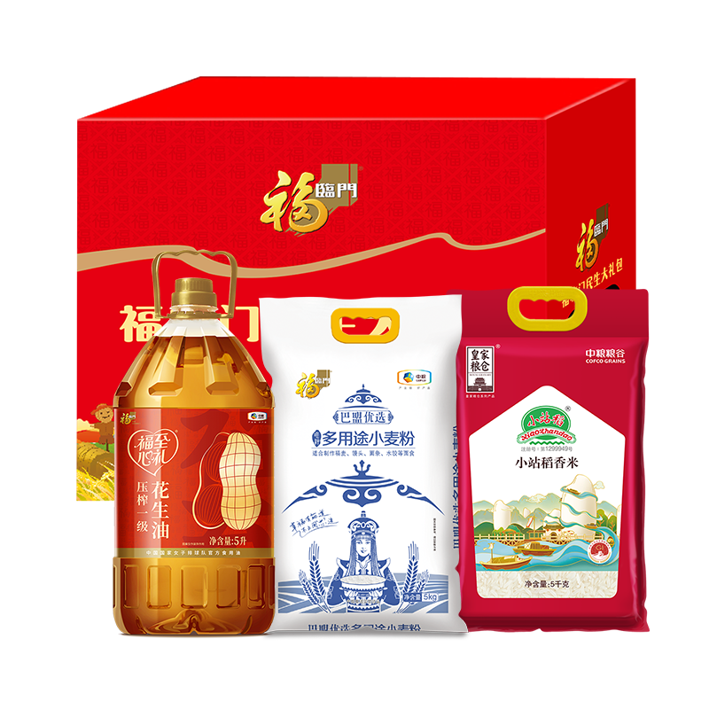 配置清单:净含量:10kg+5L 内配: 中粮皇家粮仓小站稻香米5kg 中粮福临门巴盟优选多用途小麦粉5kg 中粮福临门福至心礼压榨一级花生油5L