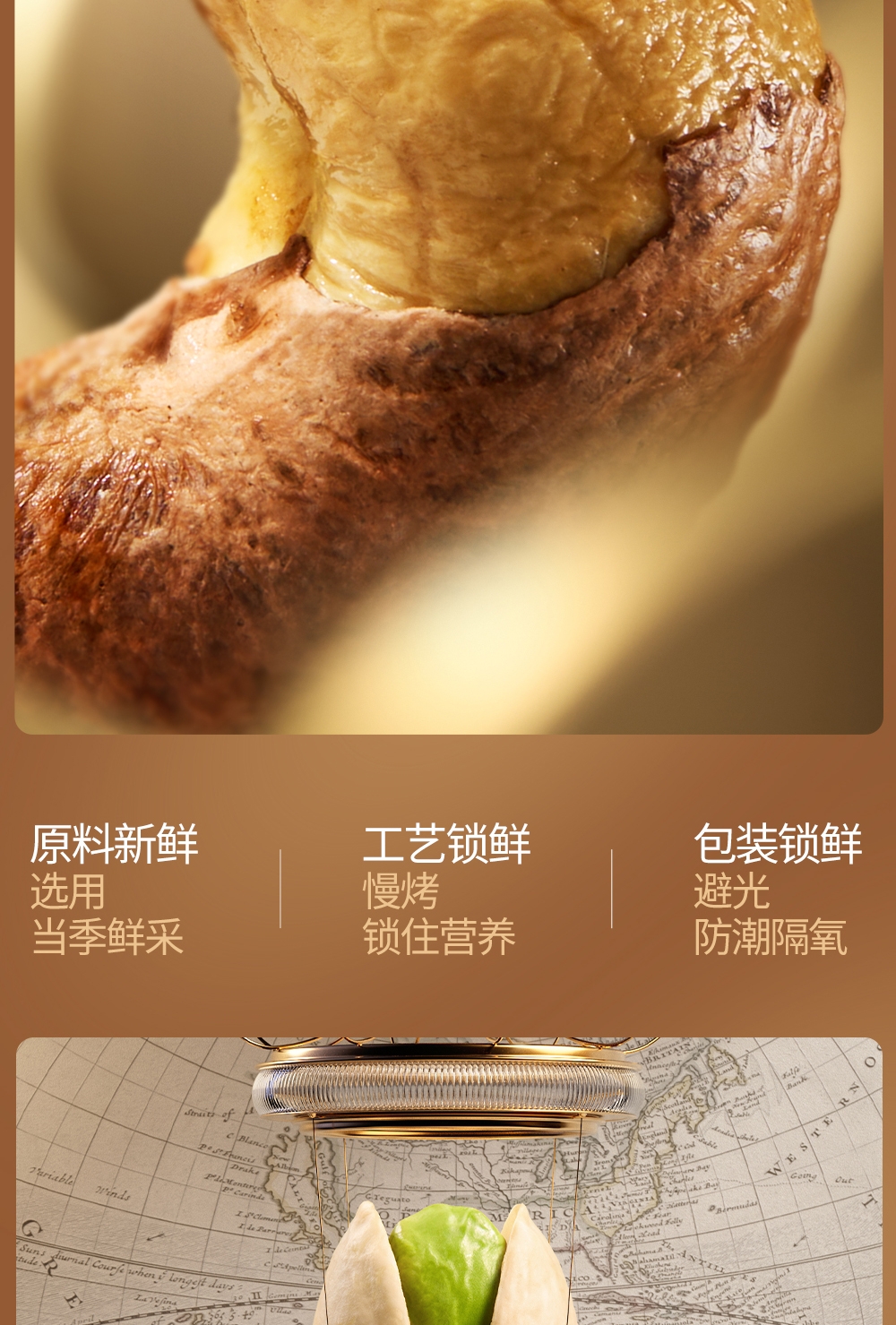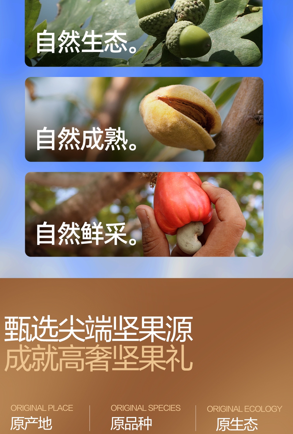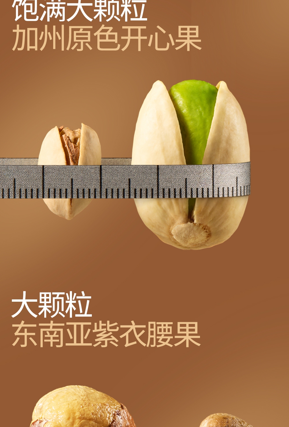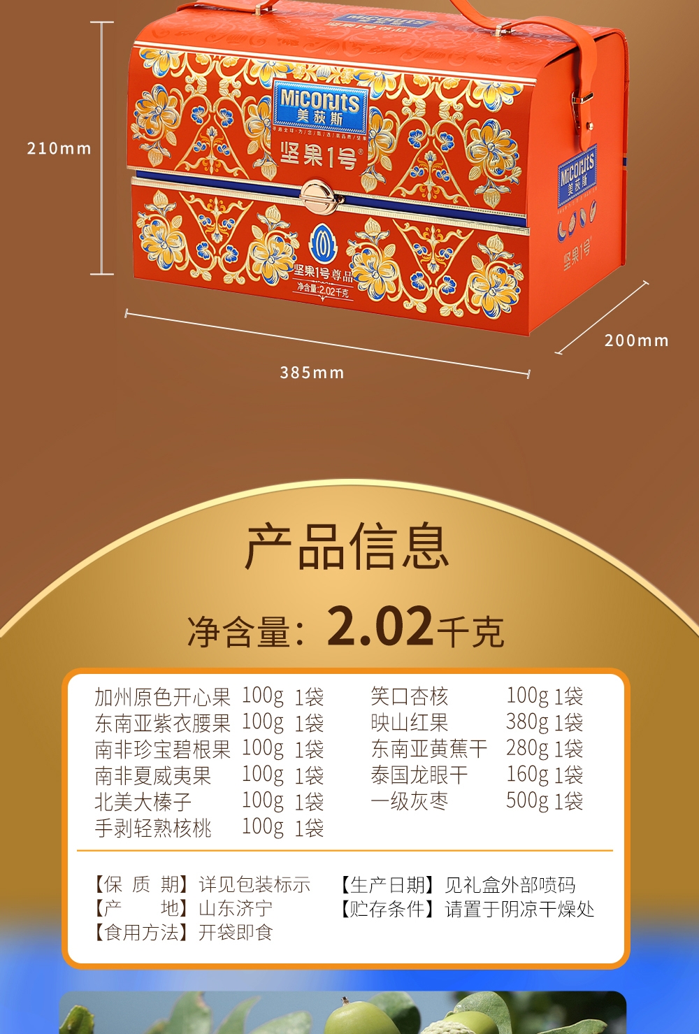 配置清单:加州原色开心果100g 东南亚紫衣腰果100g 南非珍宝碧根果100g 南非夏威夷果100g 北美大榛子100g 手剥轻熟核桃100g 笑口杏核100g 映山红果380g 东南亚黄蕉干280g 泰国龙眼干160g 一级灰枣500g