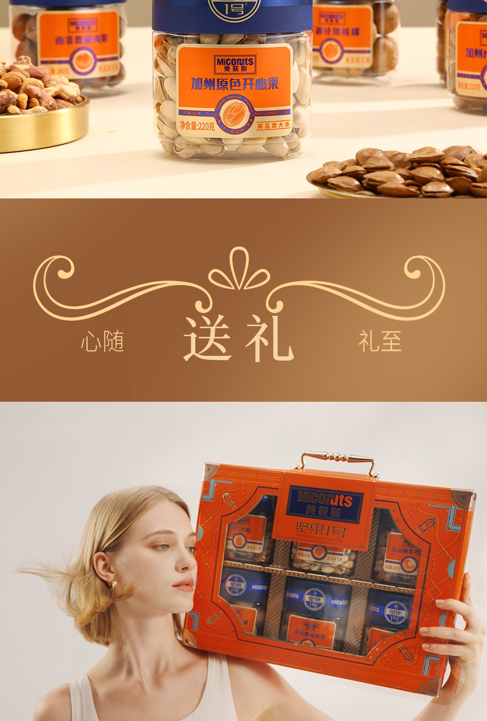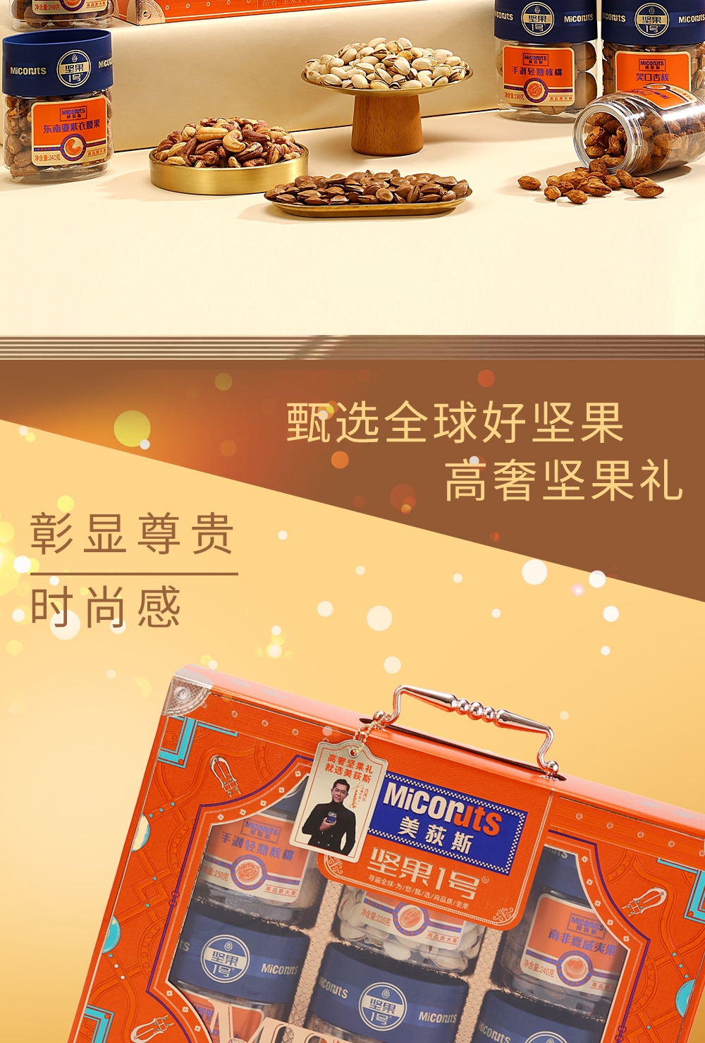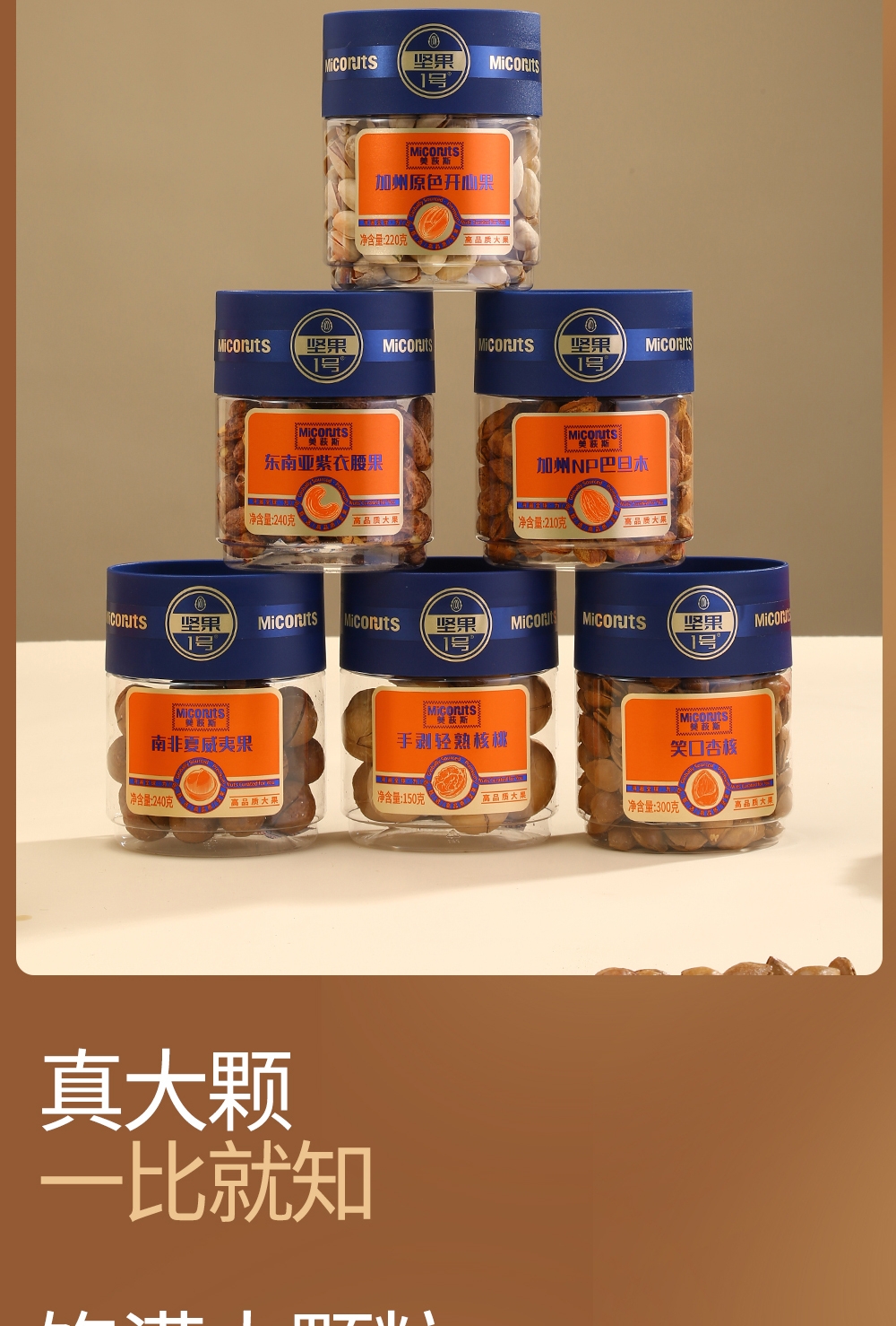 配置清单:加州原色开心果(椭圆罐装)220g 东南亚紫衣腰果(椭圆罐装)240g 加州NP巴旦木(椭圆罐装)210g 手剥轻熟核桃(椭圆罐装)150g 南非夏威夷果(椭圆罐装)240g 笑口杏核(椭圆罐装)300g