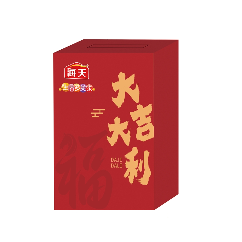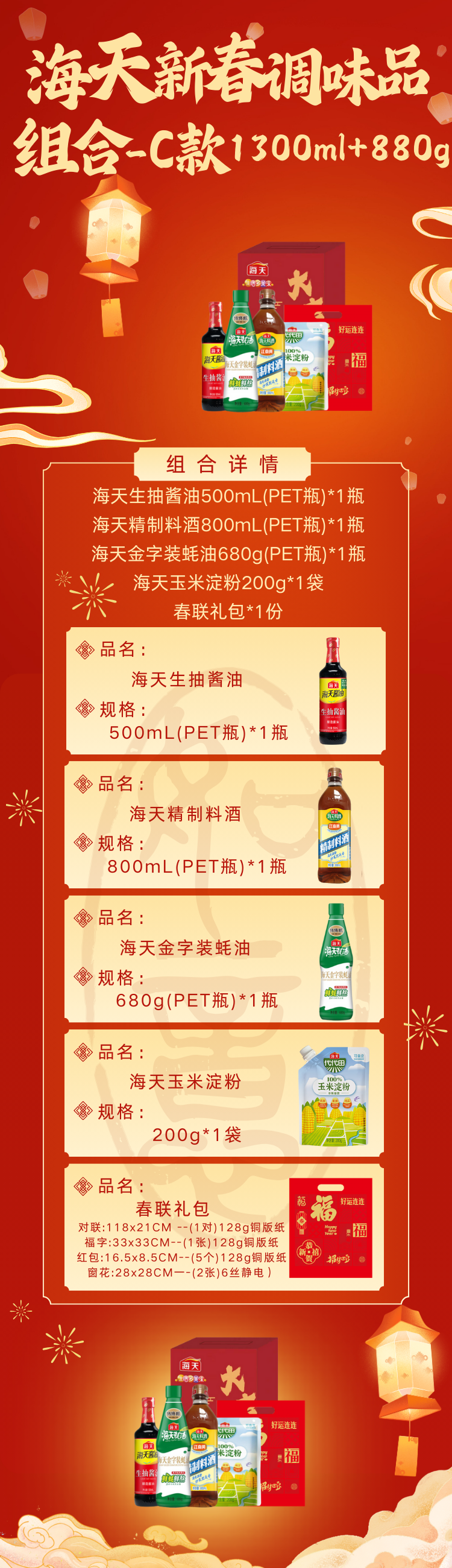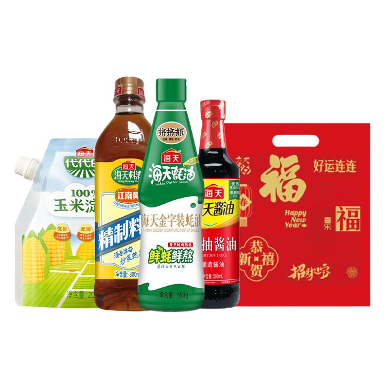 配置:海天生抽酱油500mL(PET瓶)*1瓶 海天精制料酒800mL(PET瓶)*1瓶 海天金字装蚝油680g(PET瓶)*1瓶 海天玉米淀粉200g*1袋 春联礼包*1份 对联:118x21CM --(1对)128g铜版纸 福字:33x33CM--(1张)128g铜版纸 红包:16.5x8.5CM--(5个)128g铜版纸 窗花:28x28CM一-(2张)6丝静电)